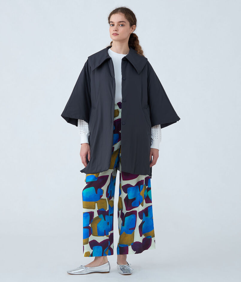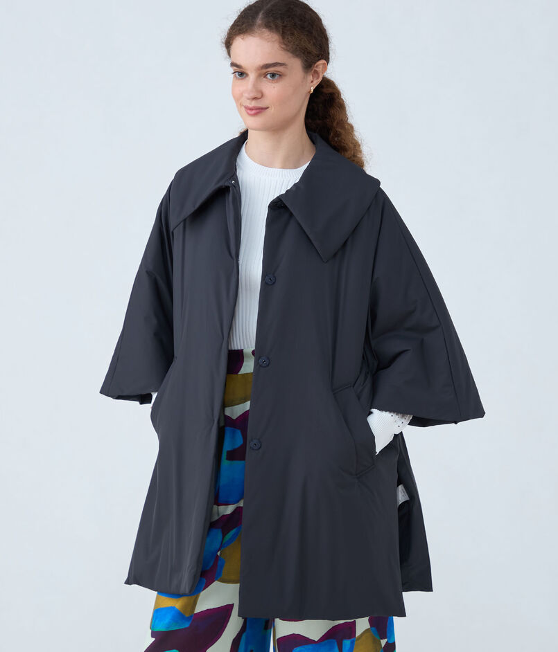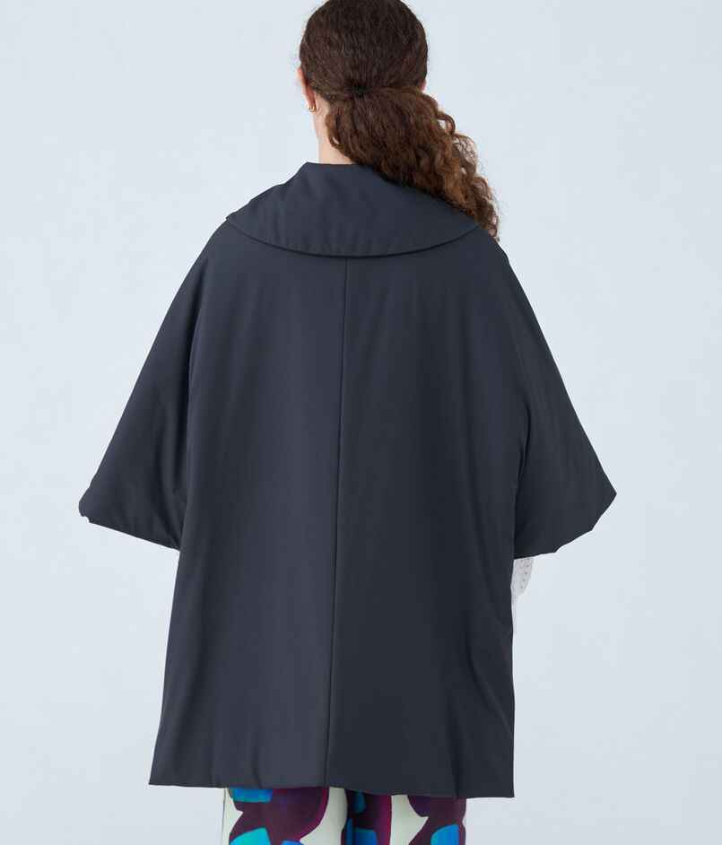 ほど良いツヤ感が魅力の上品な印象のツイル素材を使用したポンチョ。