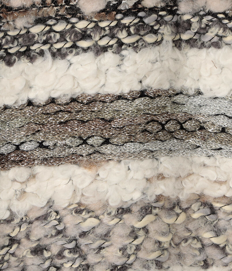 2種類のループヤーンにリリヤーン、フラッグヤーン、モールヤーンといった計5種類のこれ以上ないくらいの太番意匠糸を贅沢に使いざっくりと編み上げられた、インポートならではの生地感が魅力です。