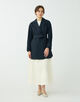 生地のハリを活かした立体的な襟ぐりと美しいAラインシルエットで甘くなりすぎず、凛とした雰囲気で着こなせる一着。