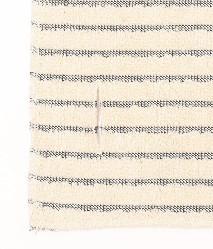 隅に施されたボタンホールでフックなどにハンギングできるのもポイント。