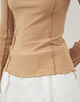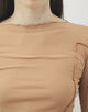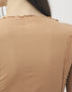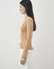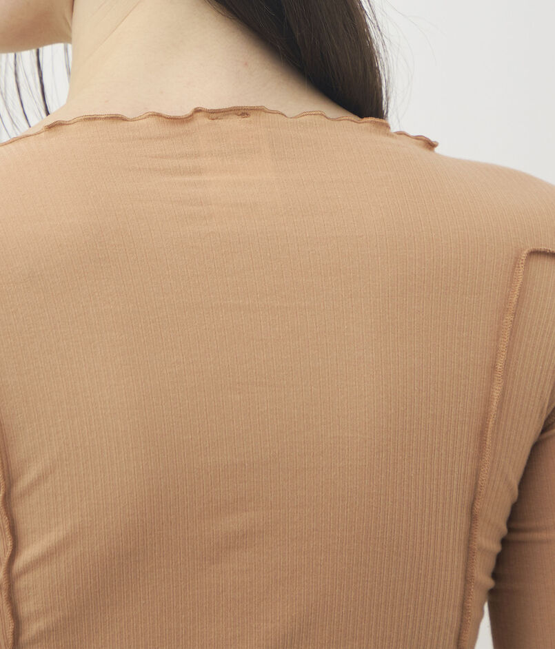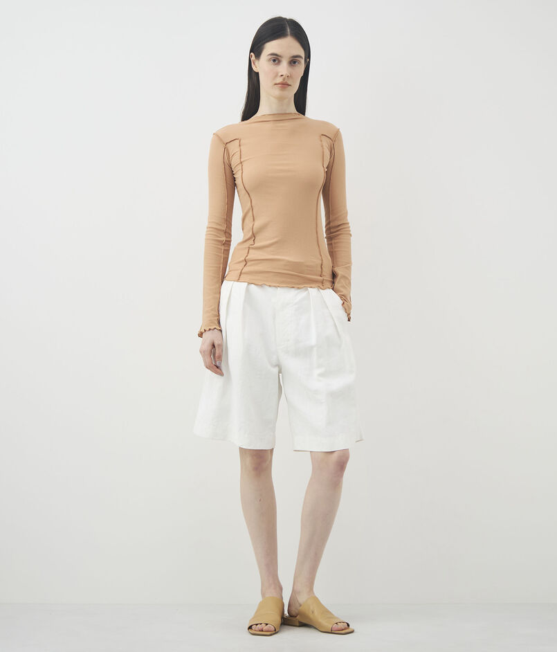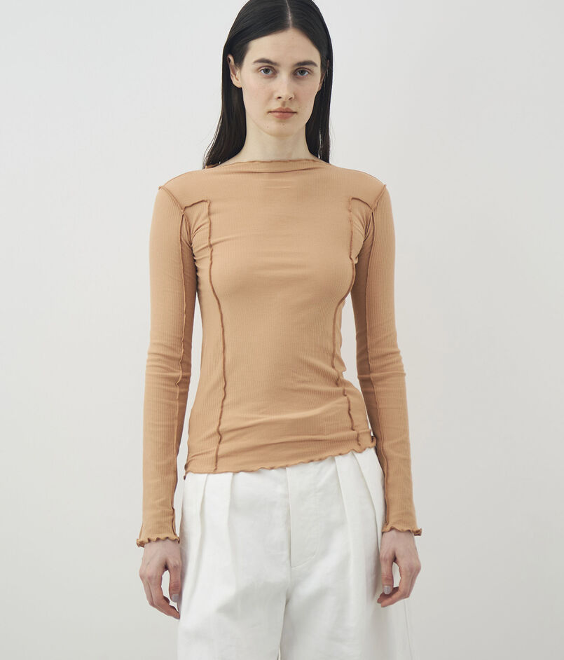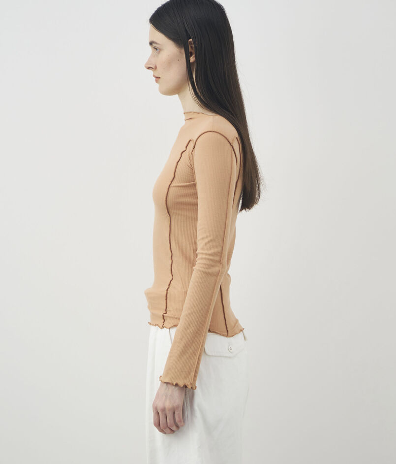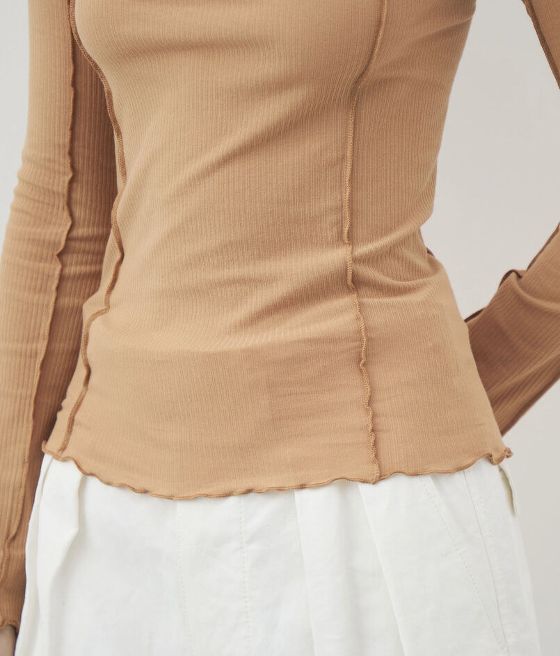 裾から袖までをつなぐように配されたシームデザインと首元のフリルはロックミシンで仕上げられ、ディテールにもこだわったカットソーは、洗練された繊細なムードをまとう一枚。