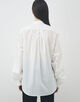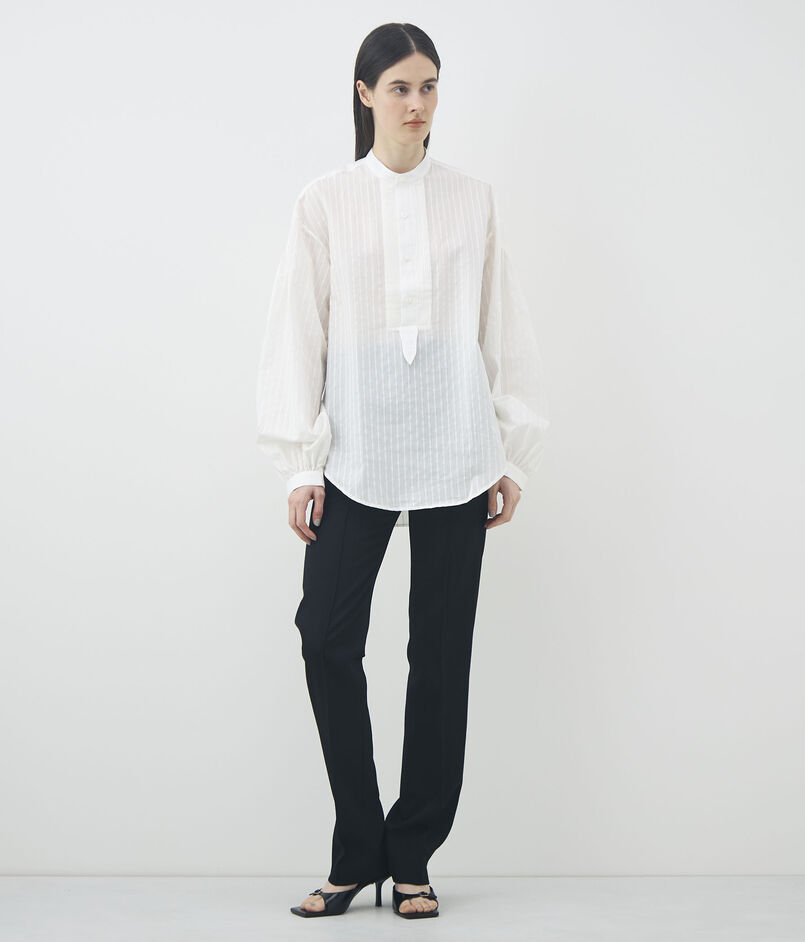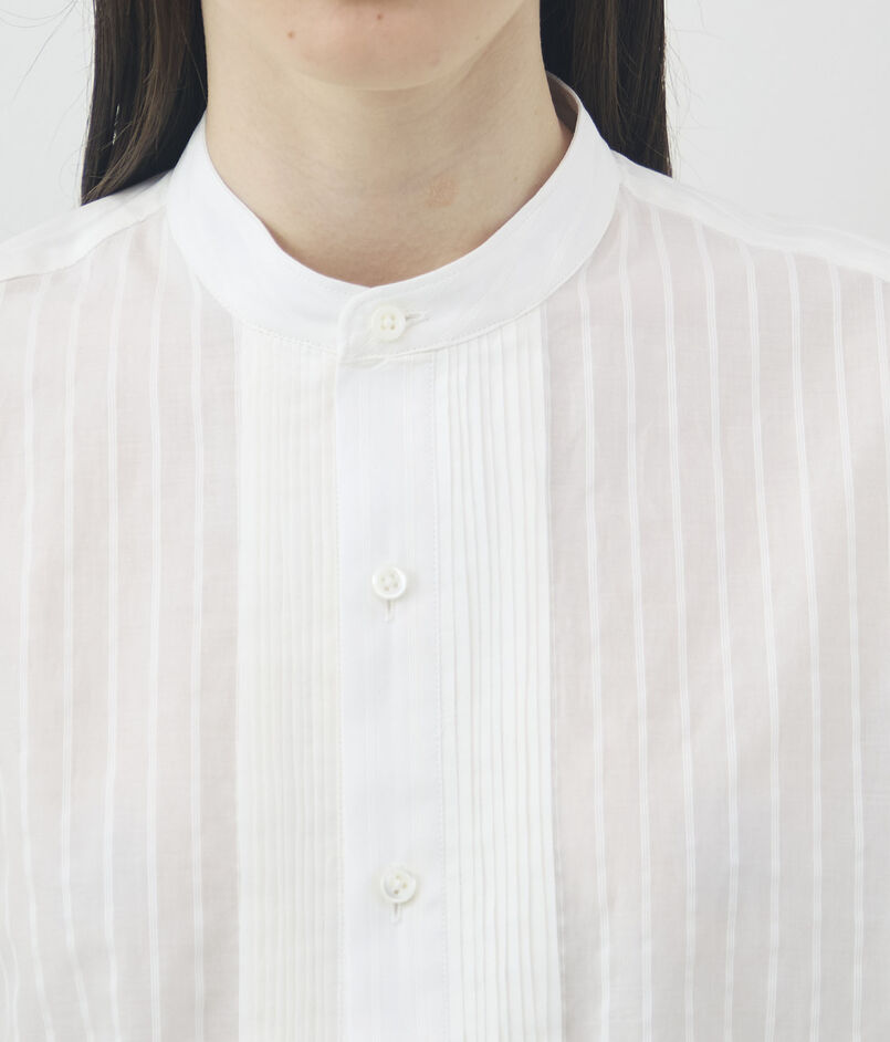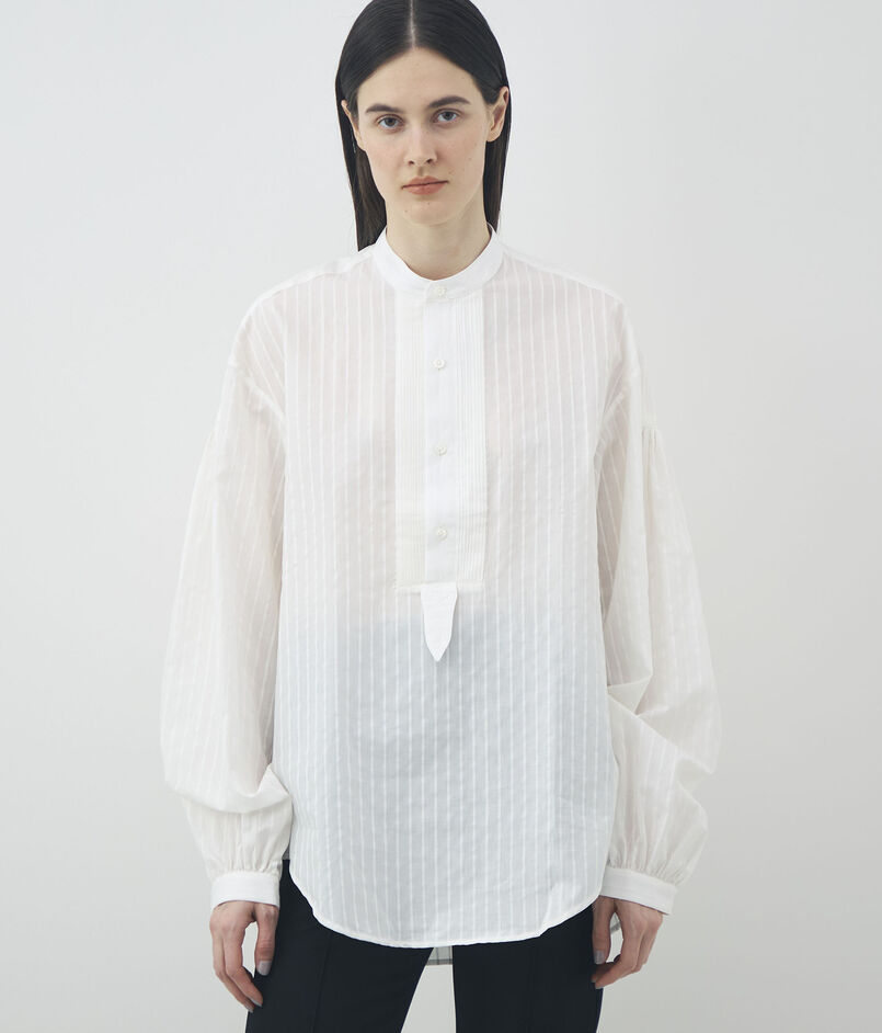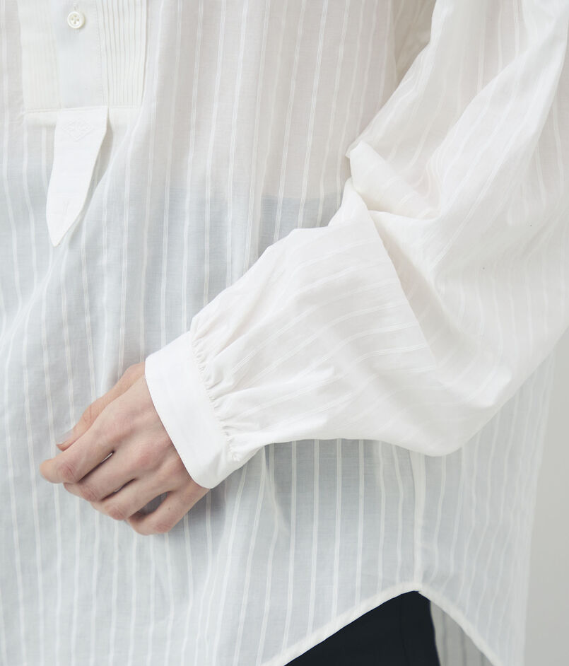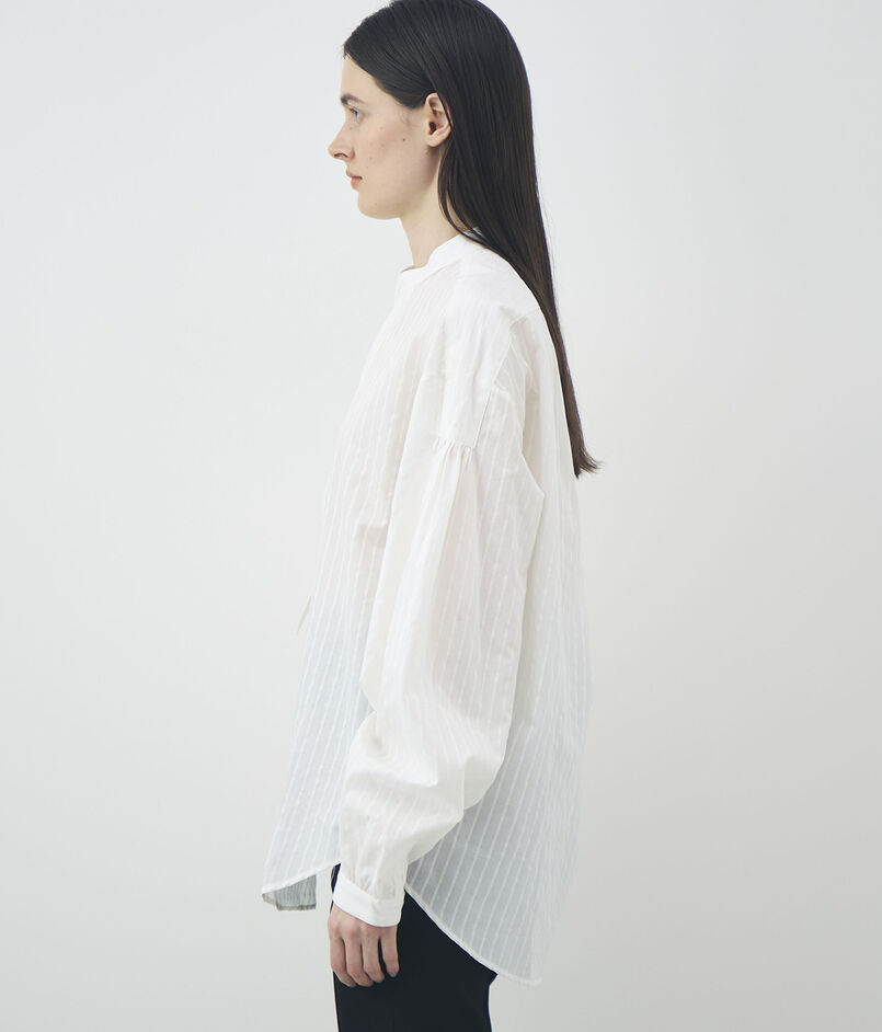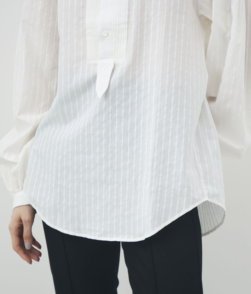 やや透け感のある軽やかな素材に、同色のストライプが施されたデザインシャツ。