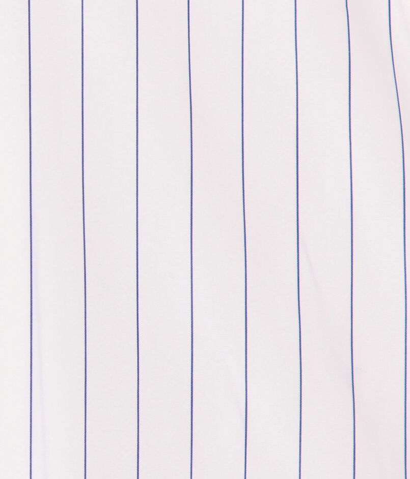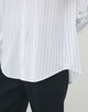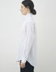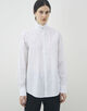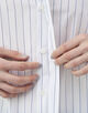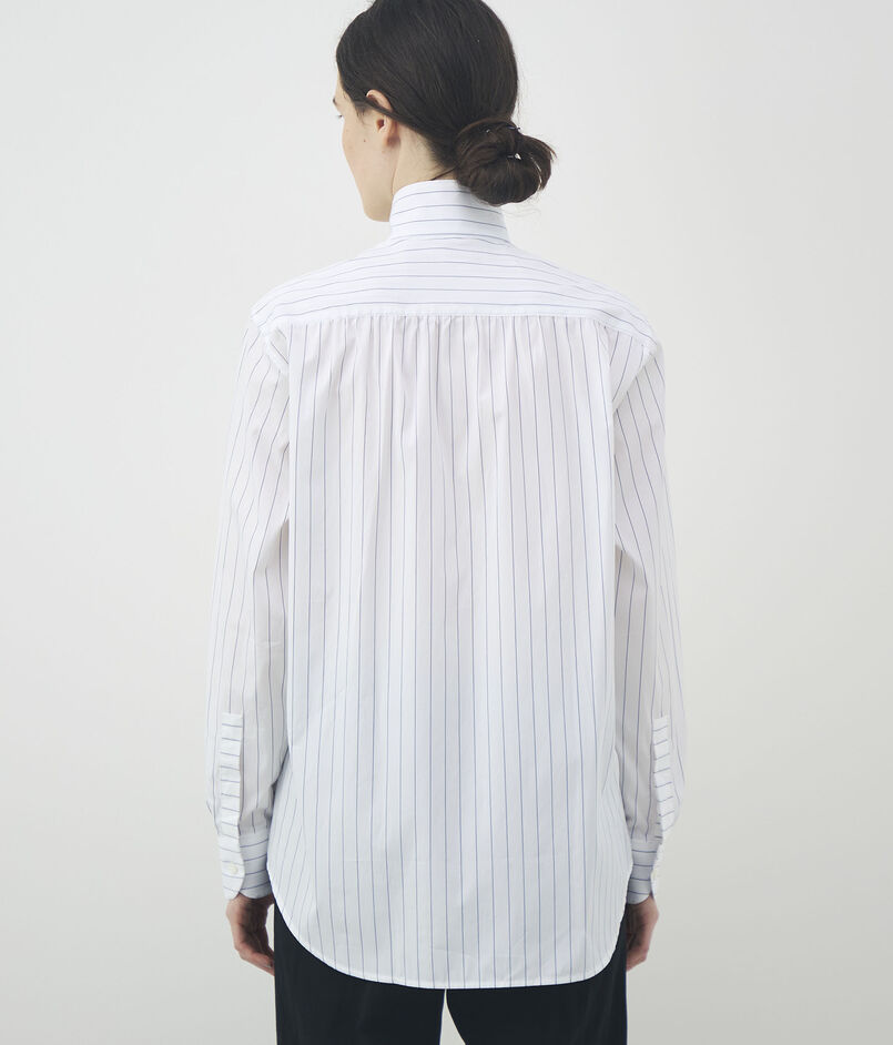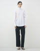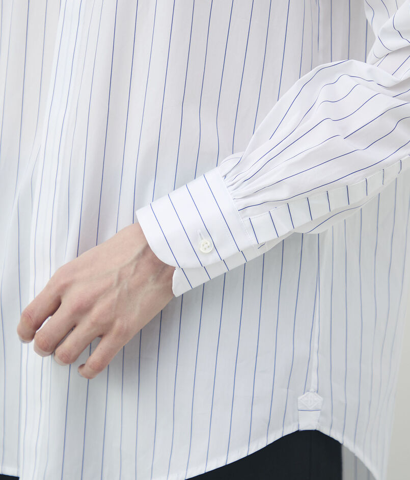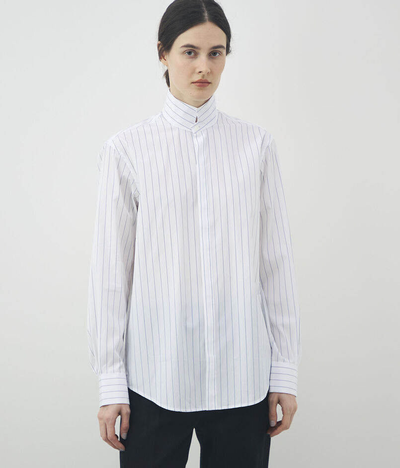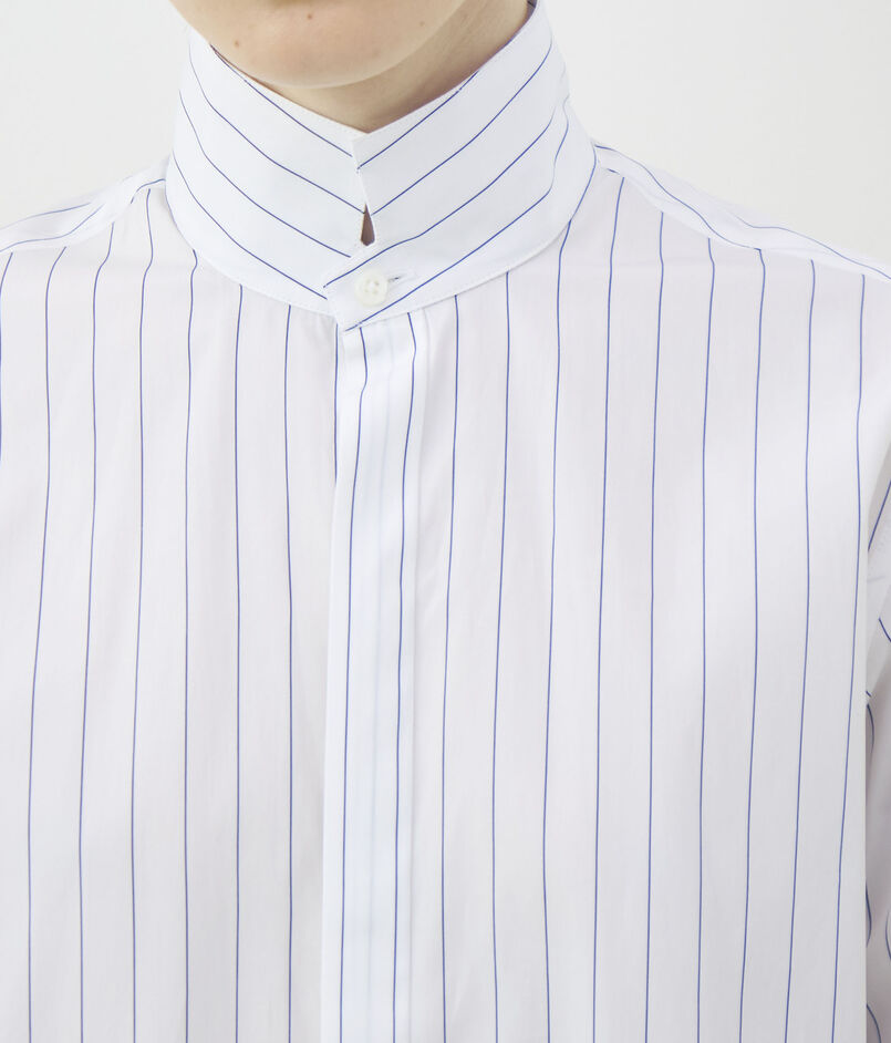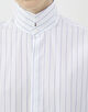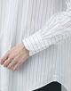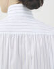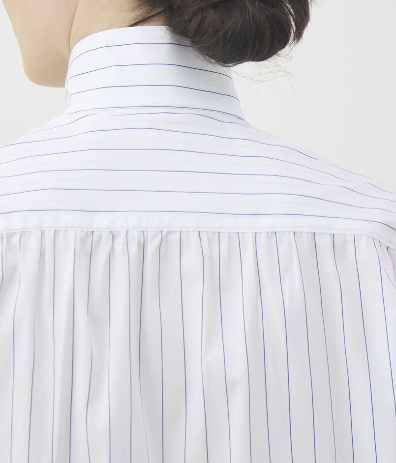 細かなストライプを織り込んだ素材を使用し、メンズウェアに着想を得たハイカラーが凛とした表情を演出します。