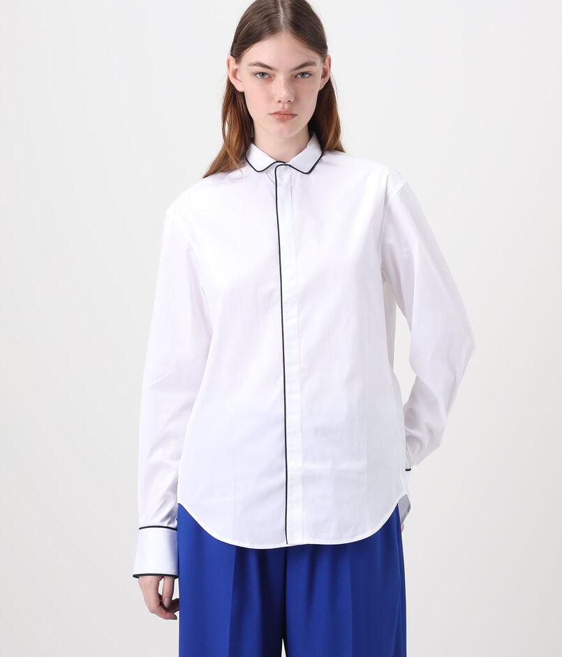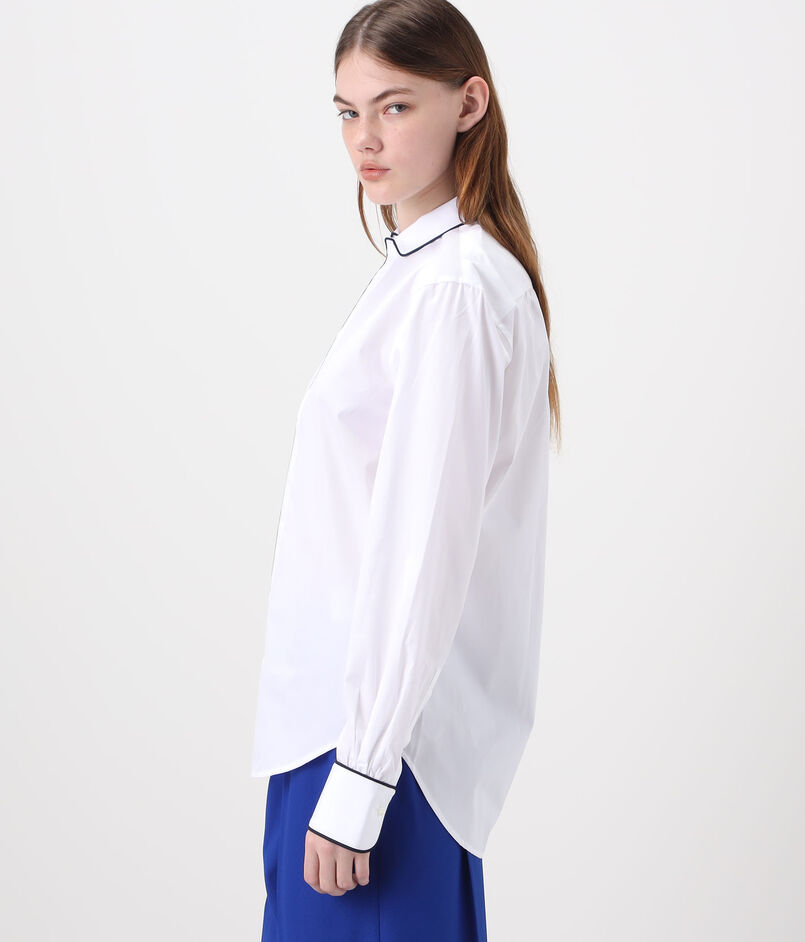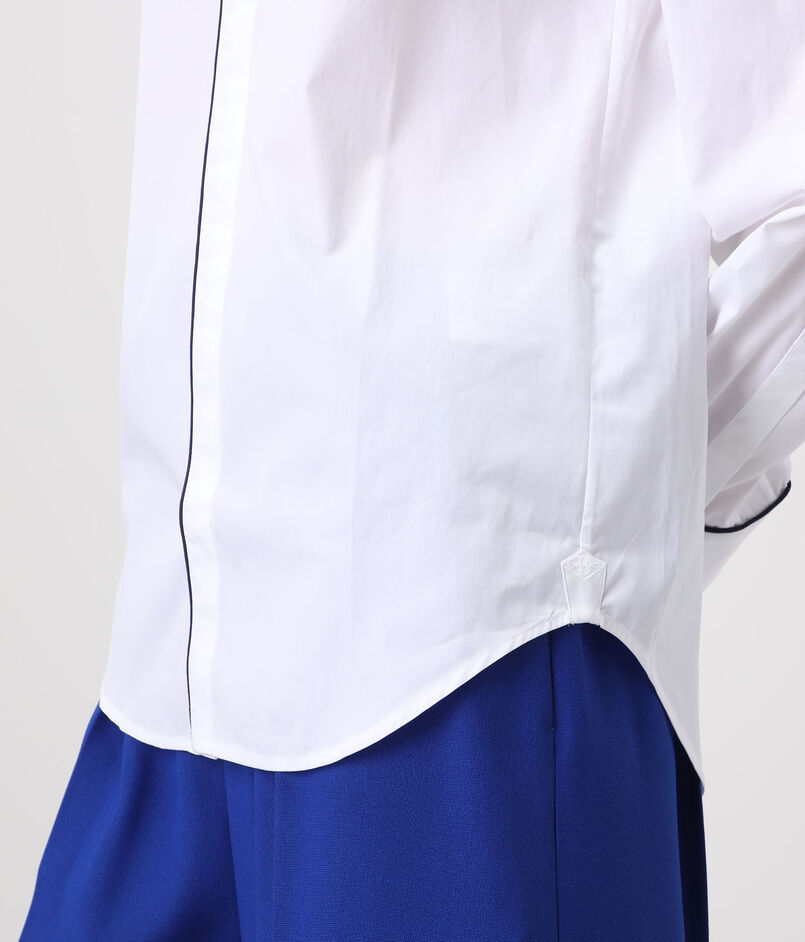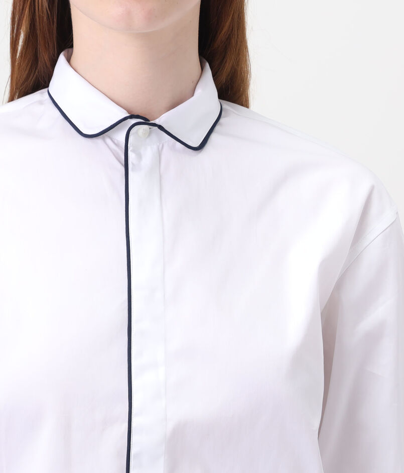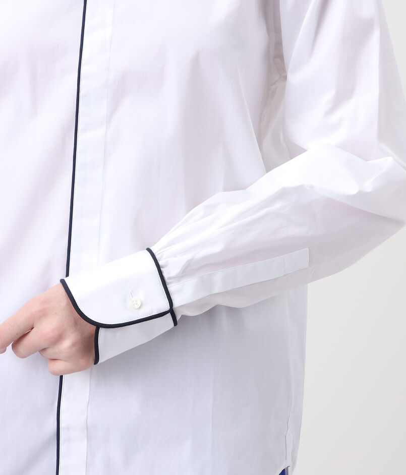ネイビーブルーのコットンパイピングが袖口とシャツの裾まで施されており、印象的かつエレガントな表情が魅力です。