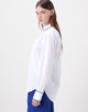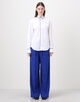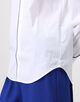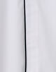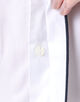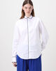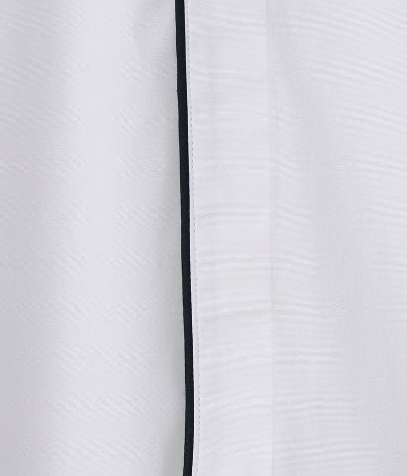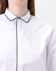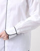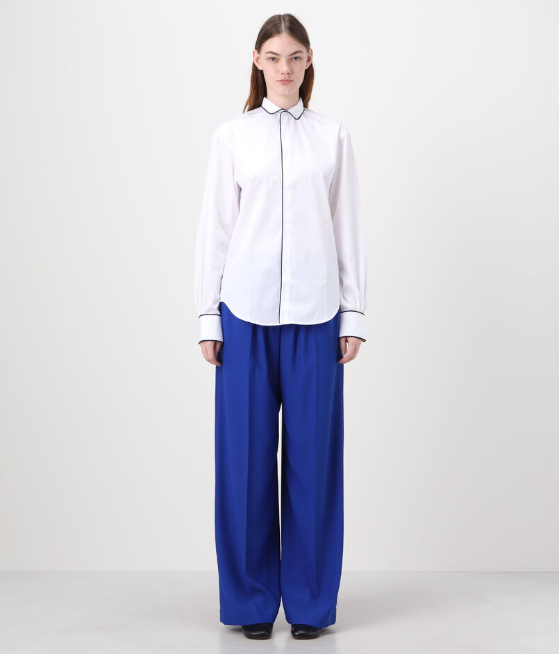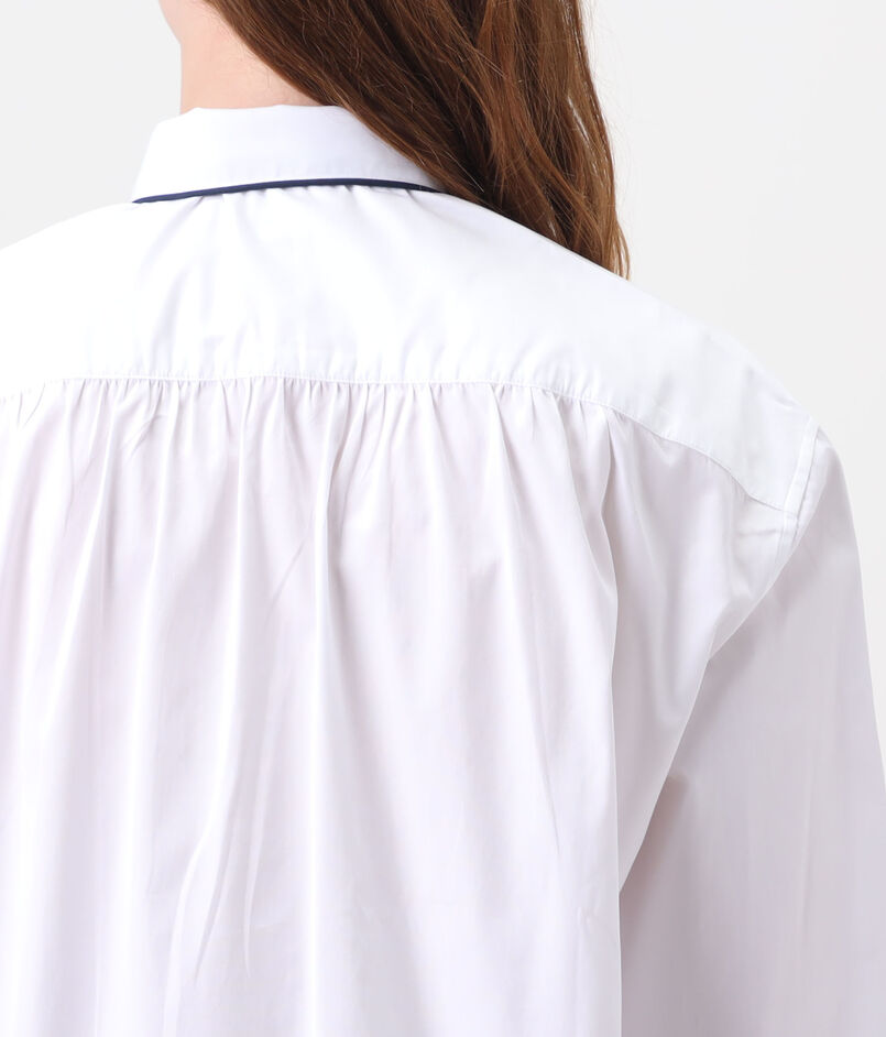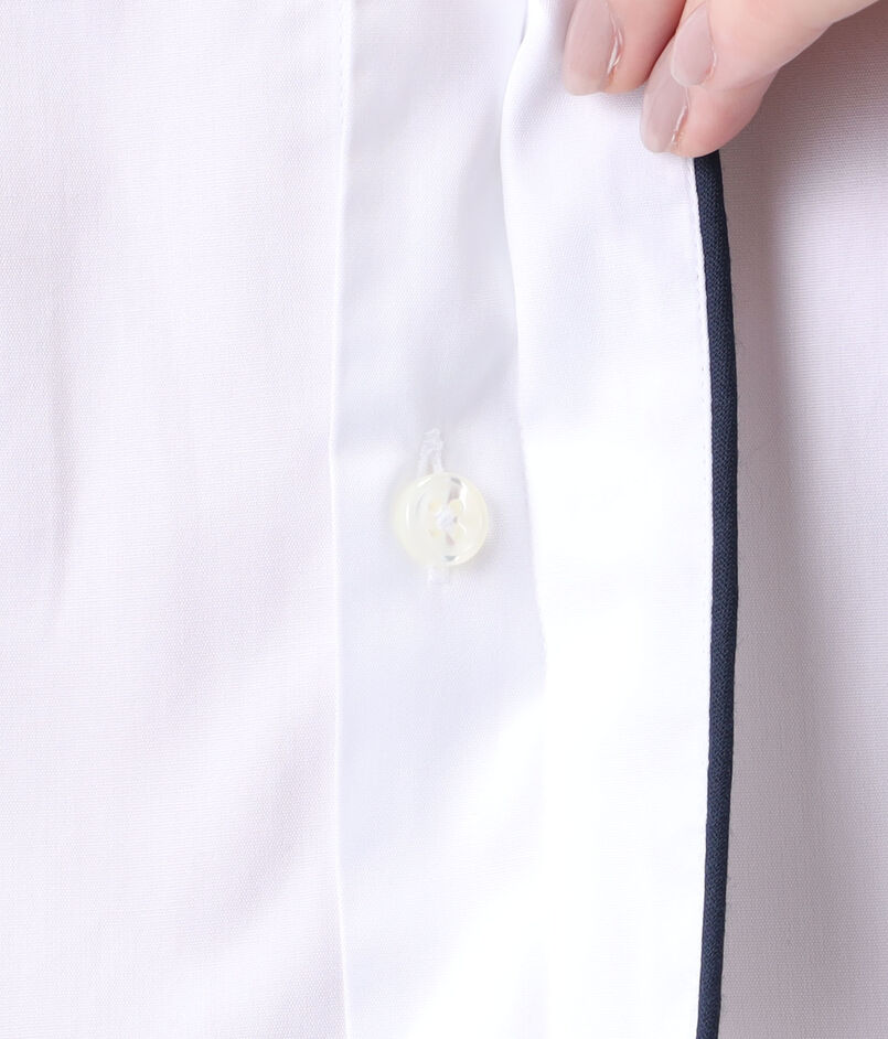 ネイビーブルーのコットンパイピングが袖口とシャツの裾まで施されており、印象的かつエレガントな表情が魅力です。