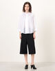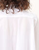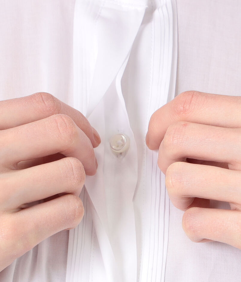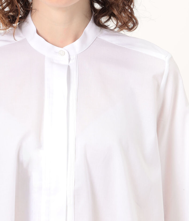 ボタン両側には丁寧なプリーツが施され、ミニマルでありながらもディテールに品のある表情を宿した美しい一着。