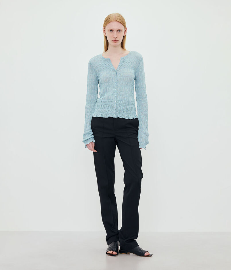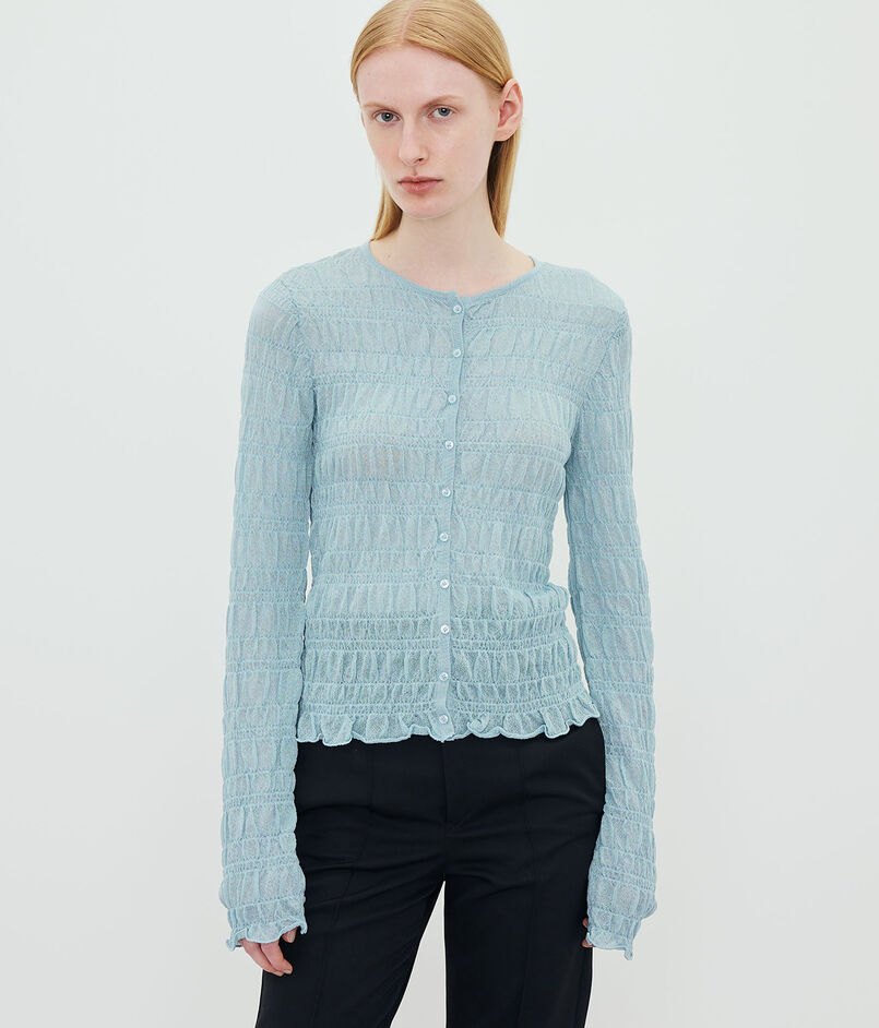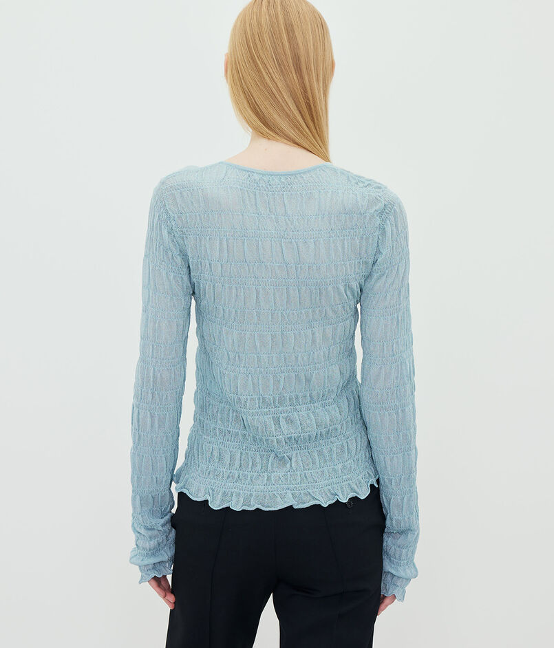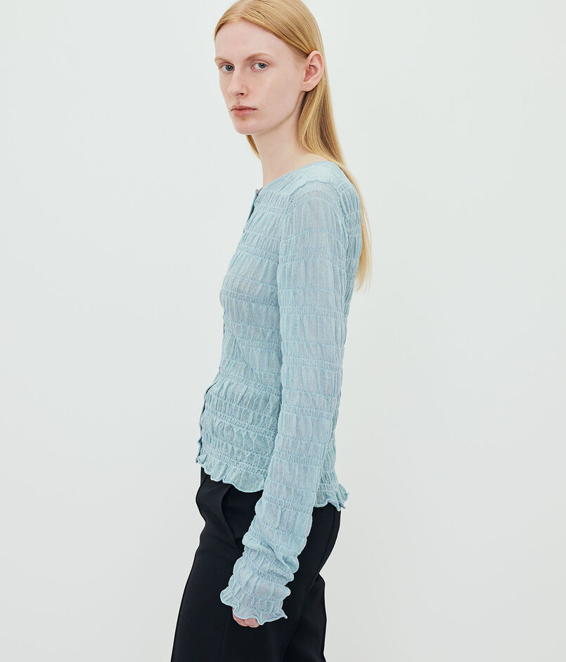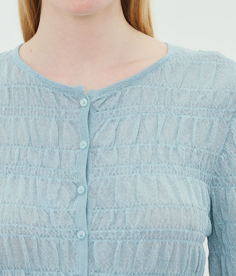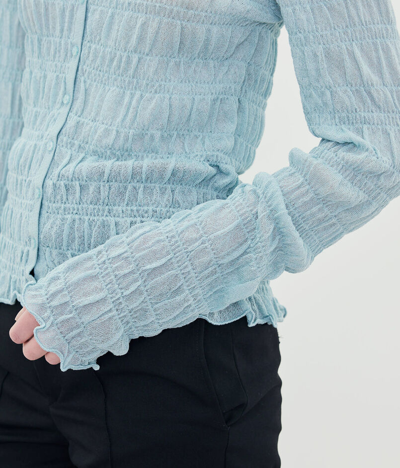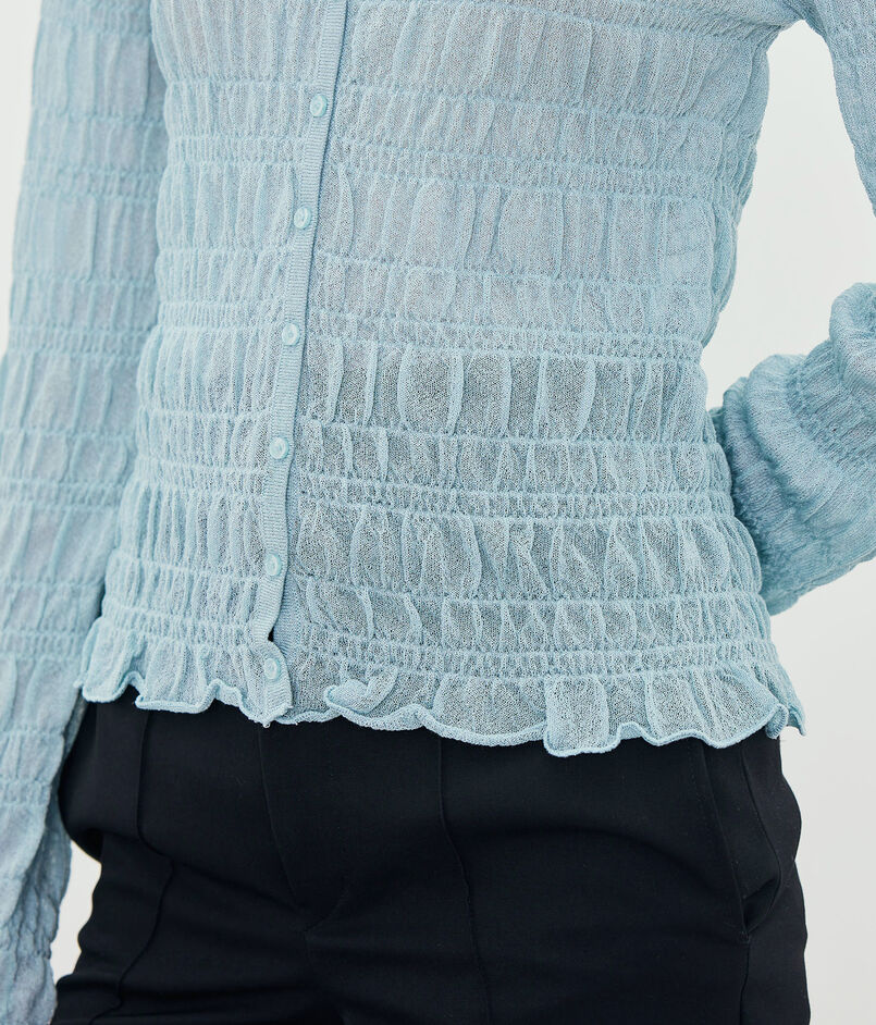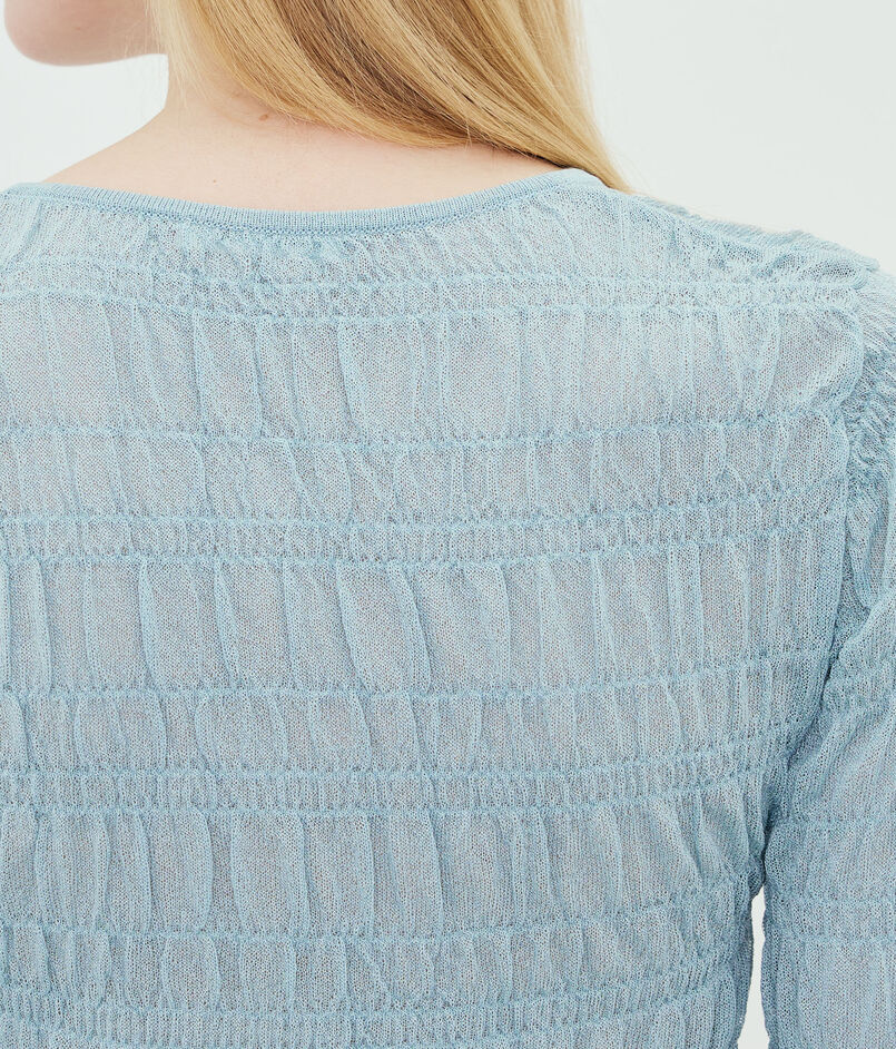 透け感のある生地に、手触りの良いスモック柄が施されています。
