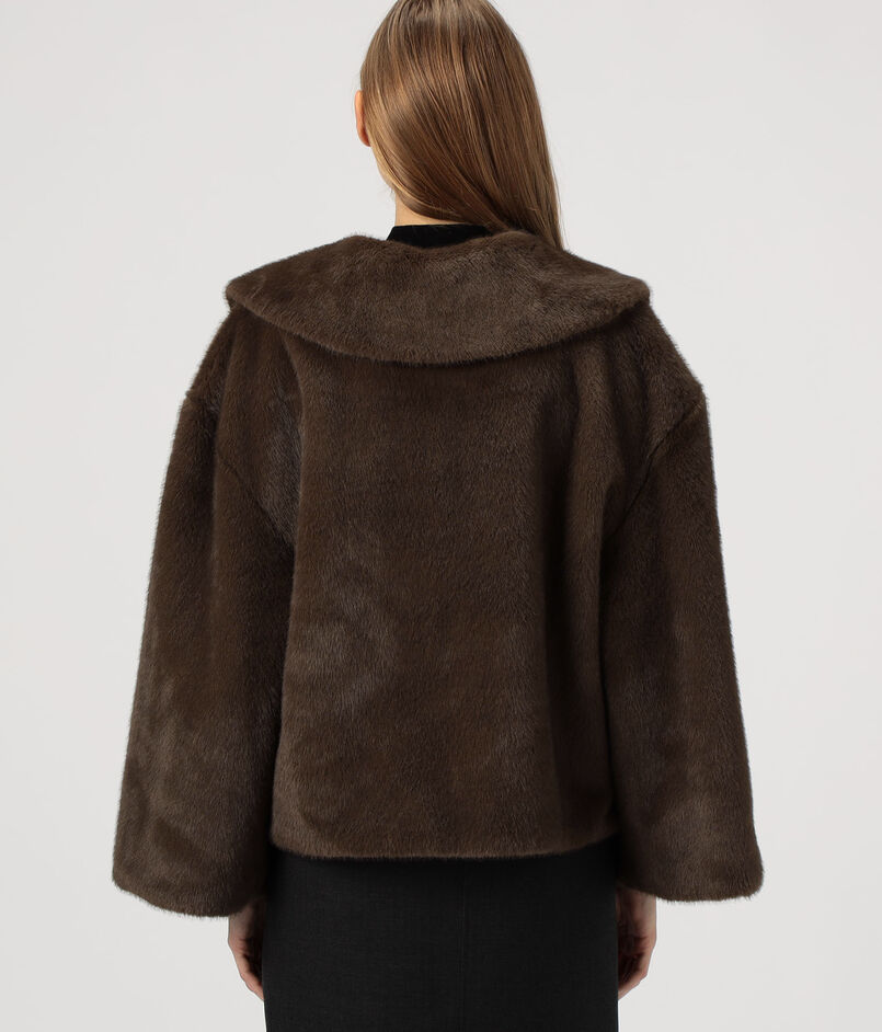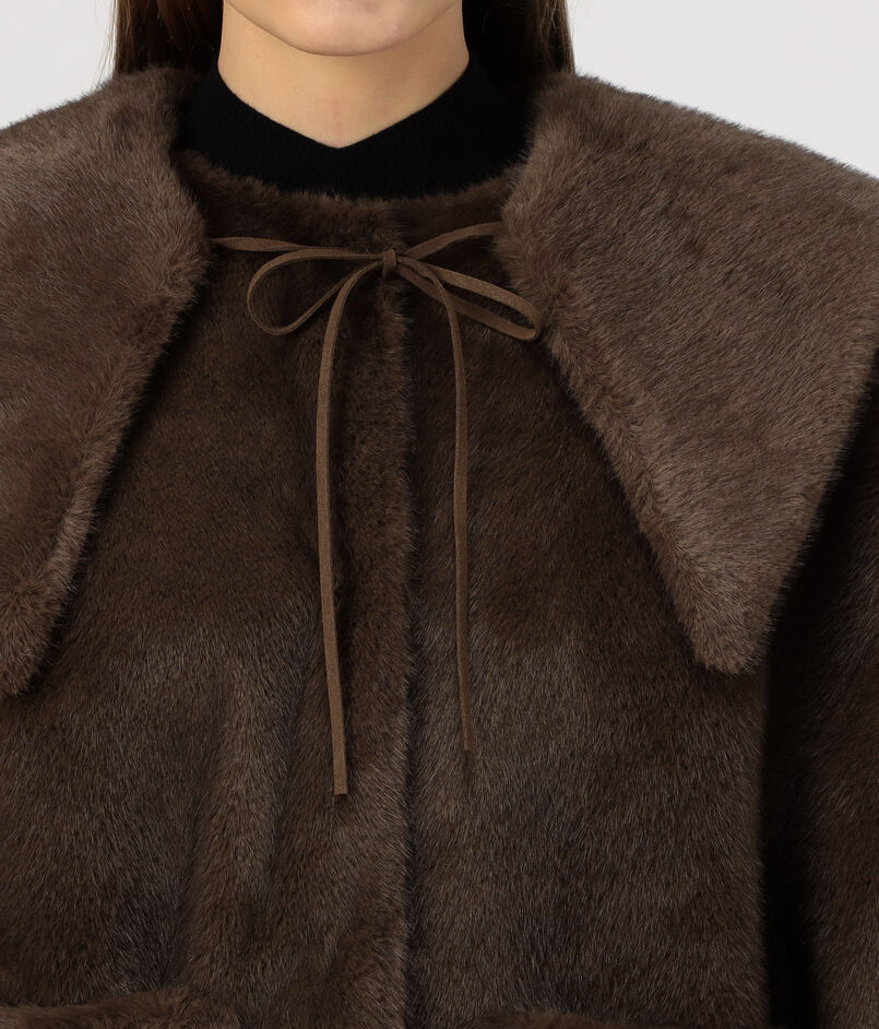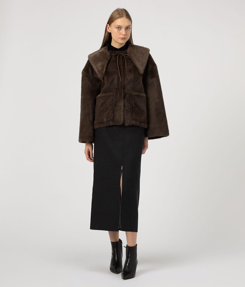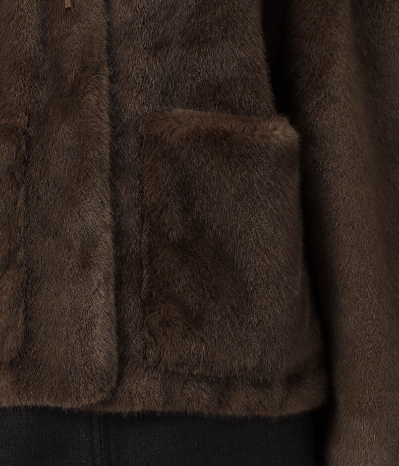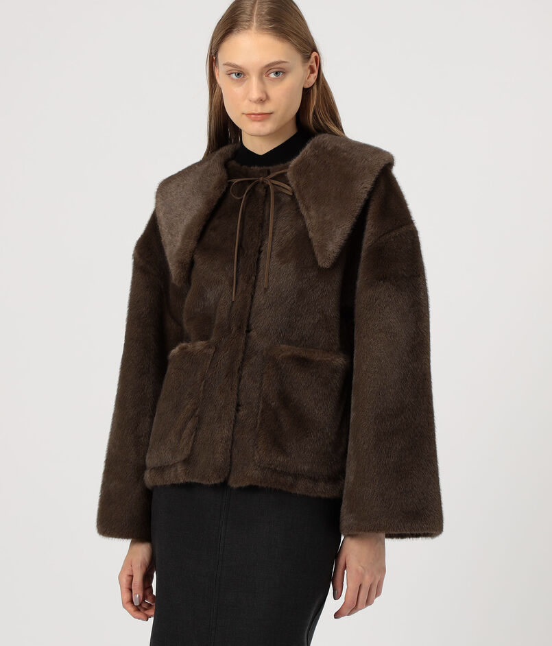 シャープな襟がポイントの洗練されたフェイクファージャケット。