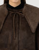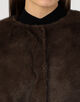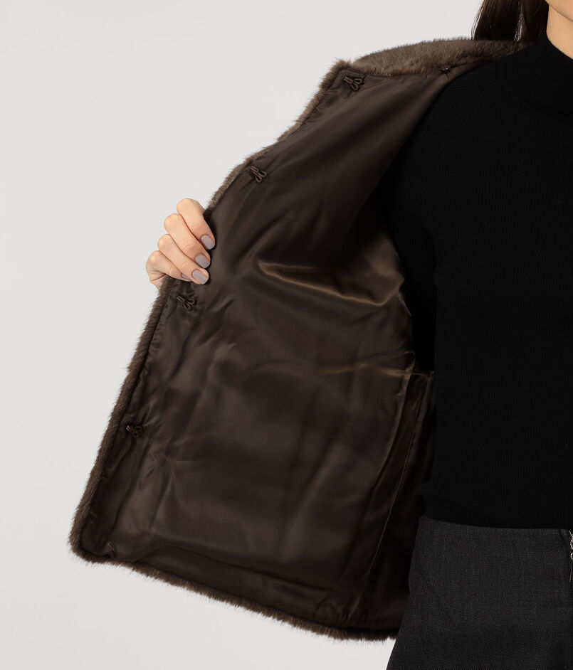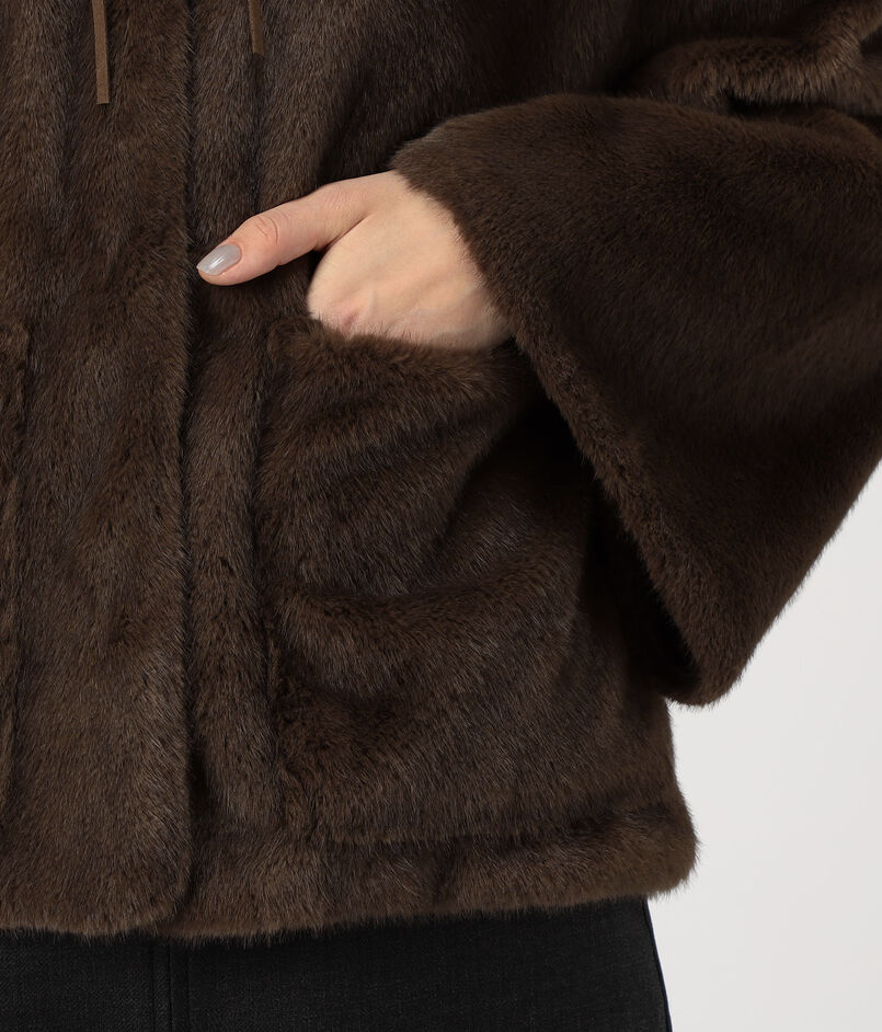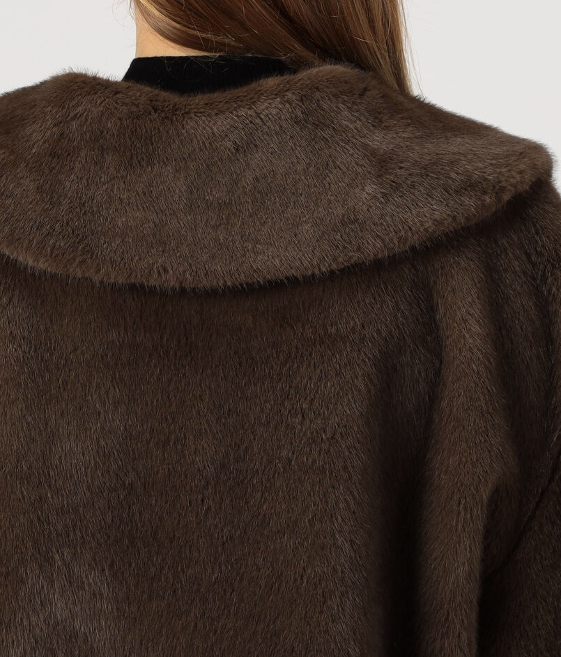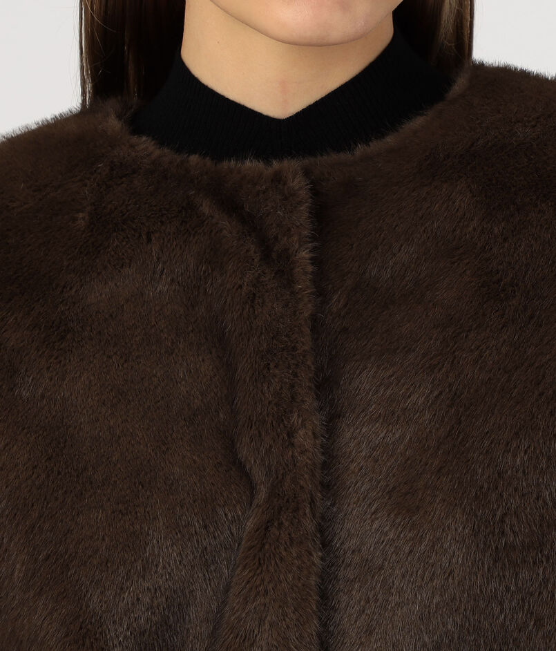 シャープな襟がポイントの洗練されたフェイクファージャケット。