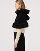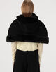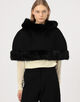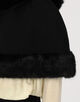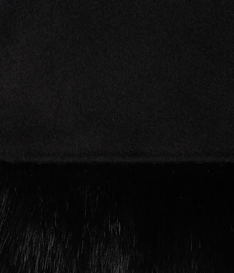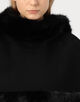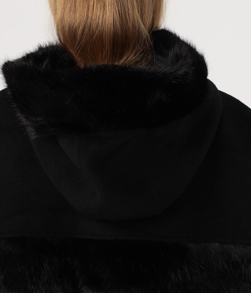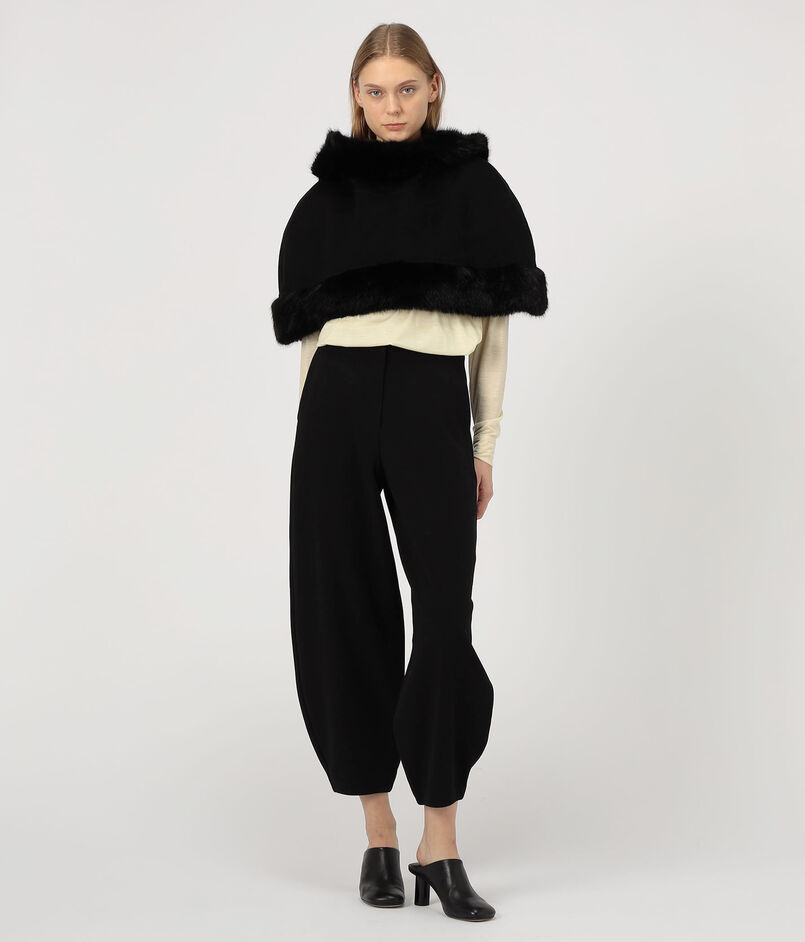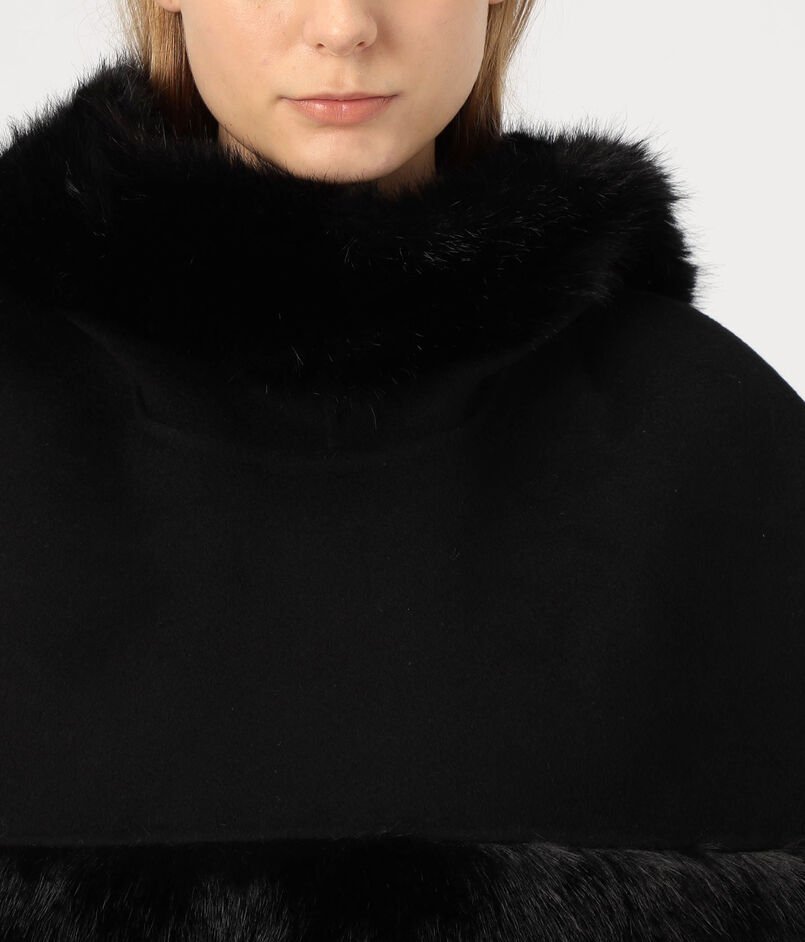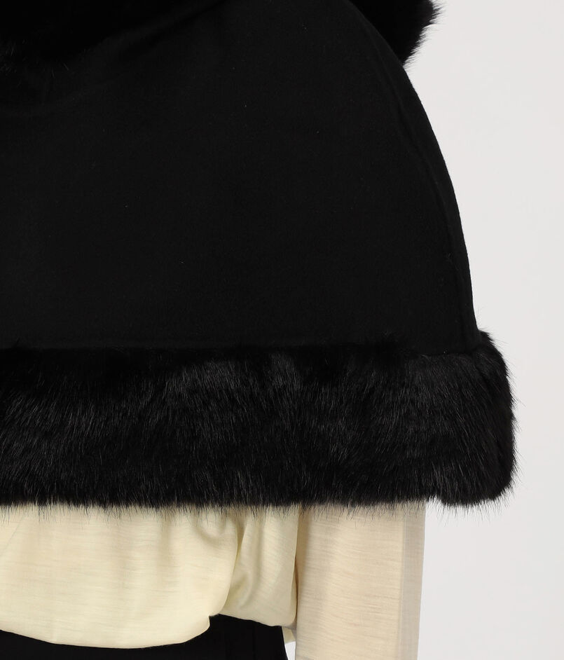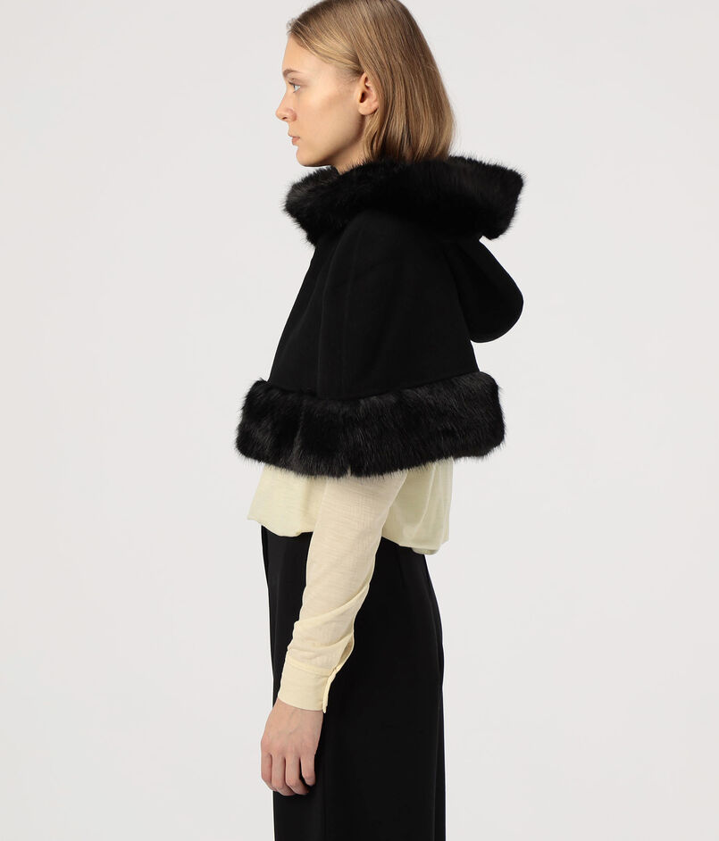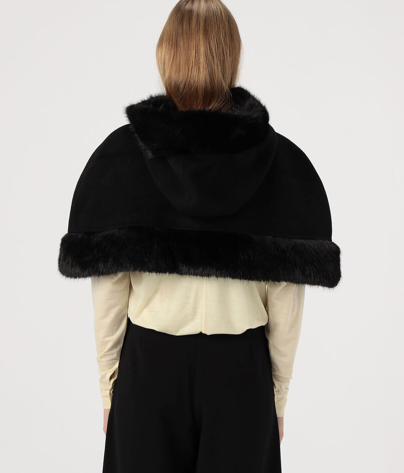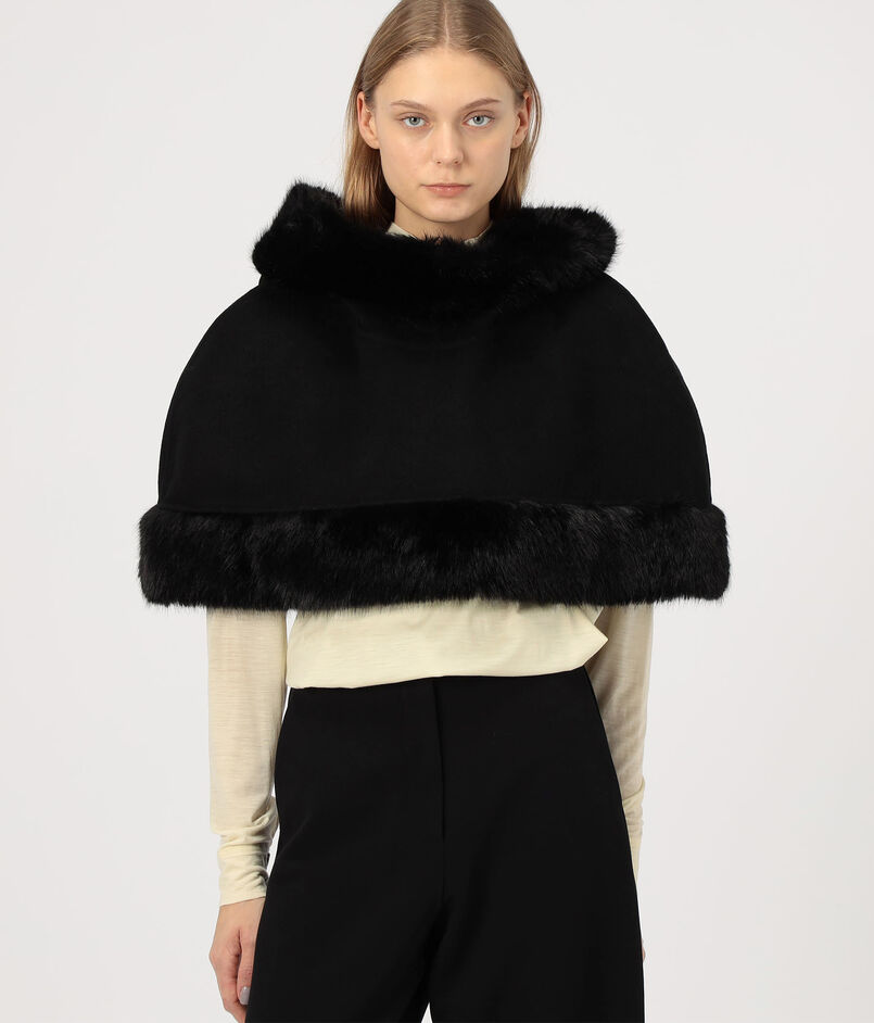 フェイクファーのトリムを施したクラシックなケープ。
