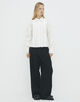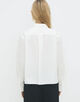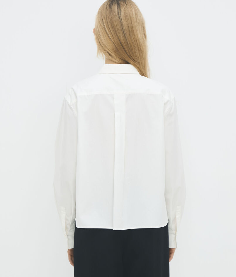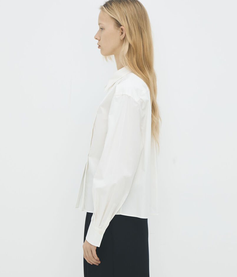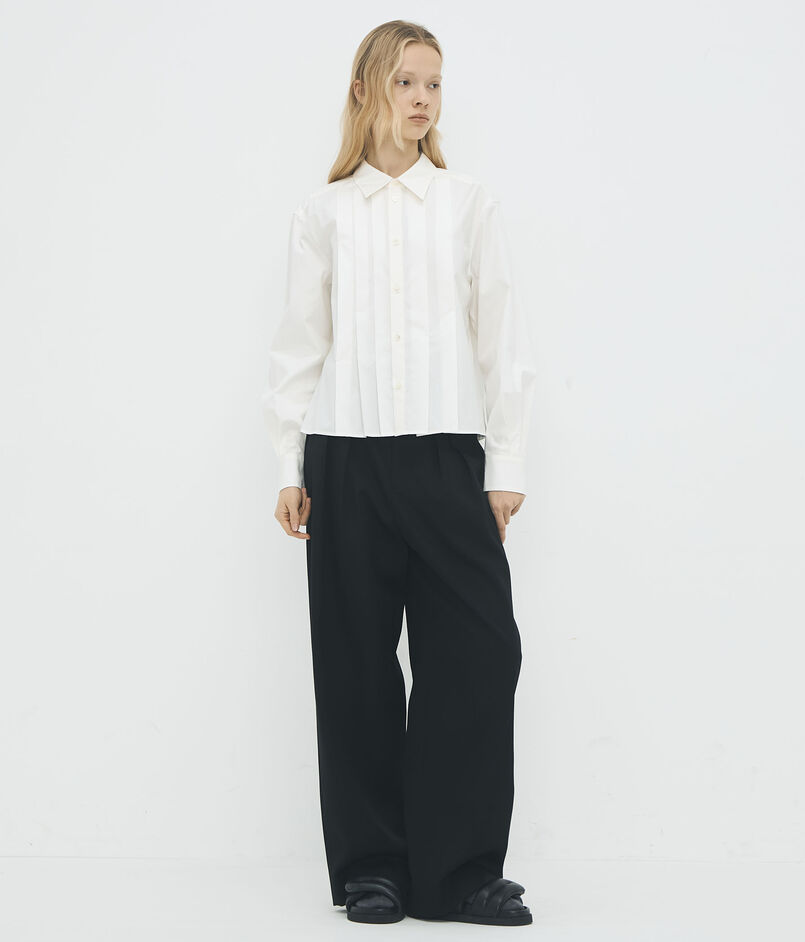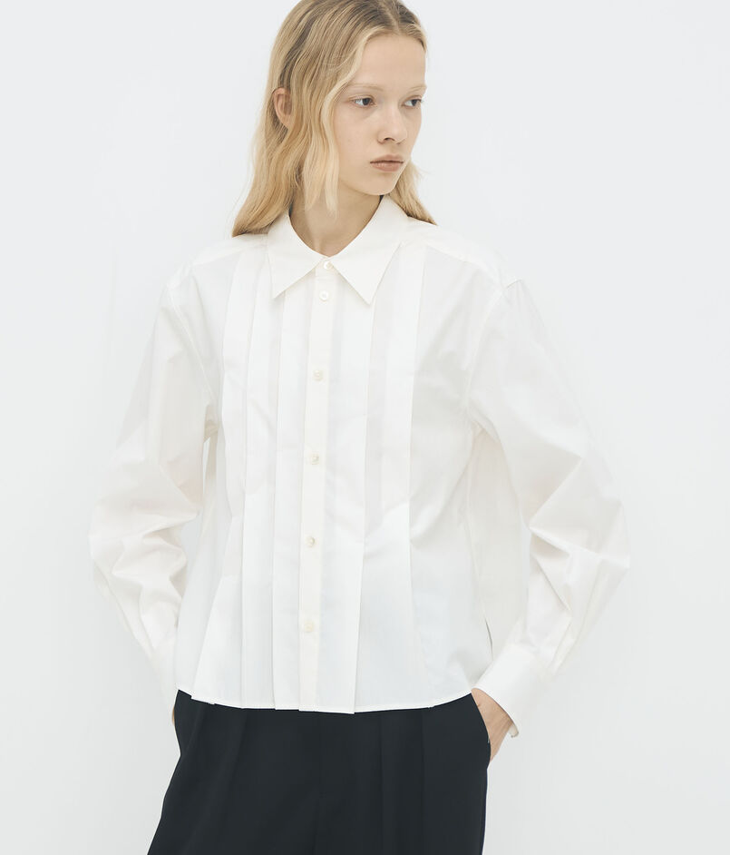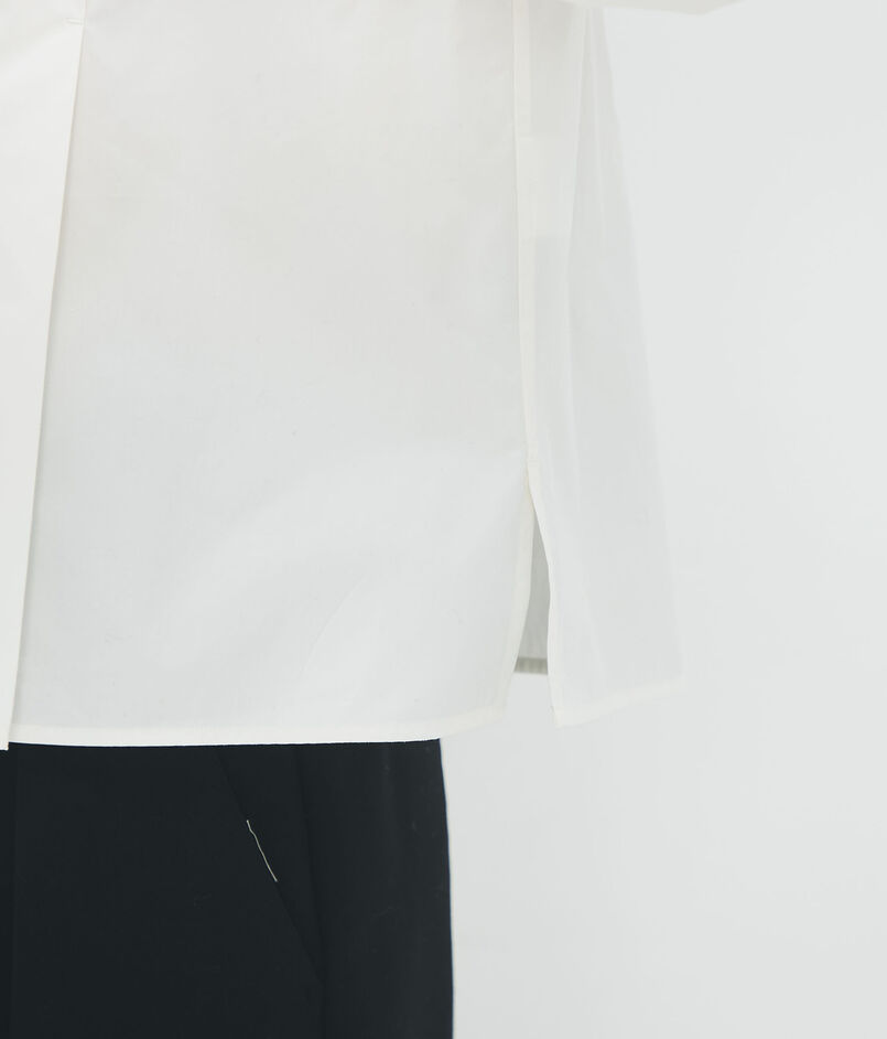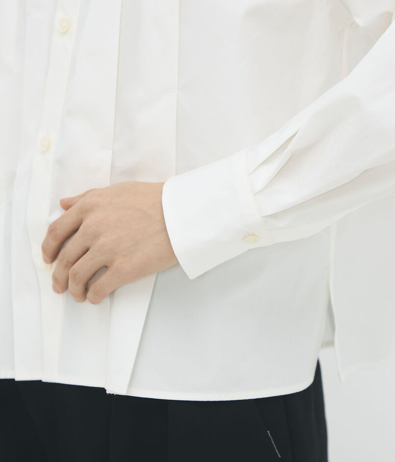 ハリのある素材にややボリュームのある袖と、タックデザインで広がるシルエットでウエストアウトして着用できるバランスの短め着丈の一品です。