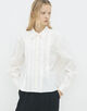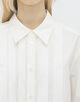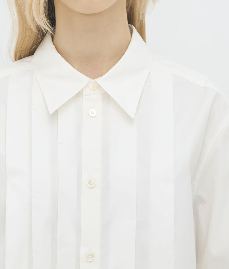 フロント部分にランダムな太めのタックを入れたデザインシャツブラウスです。