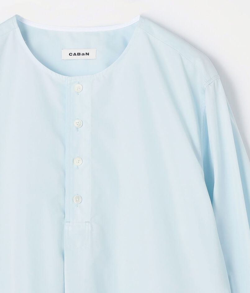 クルーネックのボタンプルオーバーシャツは、前立ては身頃続きで仕立てすっきりとしたミニマルなデザインに仕上げました。