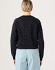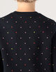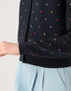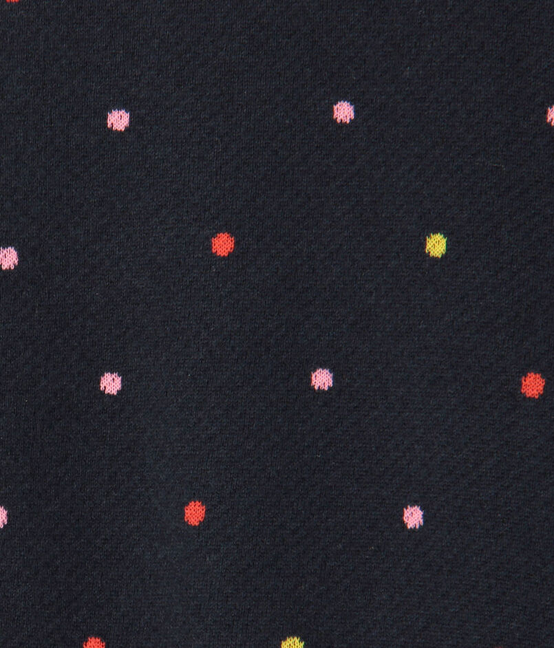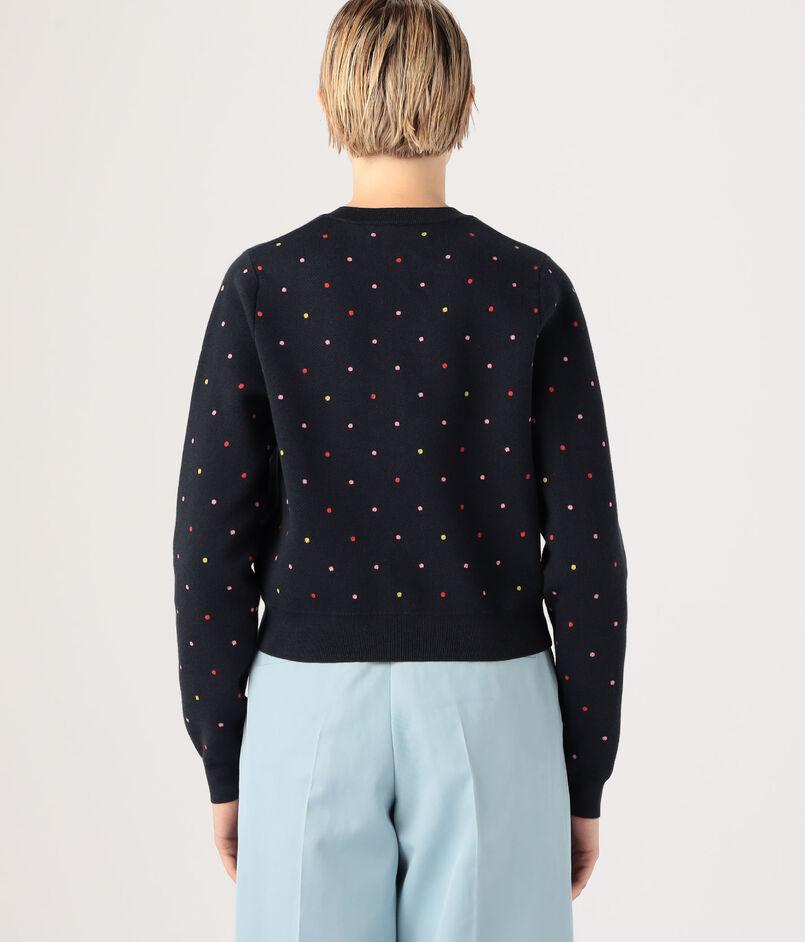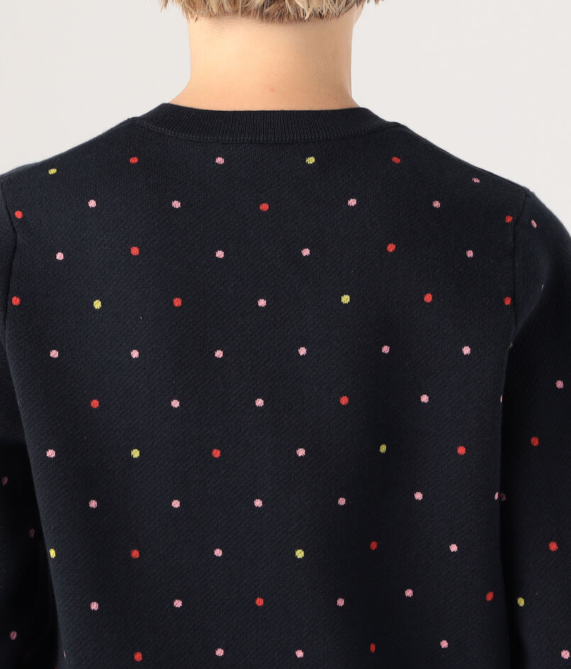 マルチカラーのドット柄をジャカード編みすることで、裏面にはマルチカラーの斜文線が鮮やかに編まれ、着ても脱いでもプレイフルな一着です。