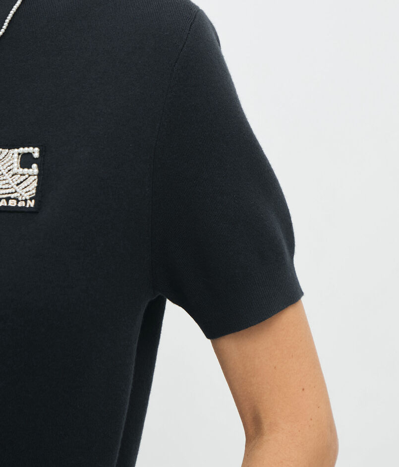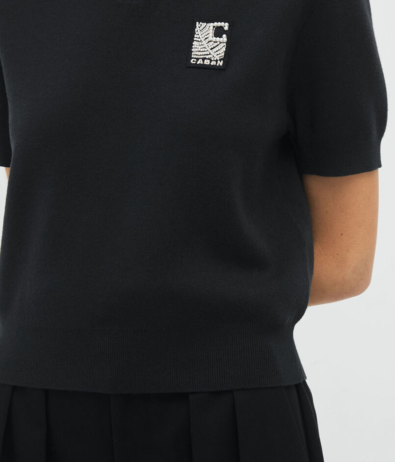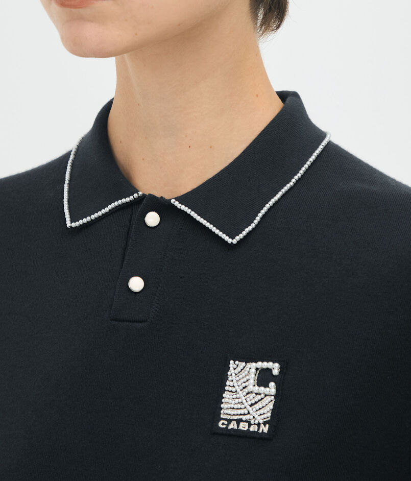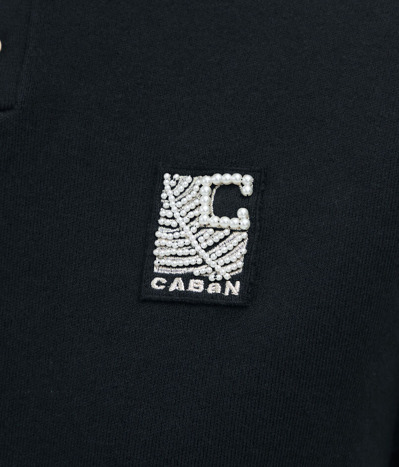 一つ一つ手作業でパールビーズをあしらった小ぶりな襟と、身頃と同素材のコットンカシミヤニットのベースにラメ刺繍を施しその上からパールビーズをあしらった〈CABaN〉ロゴもポイント。