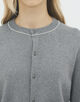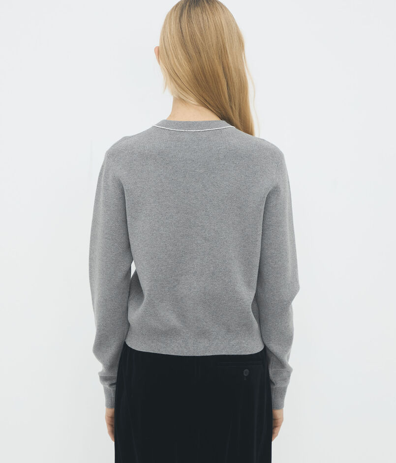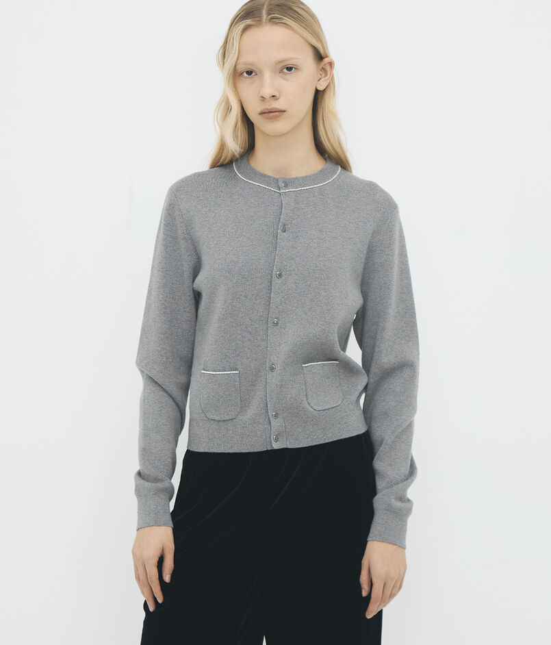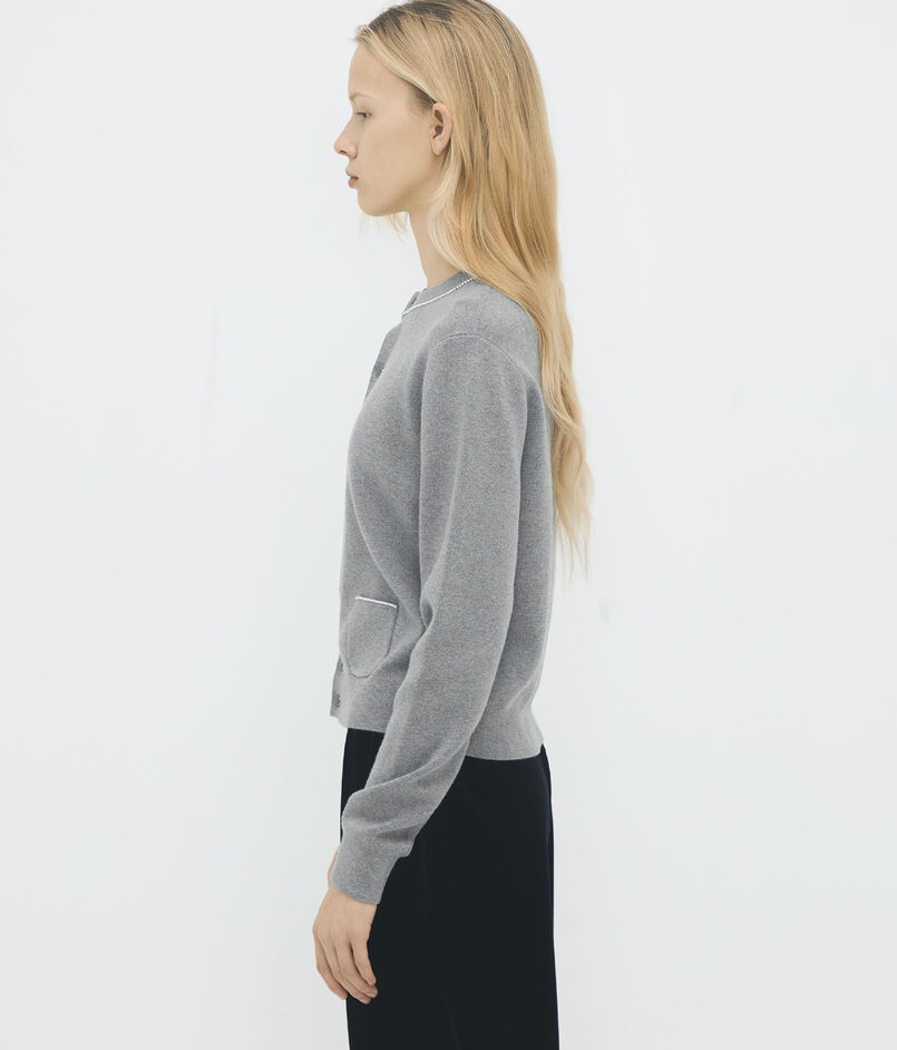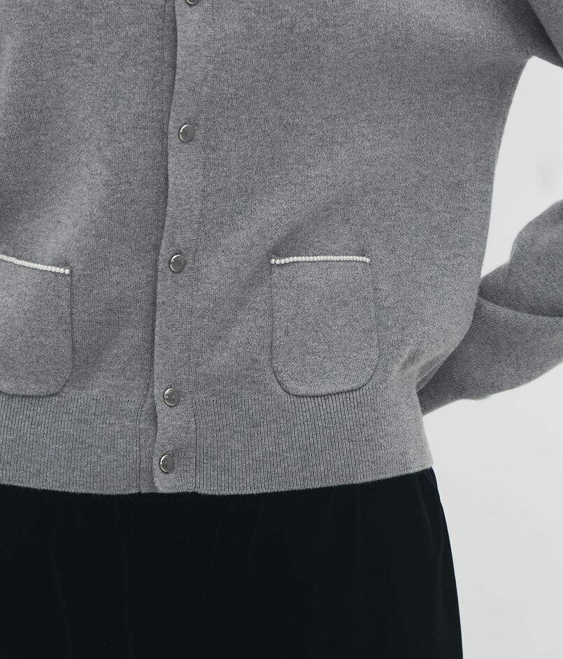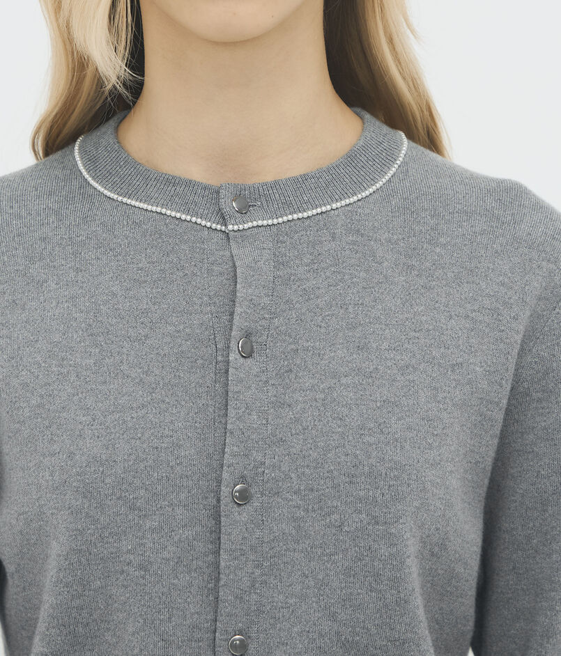 ネックラインとポケットの淵にパールがあしらわれたカーディガン。