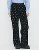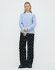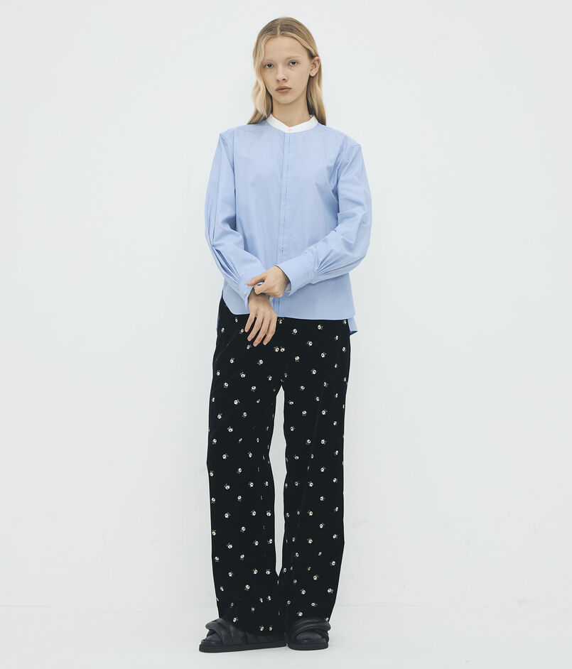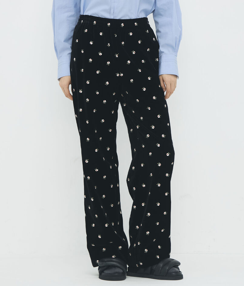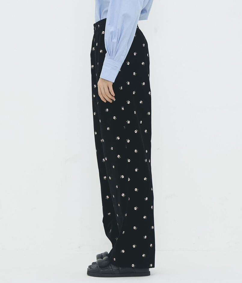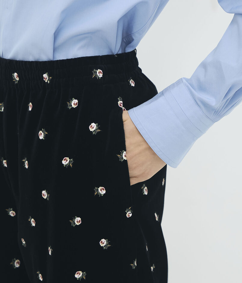 ウエストシャーリングですっきり履けるイージーパンツは、ほど良いテーパードシルエットで綺麗めな印象に。