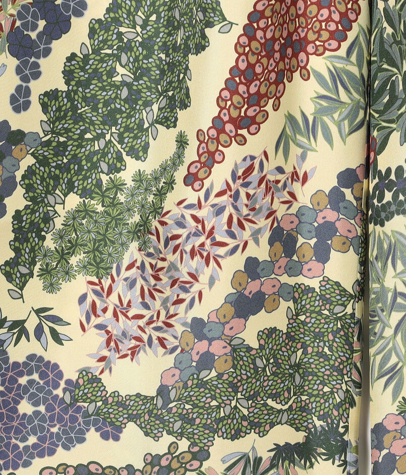 19匁のシルクツイルを使用したプリント図案は、フランスで出会ったアーティストの図案を採用したオリジナル柄。