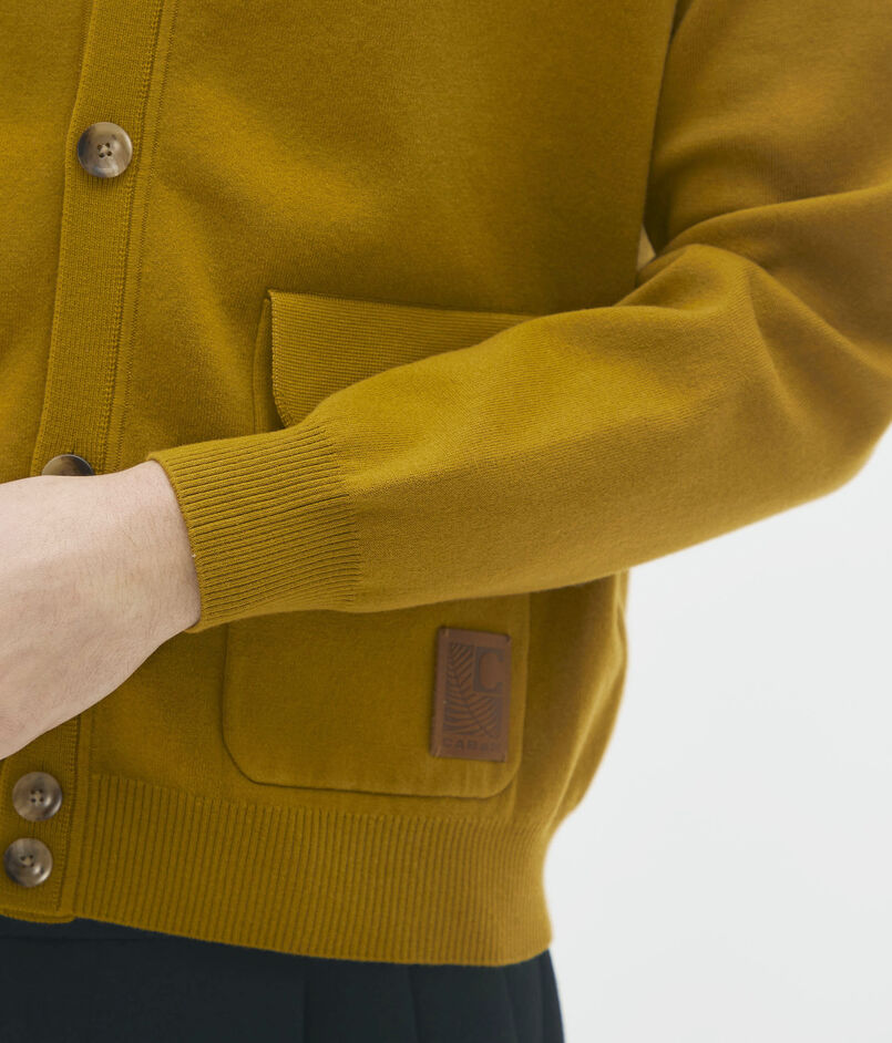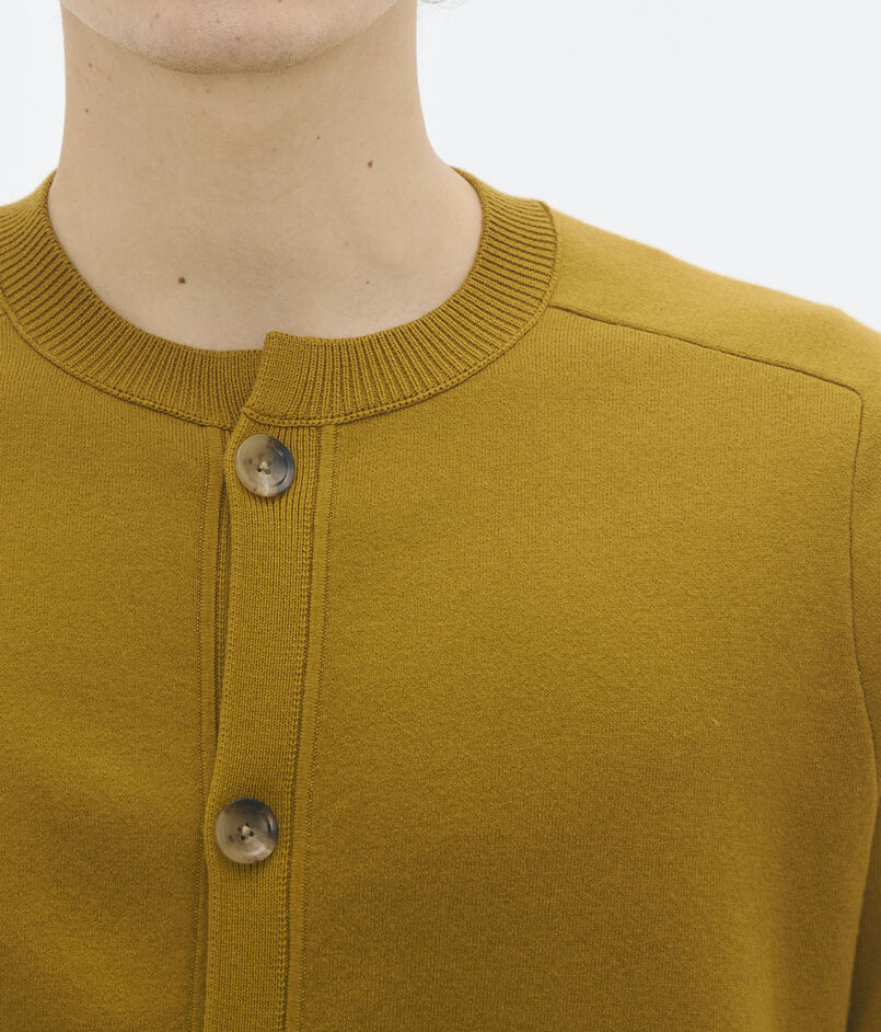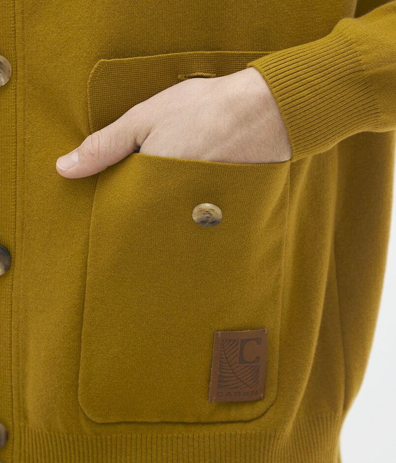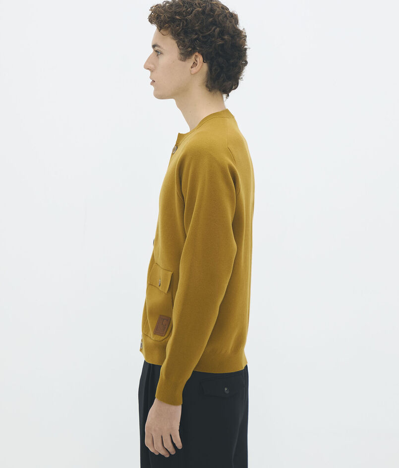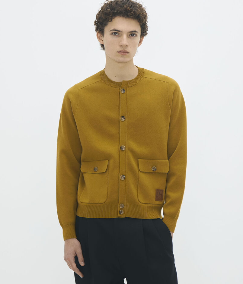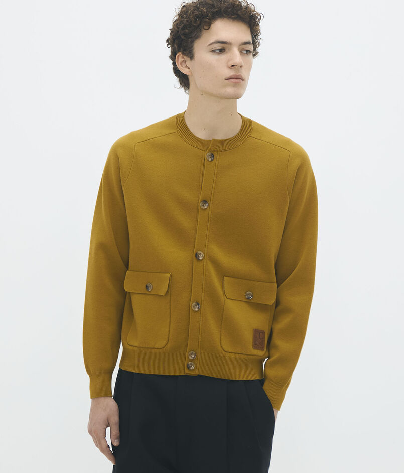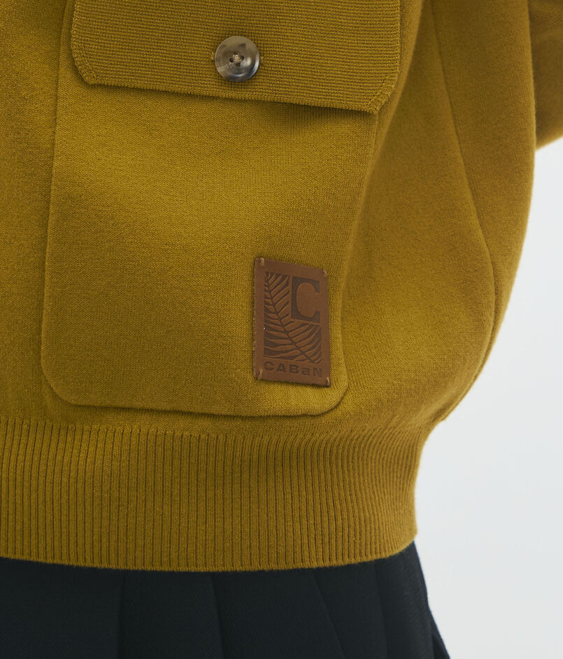 フラップポケットと大きめなボタンがポイントのニットブルゾン。