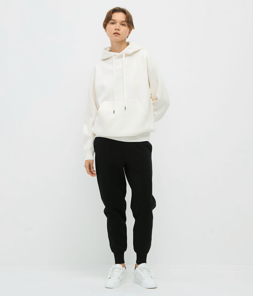 二重組織ならではのしっかりとした生地感と、スムース編み・カシミヤブレンドならではのソフトな肌触りが特徴。