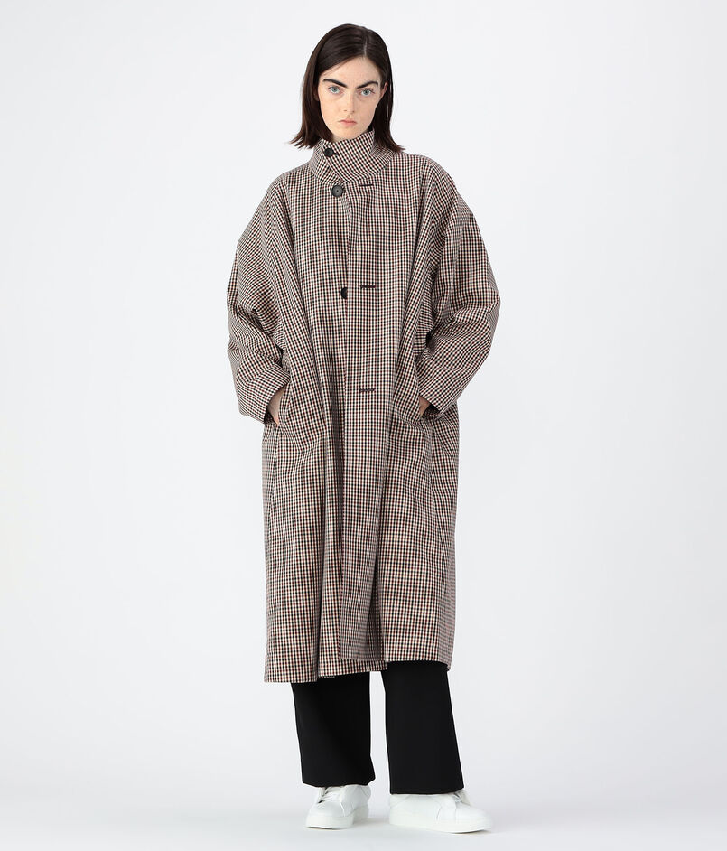 トラディショナルな先染めのガンクラブチェックとグレンチェックが新鮮な定番のスタンドカラーワイドバランスコート。