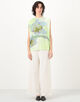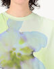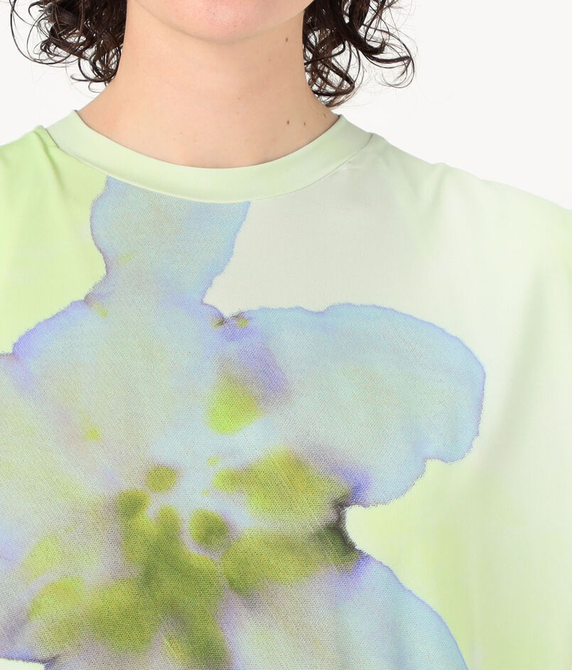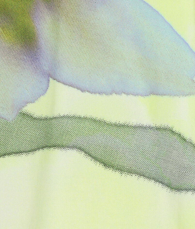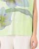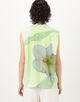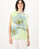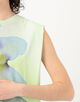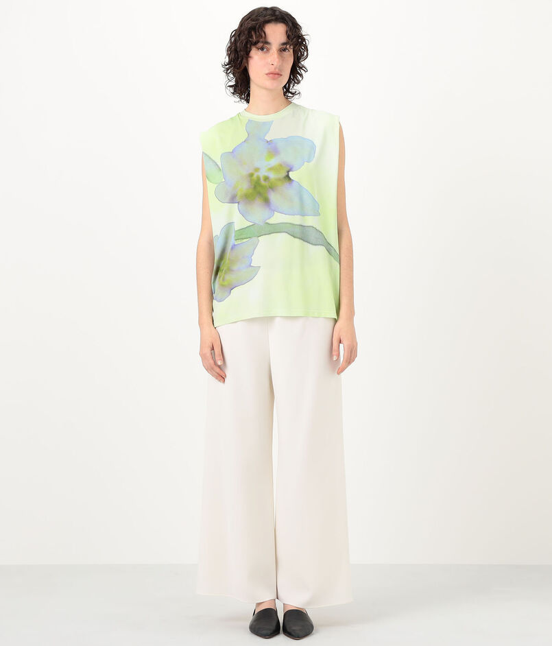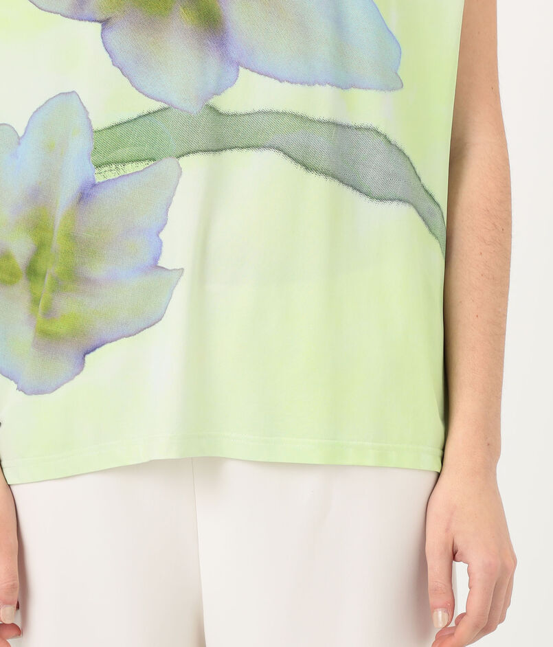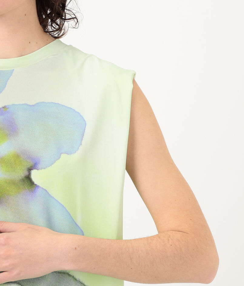 鮮やかなプリントが目を引くノースリーブのジャージートップス。