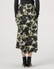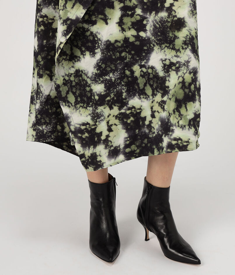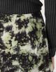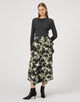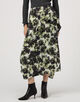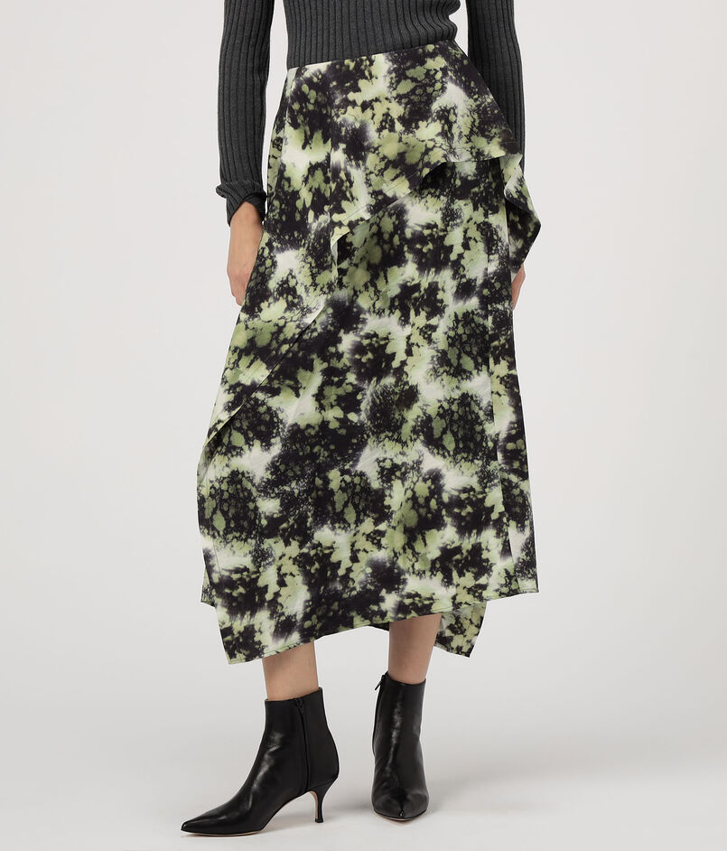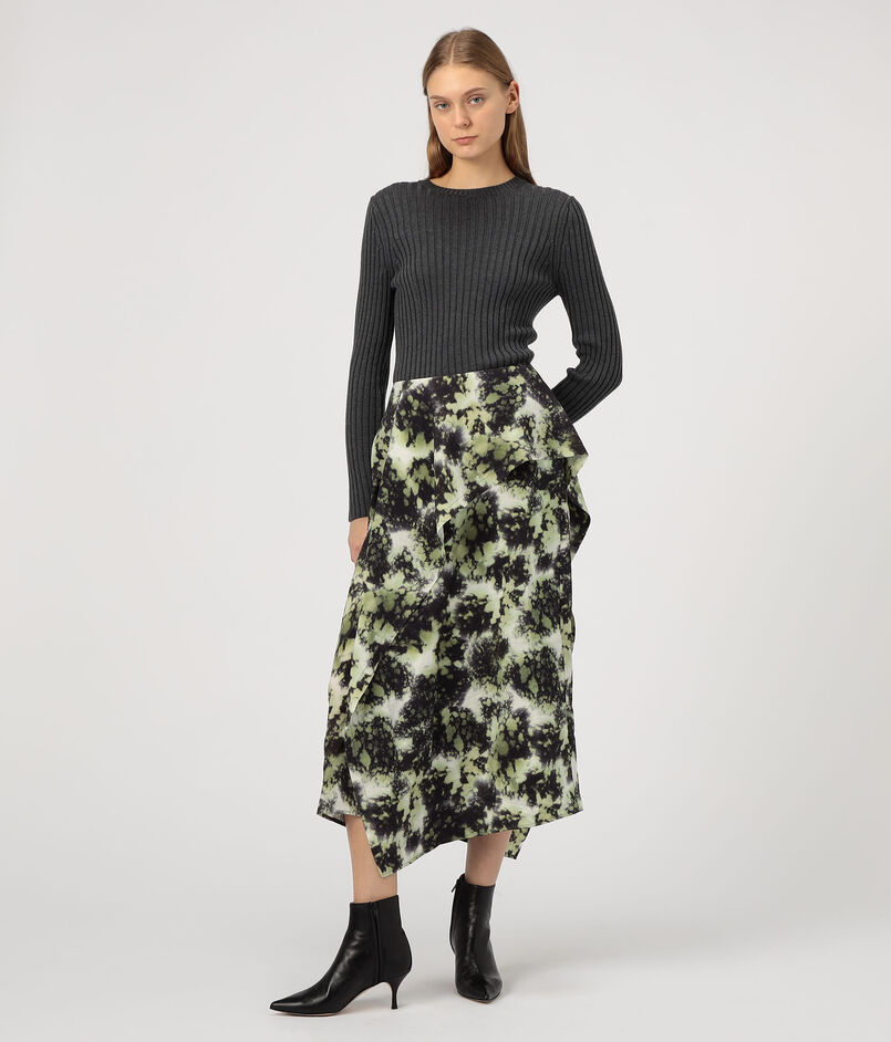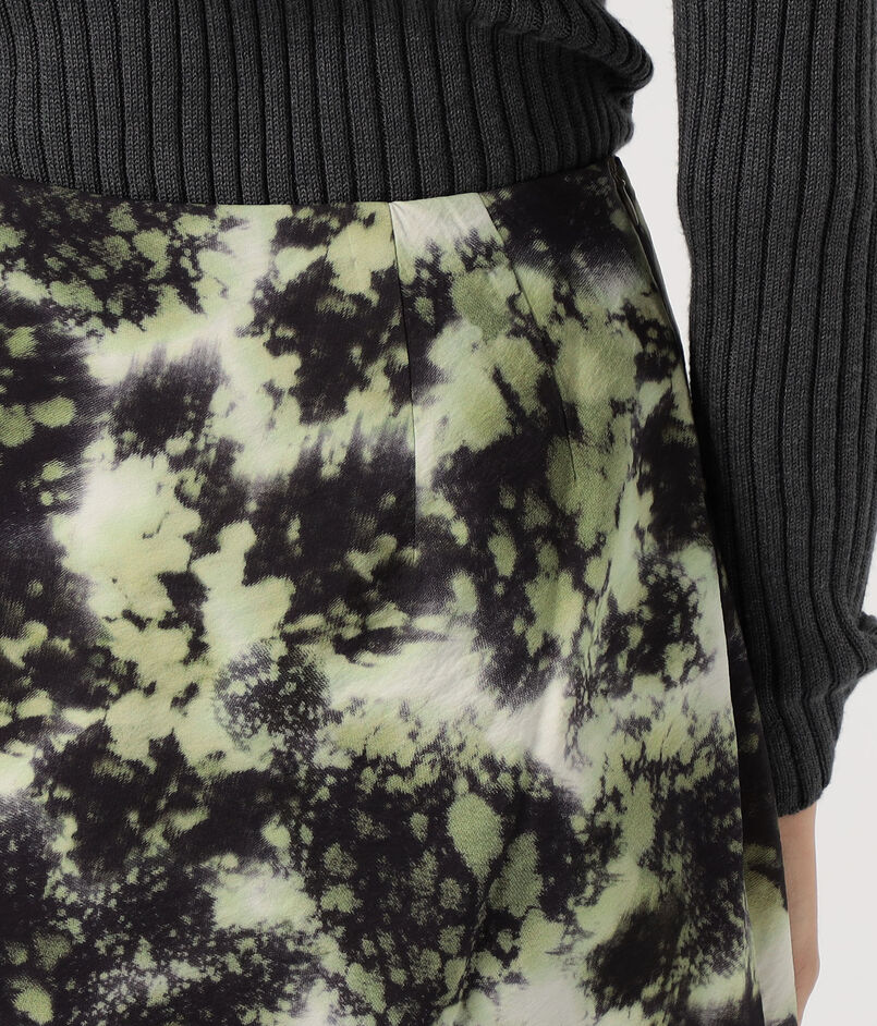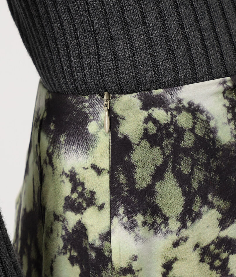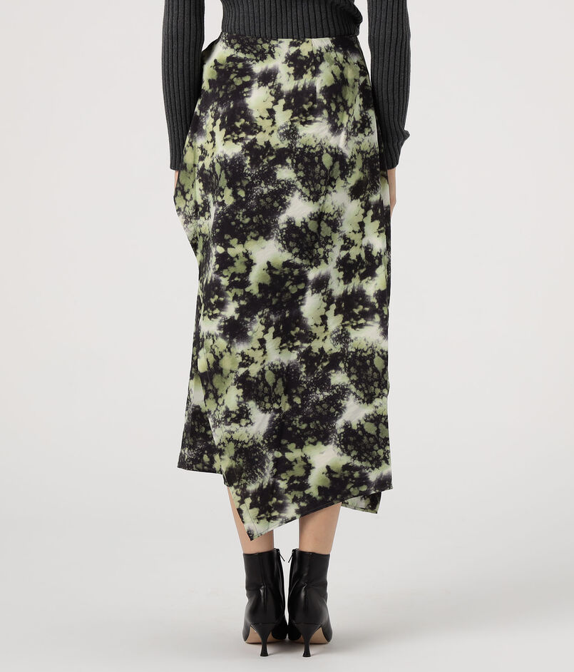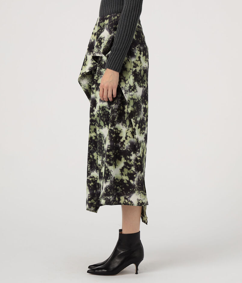 複数の布地を重ね合わせることで、裾が不規則になびく立体的なフォルムが特徴のスカート。
