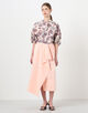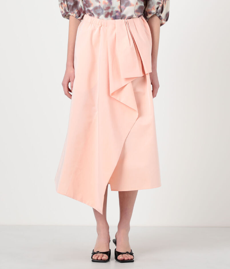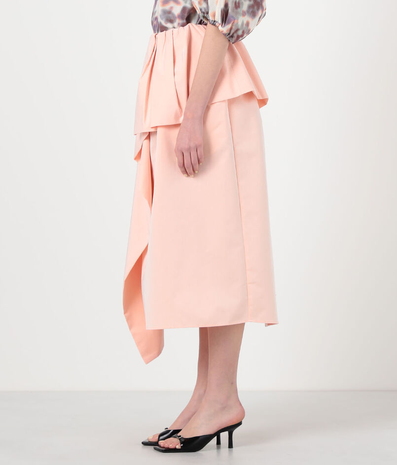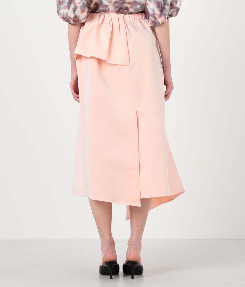 アシンメトリーな丈感が足元のバランスを選ばず、スタイリングに華やかさを添える一着。