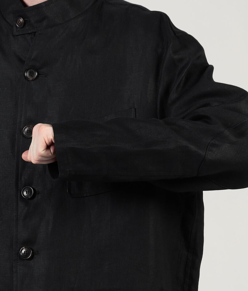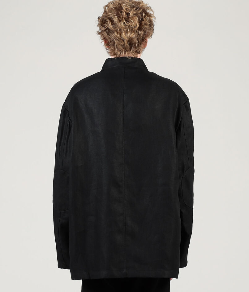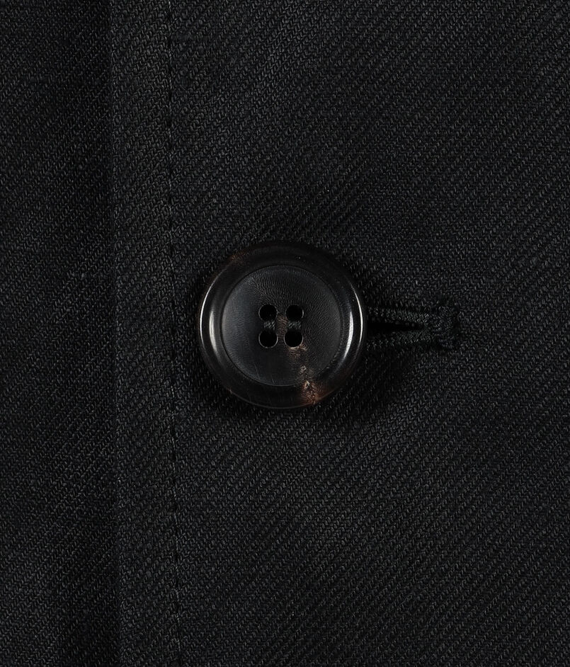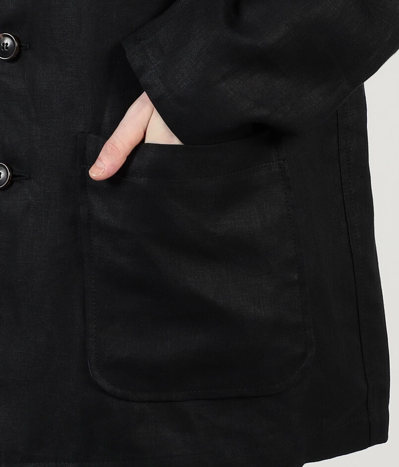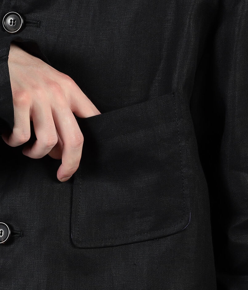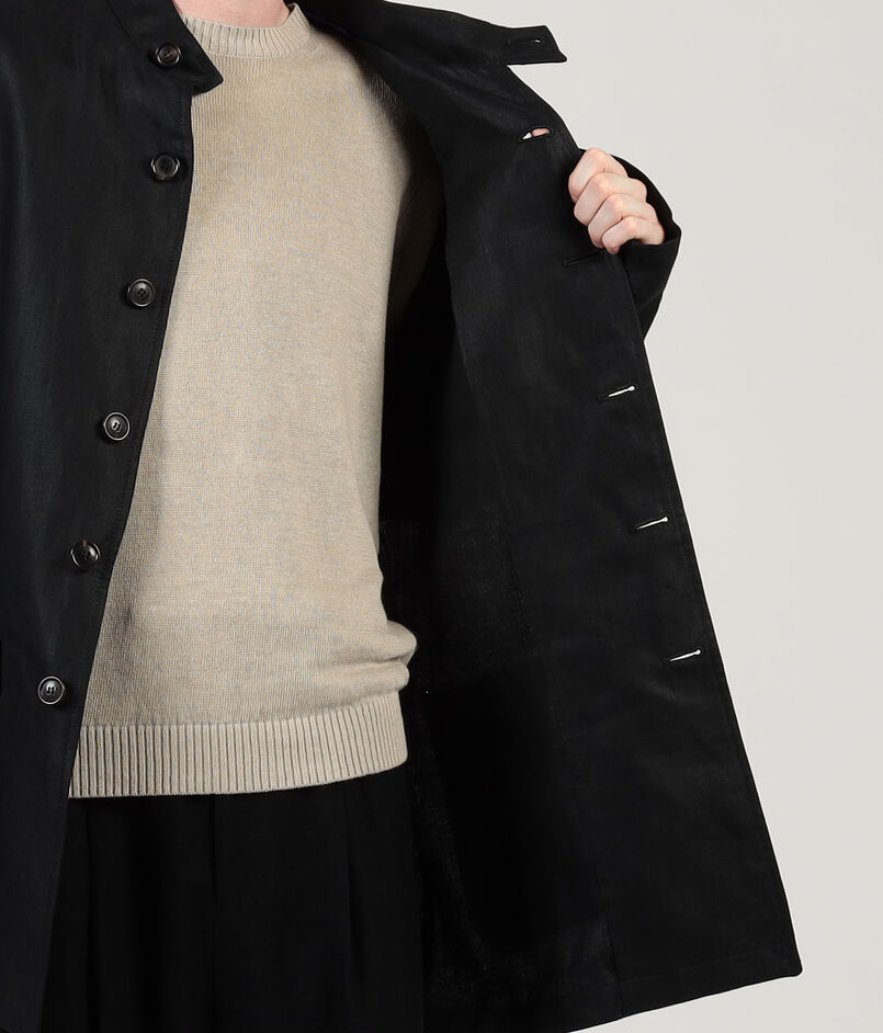 今回は、シックな黒のリネン素材を使用。リネン特有のハリと、着込むほどに増す柔らかな風合いが魅力です。サイズバランスやシルエット、副資材に至るまで細部にこだわり、モダンでタイムレスな一着に仕上げました。