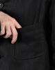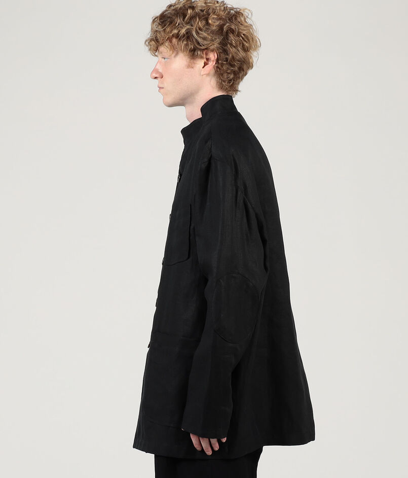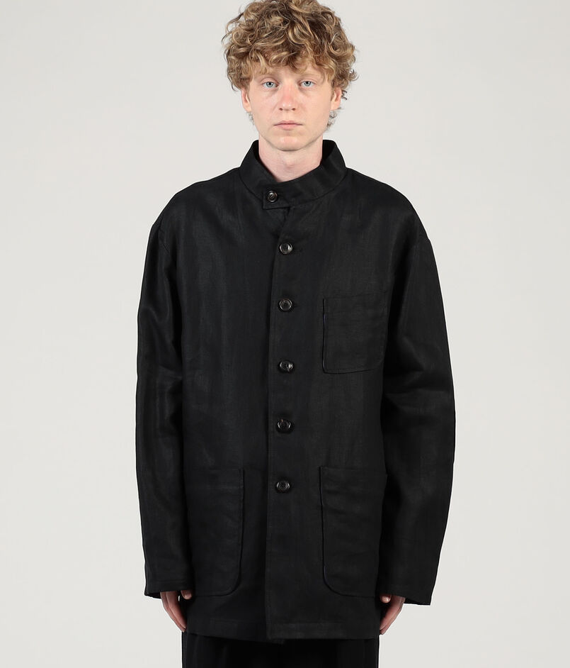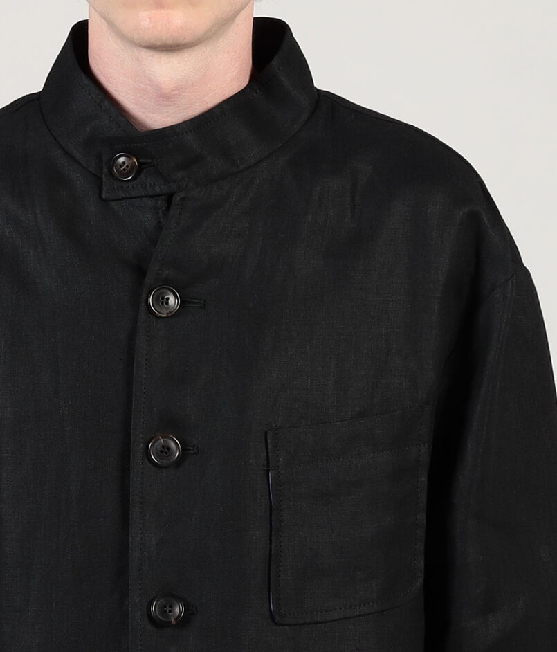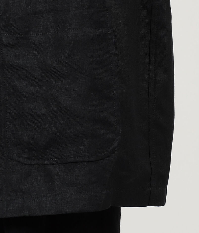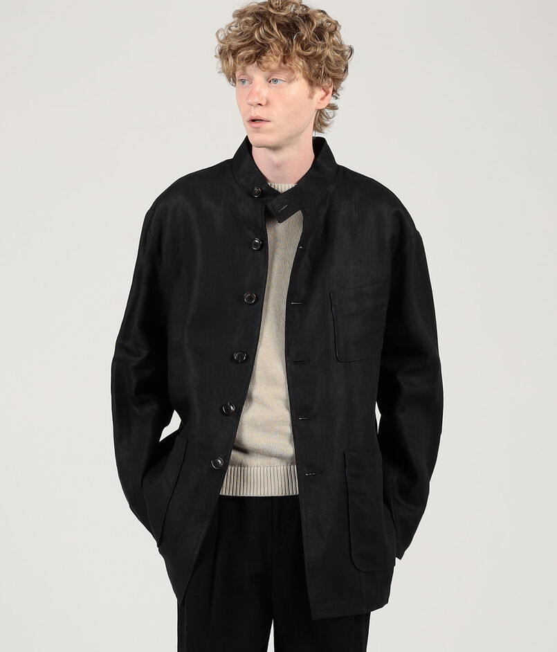今回は、シックな黒のリネン素材を使用。リネン特有のハリと、着込むほどに増す柔らかな風合いが魅力です。サイズバランスやシルエット、副資材に至るまで細部にこだわり、モダンでタイムレスな一着に仕上げました。
