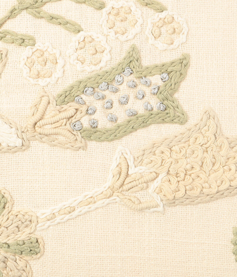 刺繍がほどこされたクッションやポーチは、様々な色味の色糸を用い、