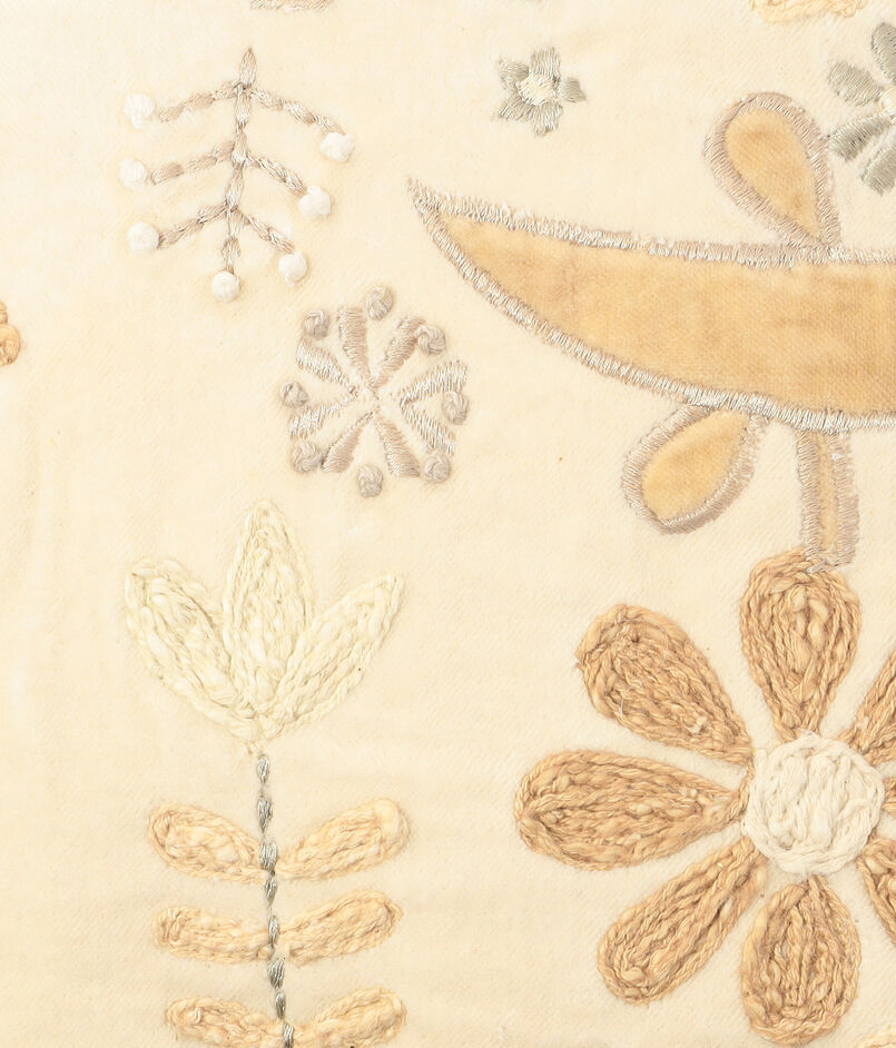 刺繍がほどこされたクッションやポーチは、様々な色味の色糸を用い、