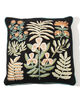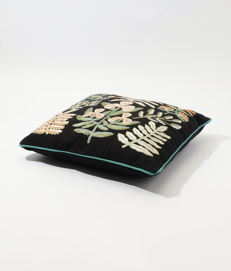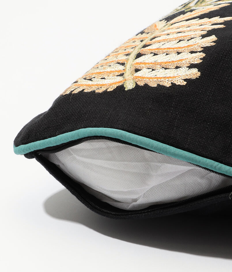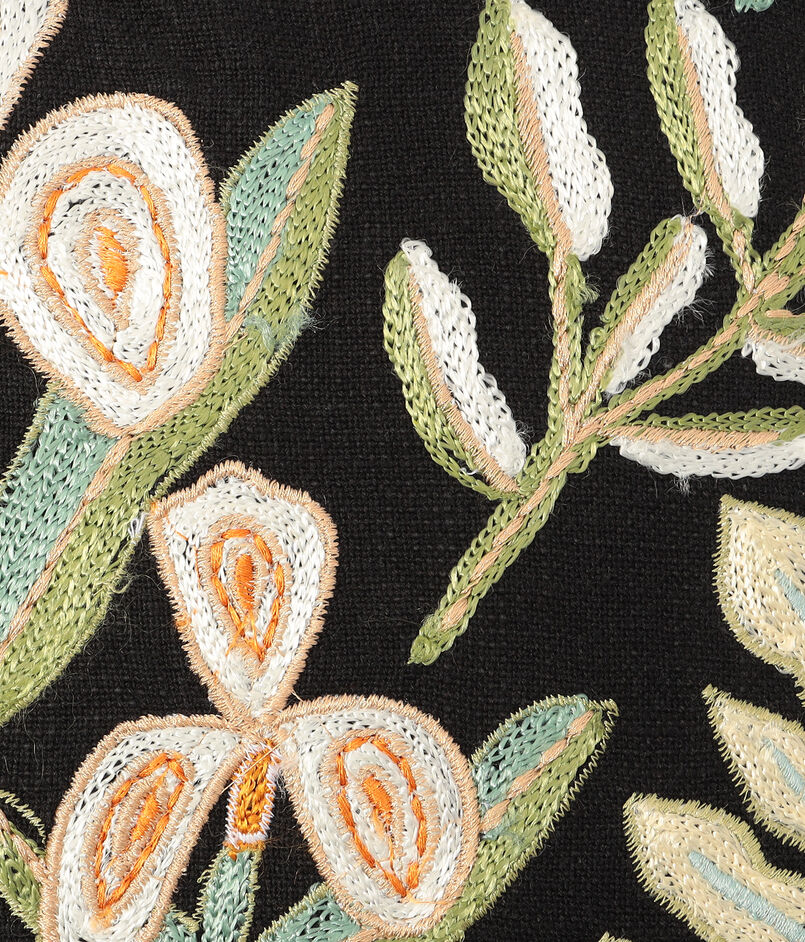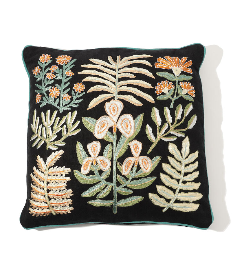 刺繍がほどこされたクッションやポーチは、様々な色味の色糸を用い、