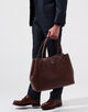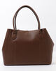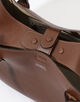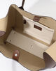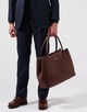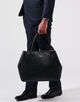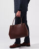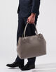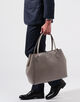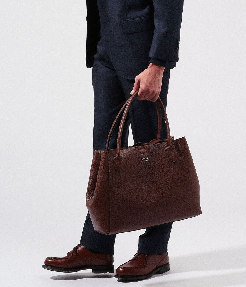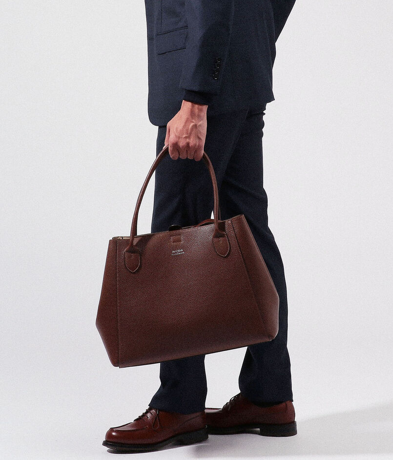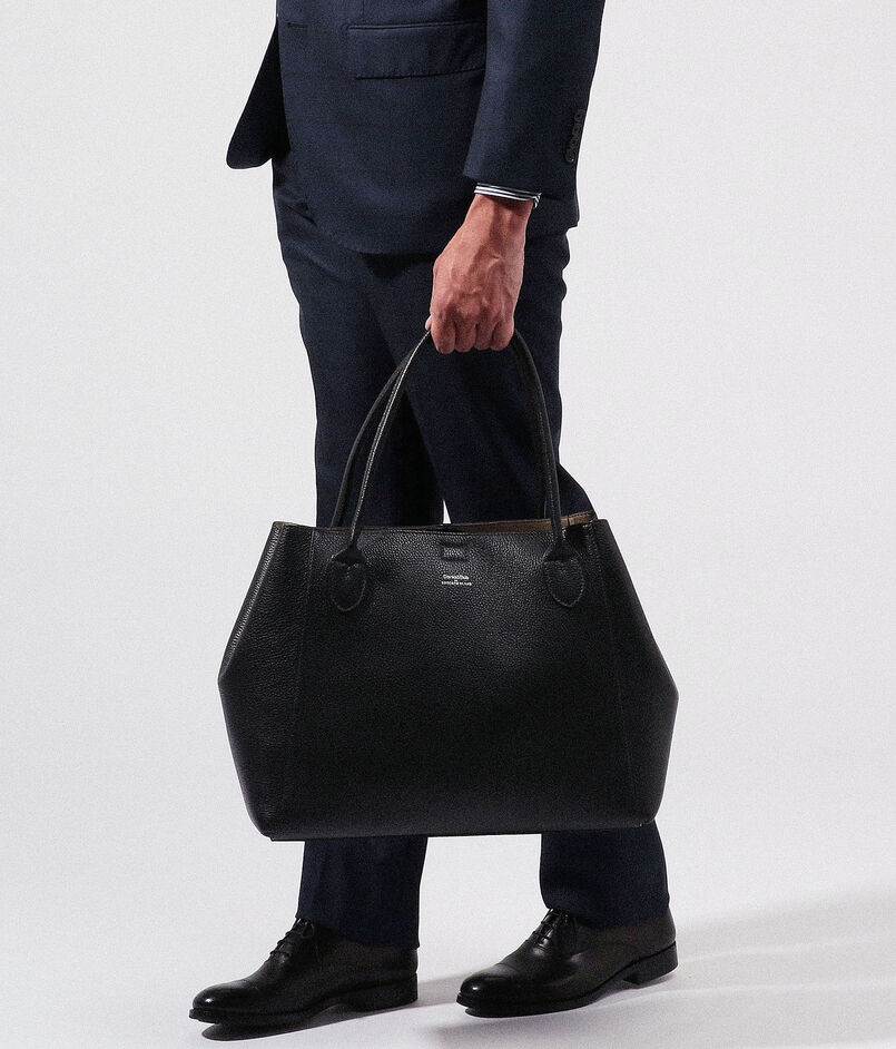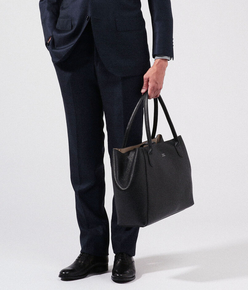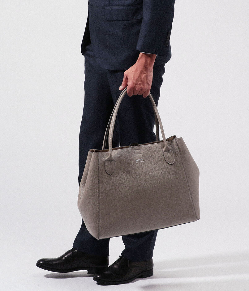 太めのストラップフラップ留め方により台形の中型トートから大きめのスクエアトートまで、段階的に形、容量を変えることができます。