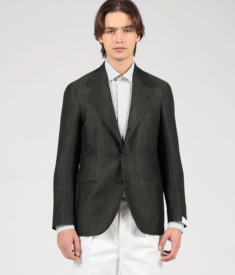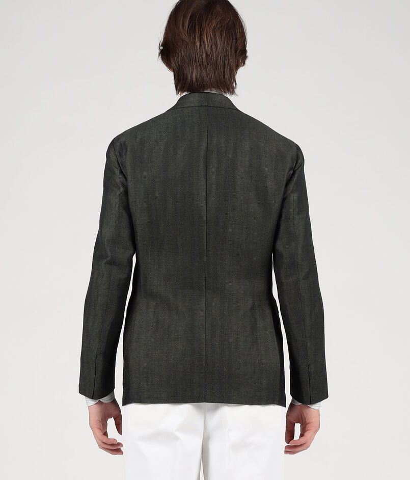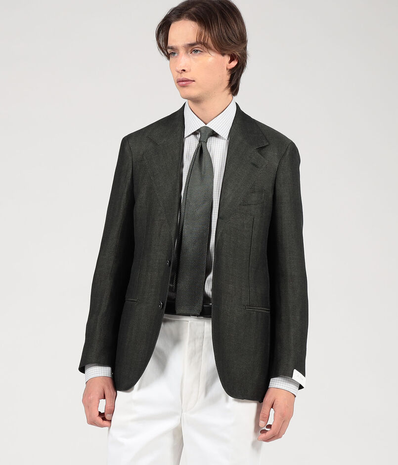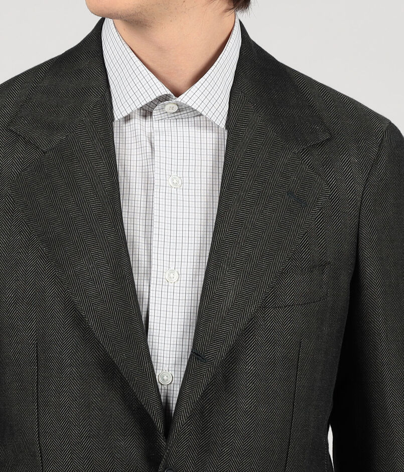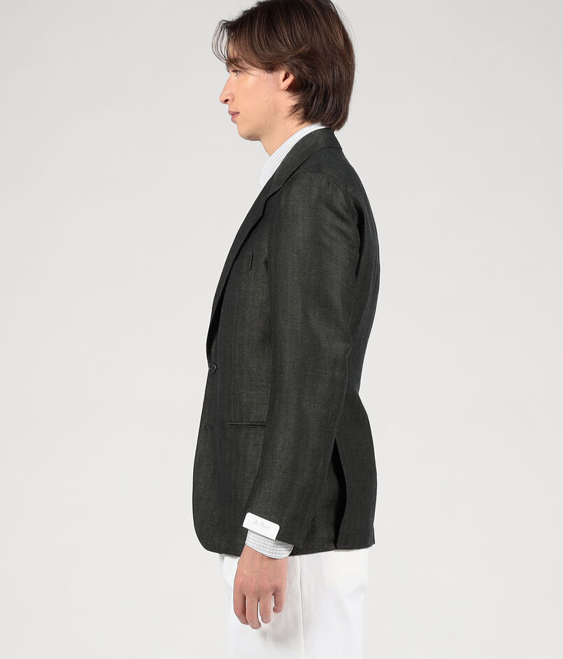 ナポリのファクトリーブランド〈De Petrillo〉によるハンドメイドを多く用いた軽い着心地、人体の曲線に馴染む丸みのある仕立てが特徴の別注ジャケット。