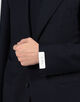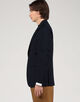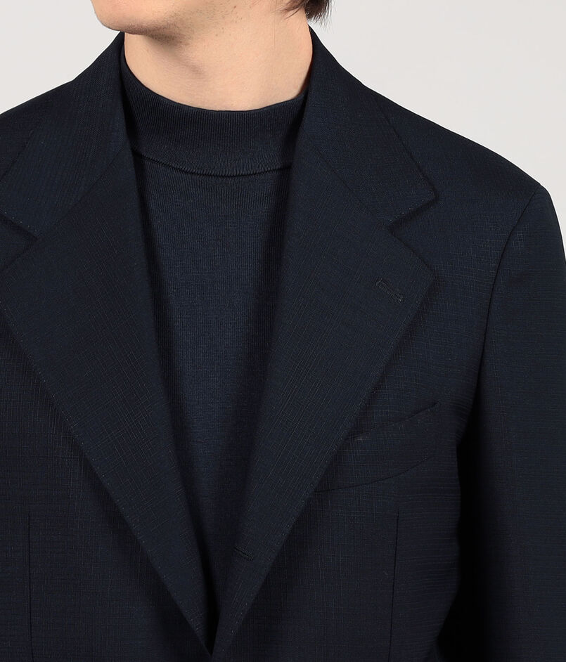 モデルは低め設定のゴージラインとフロントボタンのバランス、ワイドラペルを見事なバランスでクラシックの範疇でまとめたシングル3Bジャケット。丸みがあり、なで肩気味の肩回りがモダンな印象を与えます。