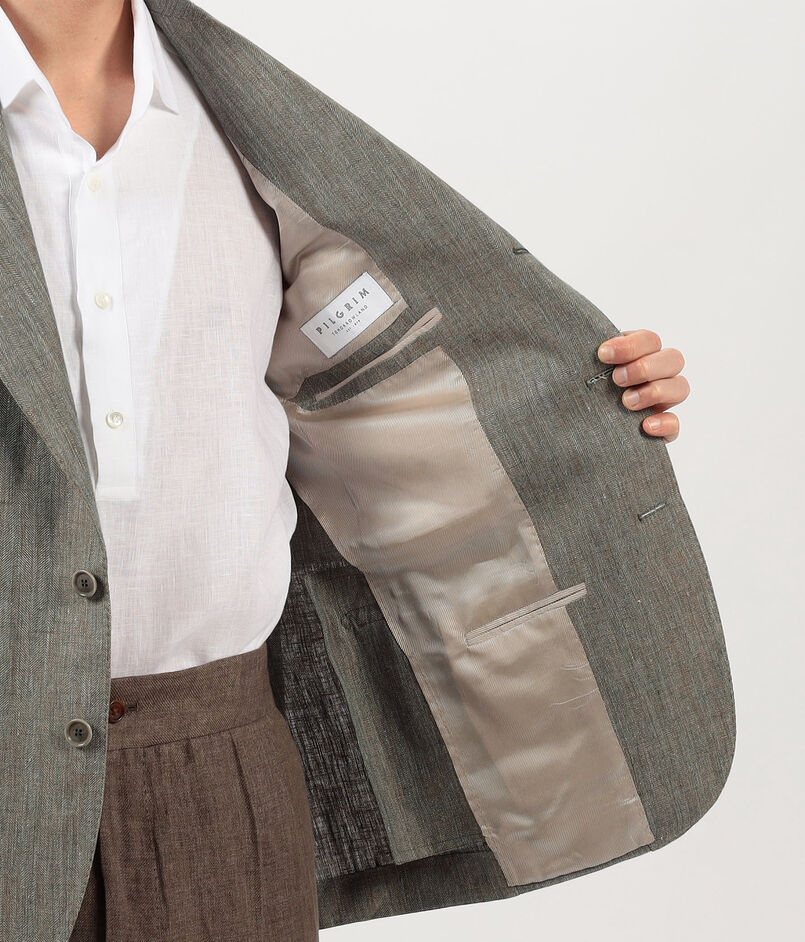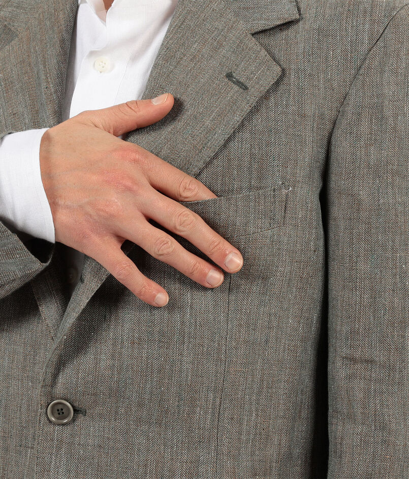 リネン100%のカーキ中心のメランジカラーが美しいヘリンボーン素材を使用しました。