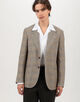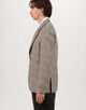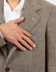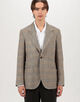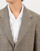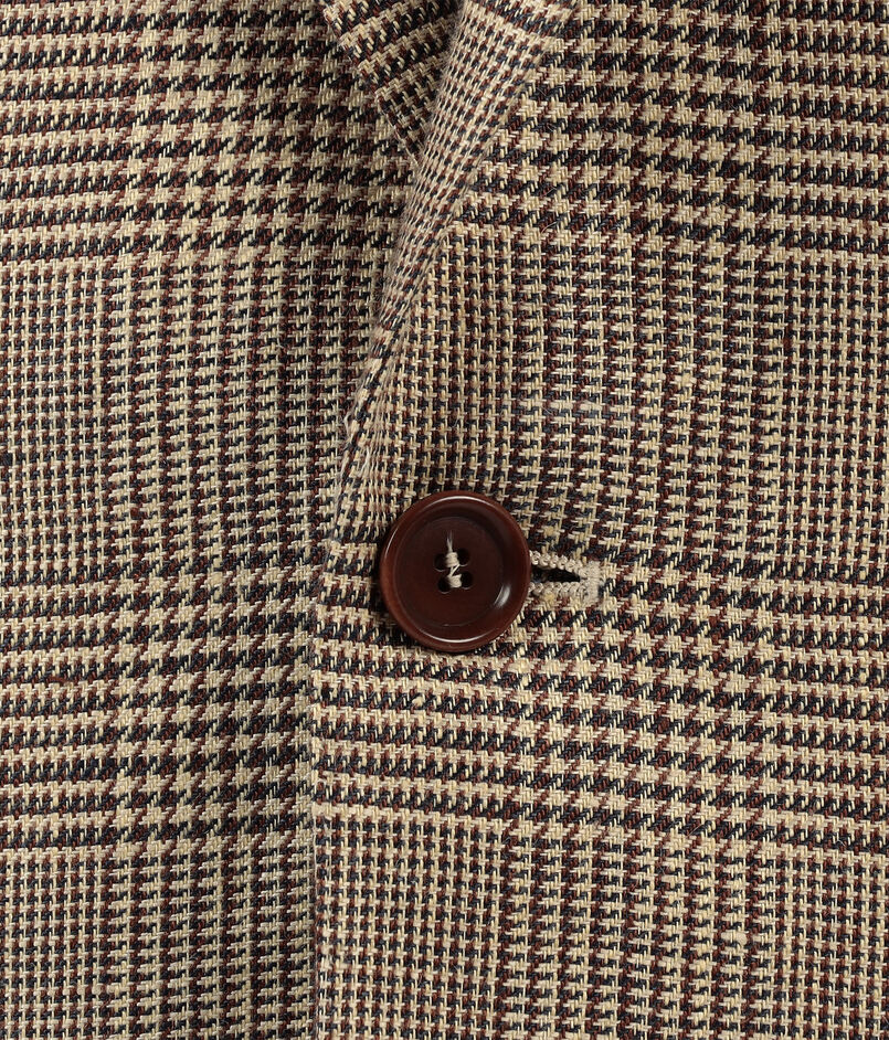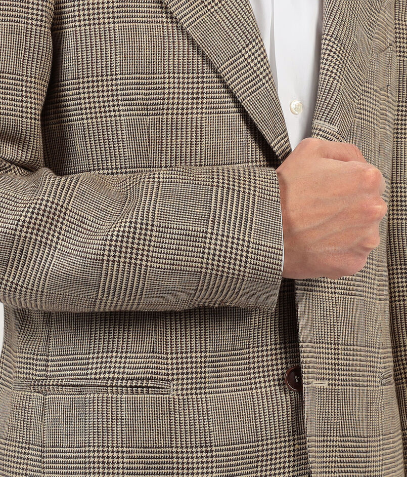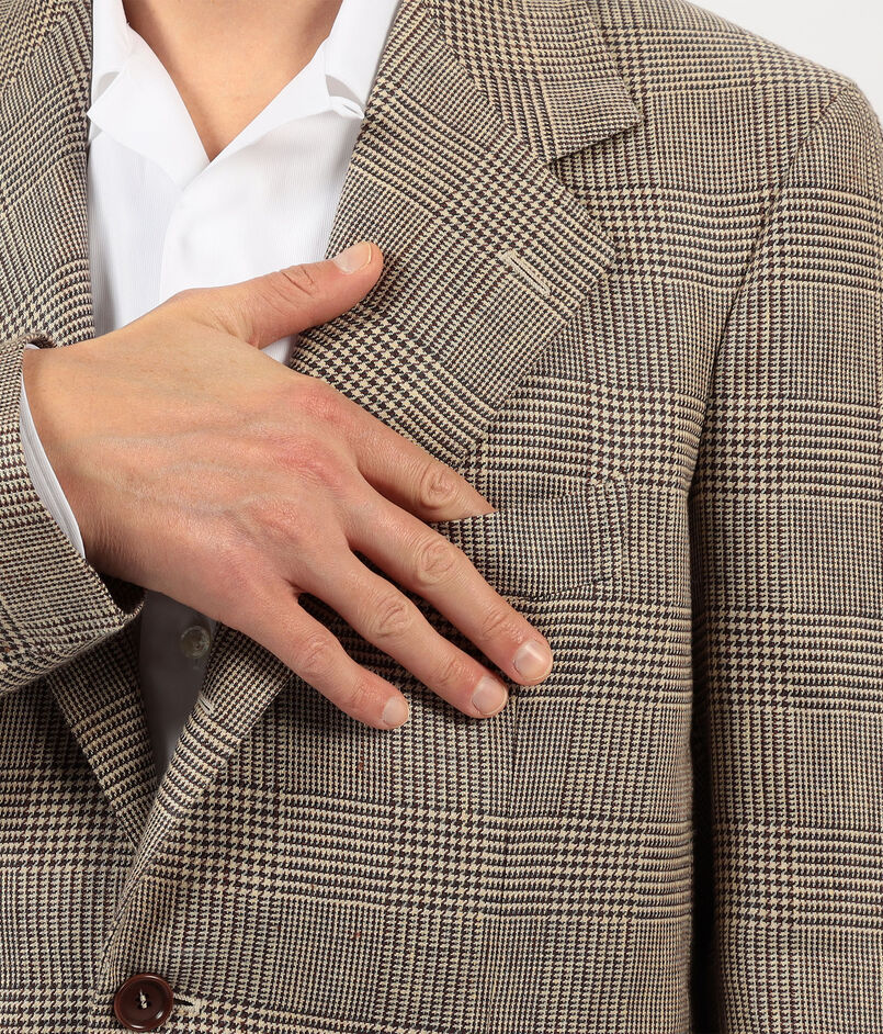 モデルは低め設定のゴージラインとフロントボタンのバランス、ワイドラペルを見事なバランスでクラシックの範疇でまとめたシングル3Bジャケット。