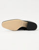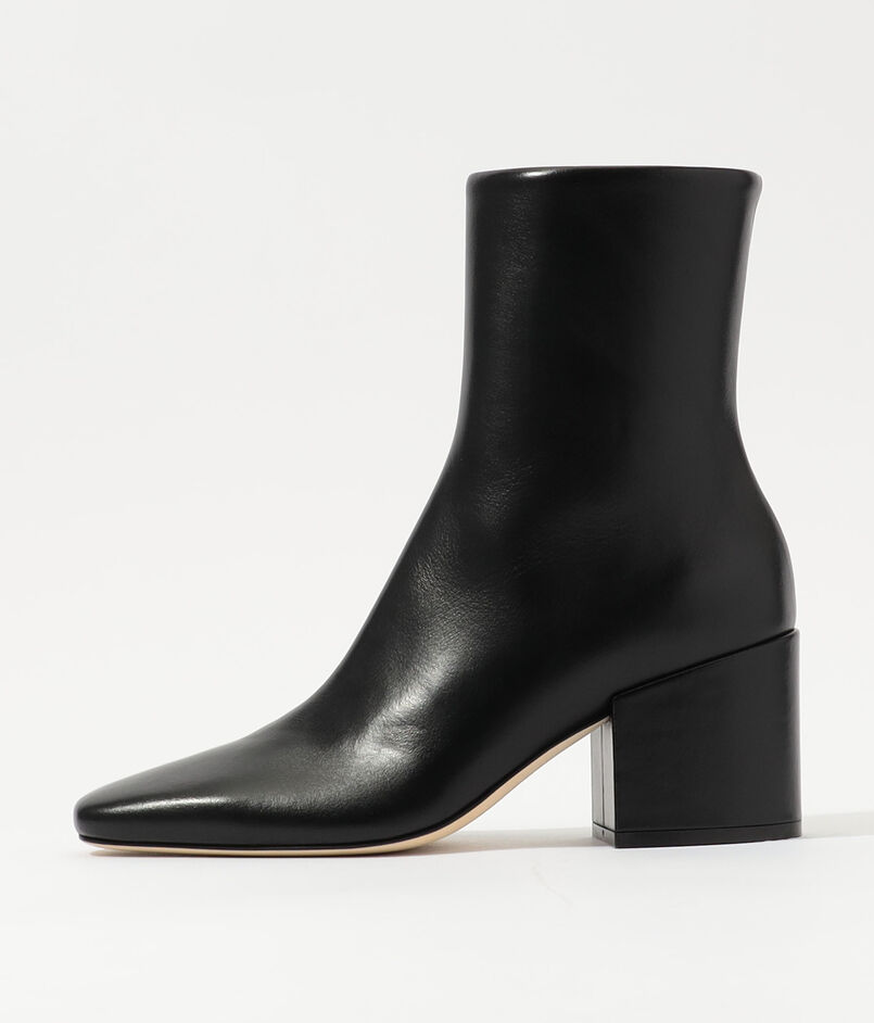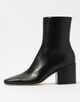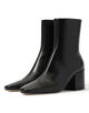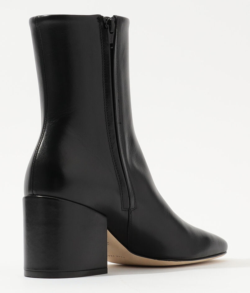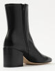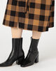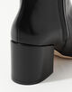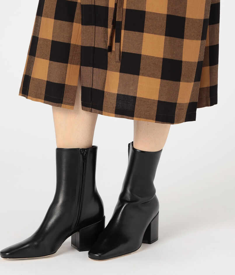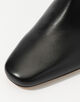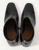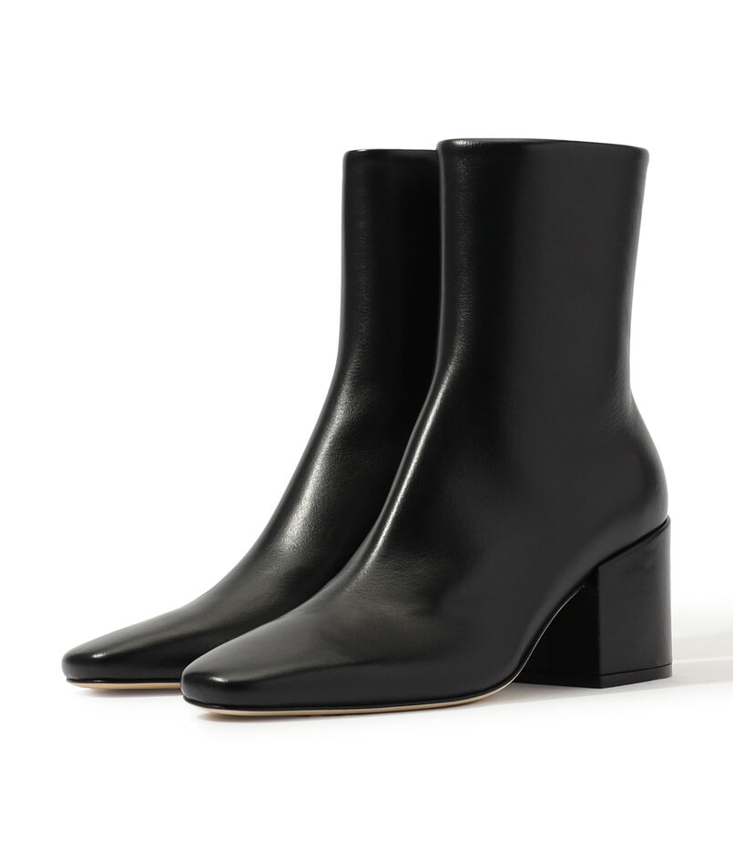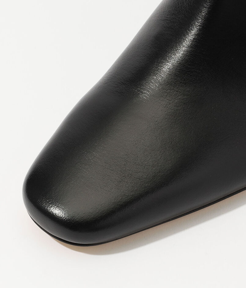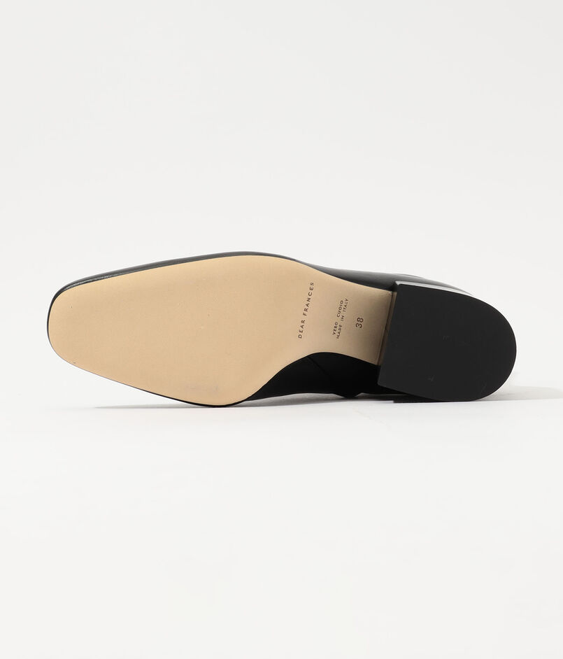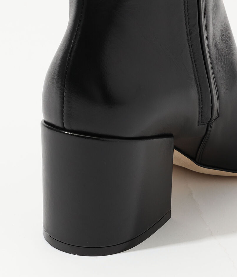 ブラックのカーフレザーを使用し、エレガントで包み込むような履き心地が特徴です。長めのアーモンドトゥとスタックブロックヒールが洗練された印象に。