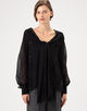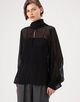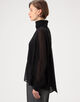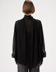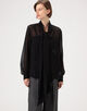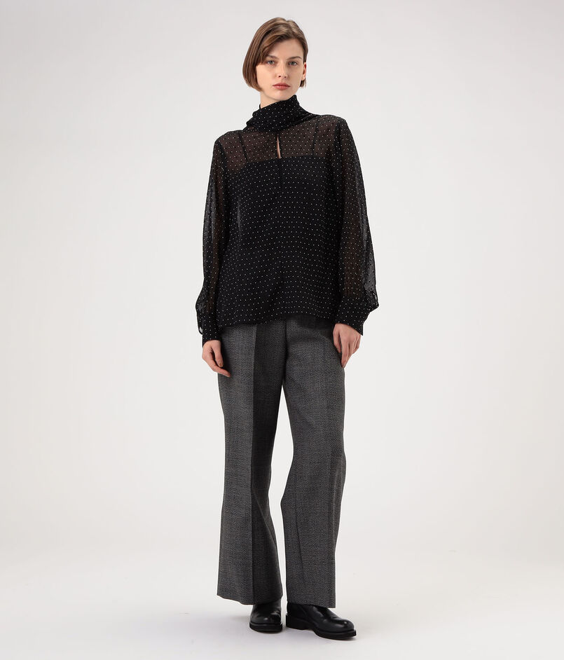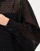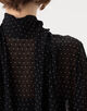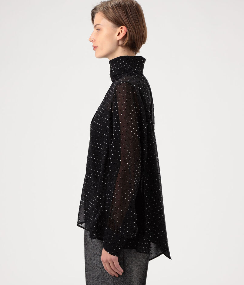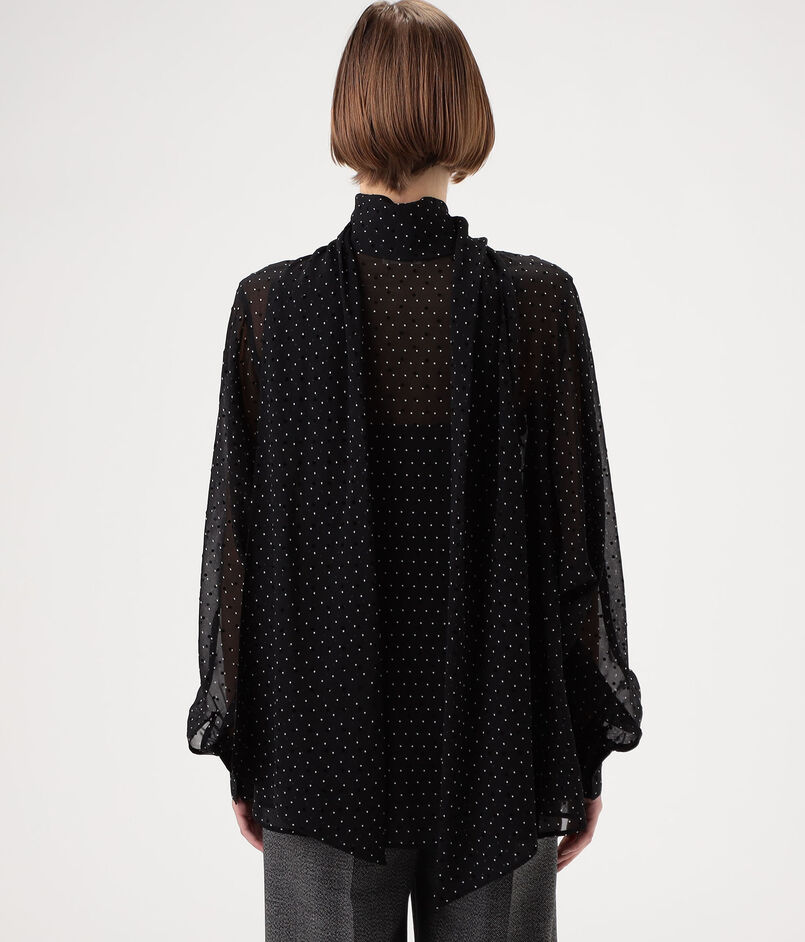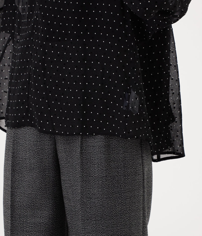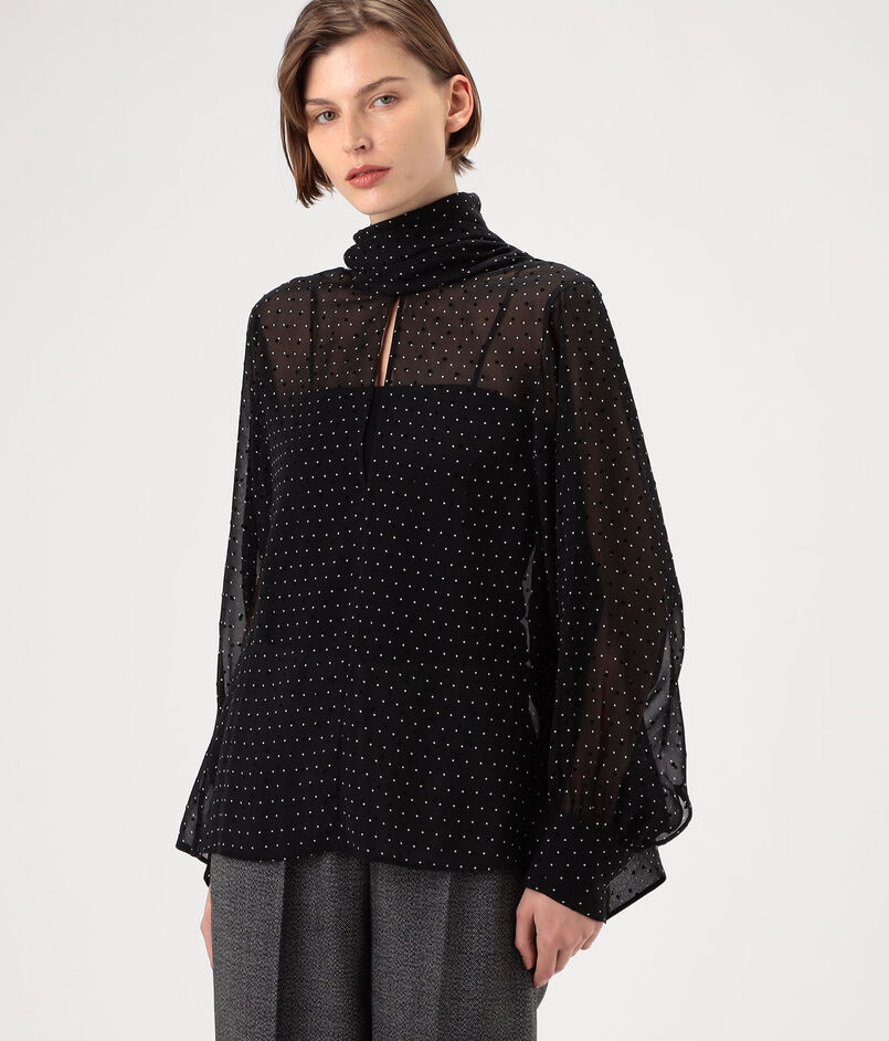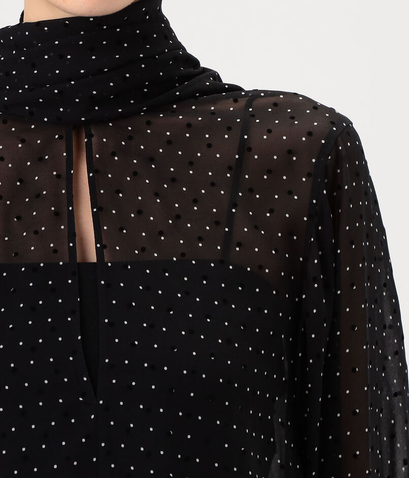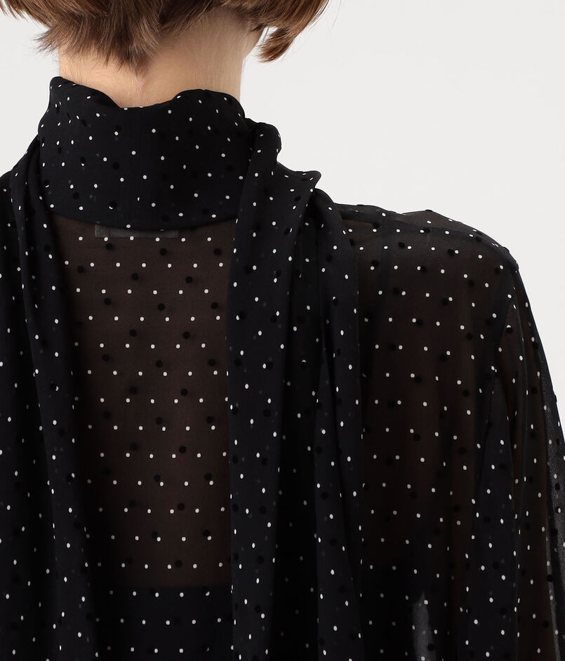 薄手のシルク素材にドットプリントを施し、さらにドットのフロッキープリントを重ねて仕上げたブラウス。