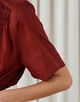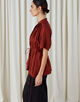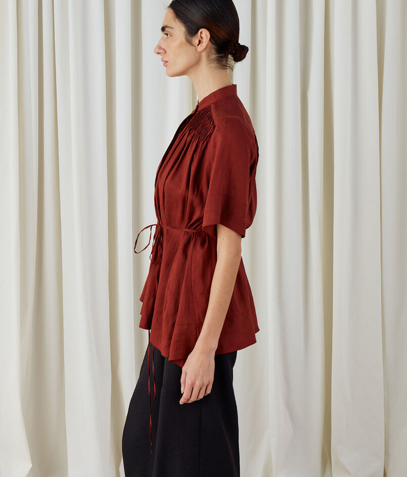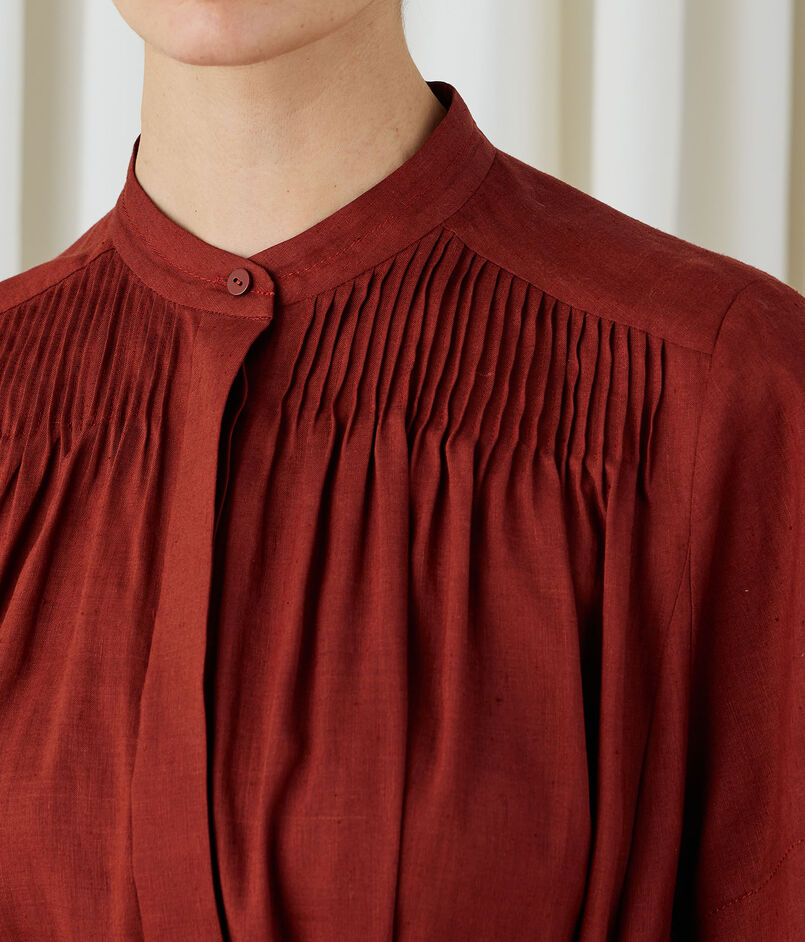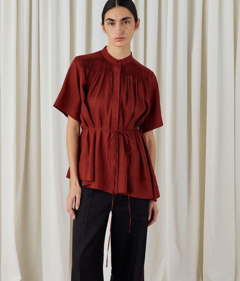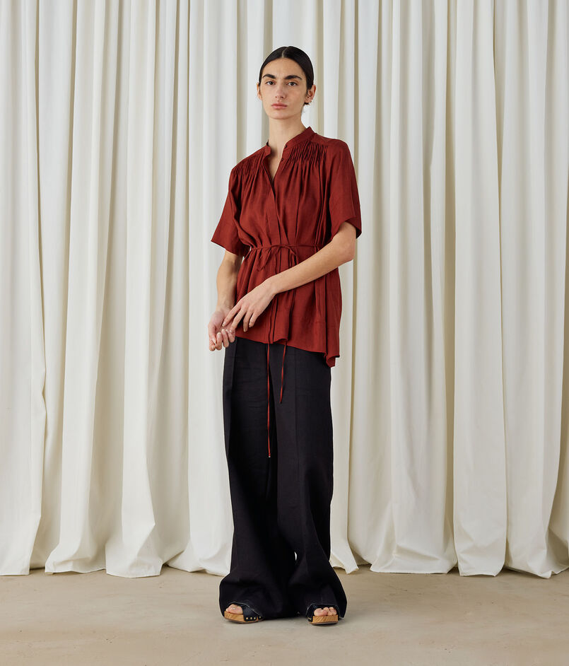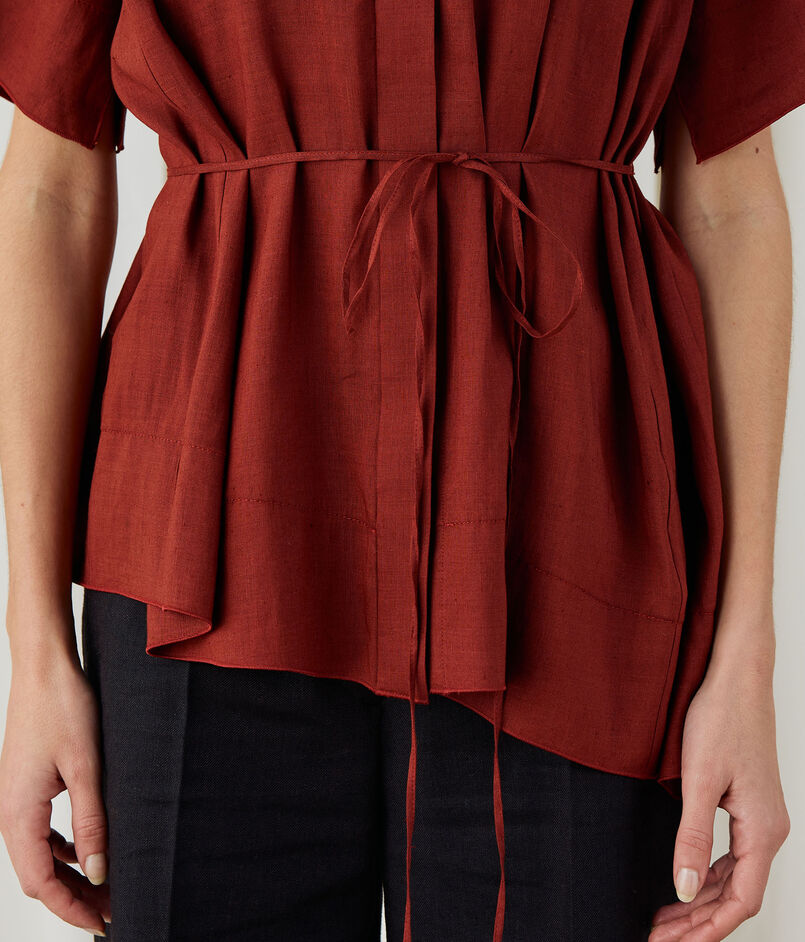 リネンをベースにラミーとシルクを混紡した糸で織り上げた、上品なツヤとハリ感が魅力のブラウスシリーズ。