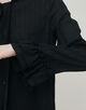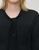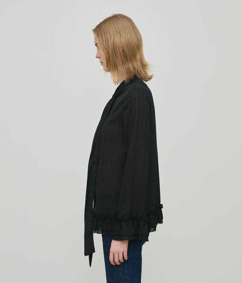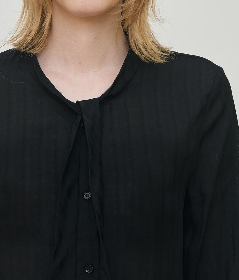 襟元のボウタイはリボン結びにするだけでなく、一掛けしてラフに垂らしたり片結びするなど、お好みでさまざまなアレンジをお楽しみいただけるアイテムです。