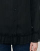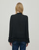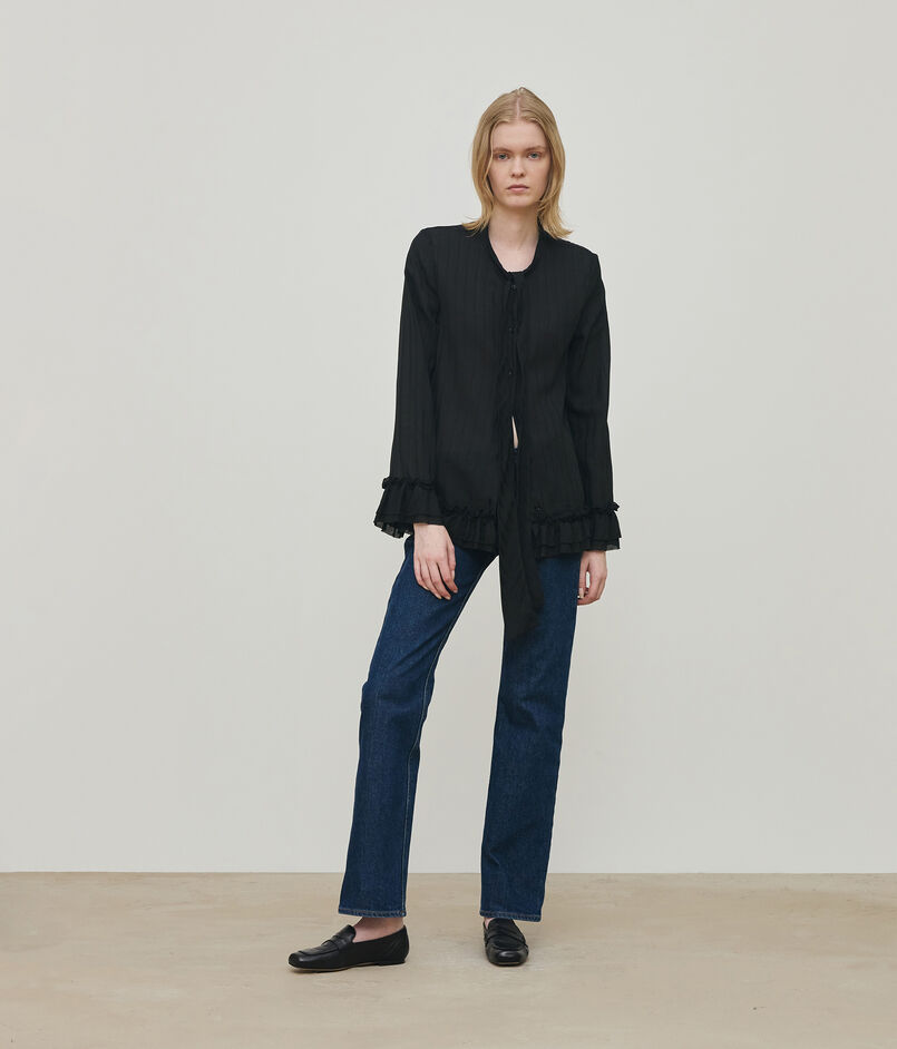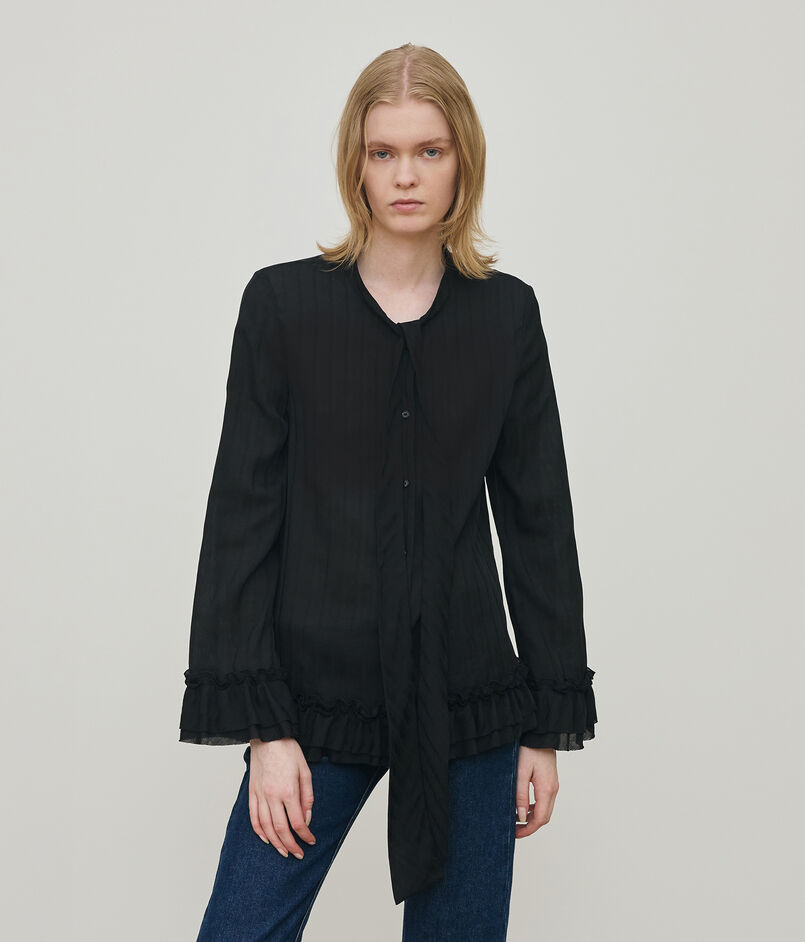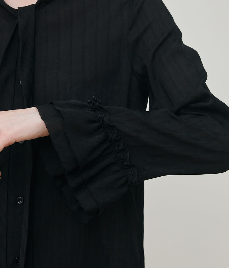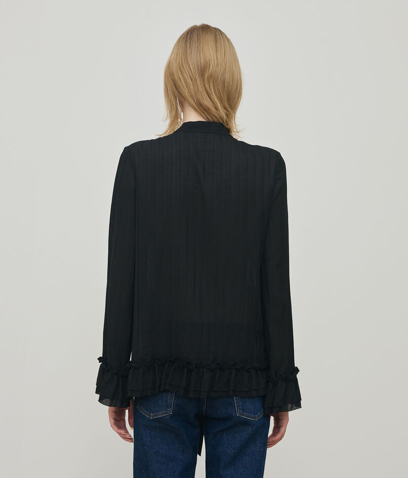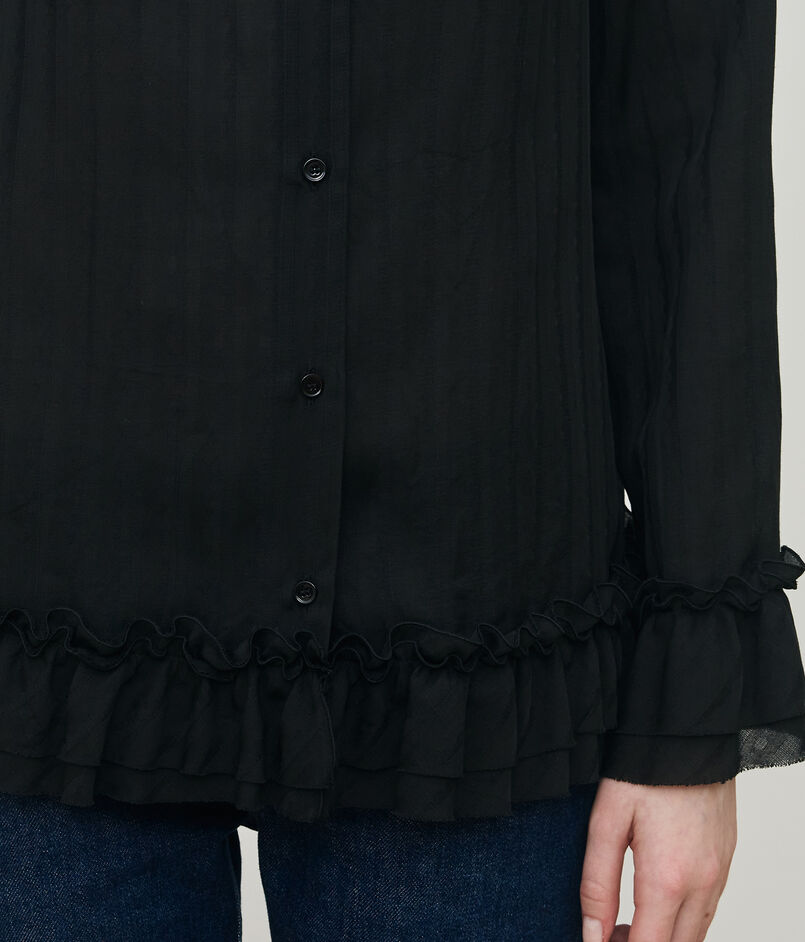 裾と袖口にフリルをあしらったフェミニンなデザインの一枚。