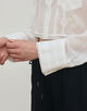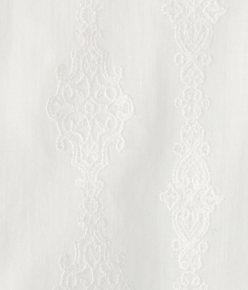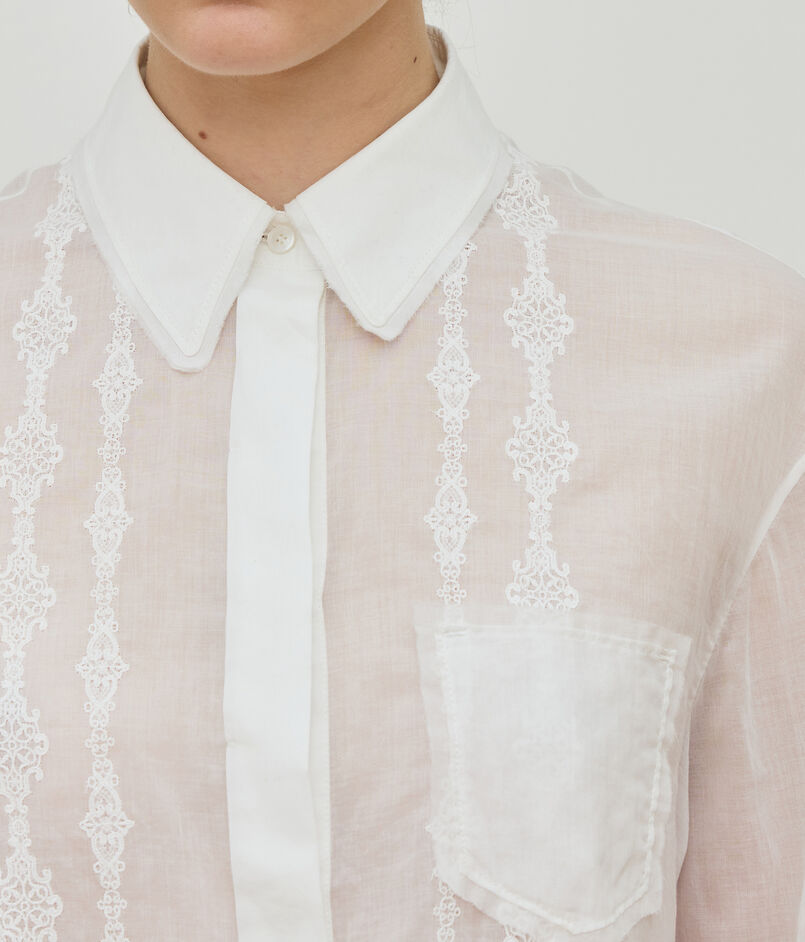 極細番手のコットンの糸で織られたハイカウント高密度ローン素材に、〈DES PRES〉別注レースをパネルストライプ状に刺繍しています。