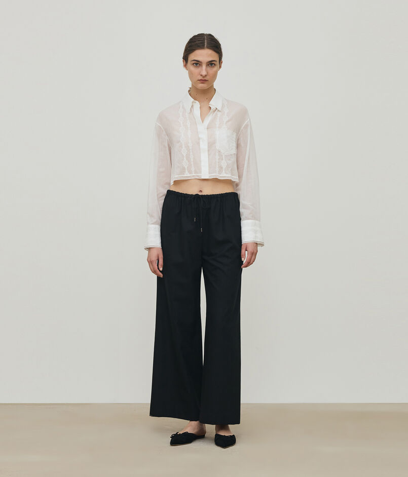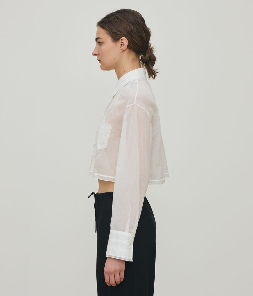 クロップドシャツはドロップショルダーのリラックス感とクールさを兼ねそろえたシルエット。
