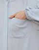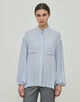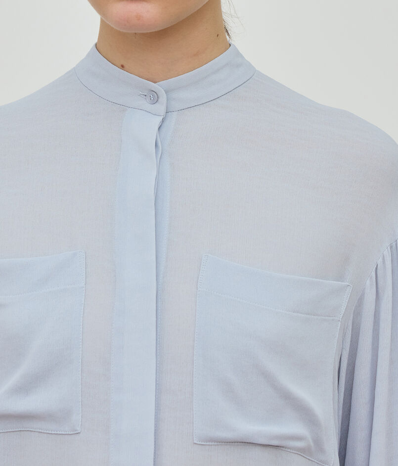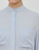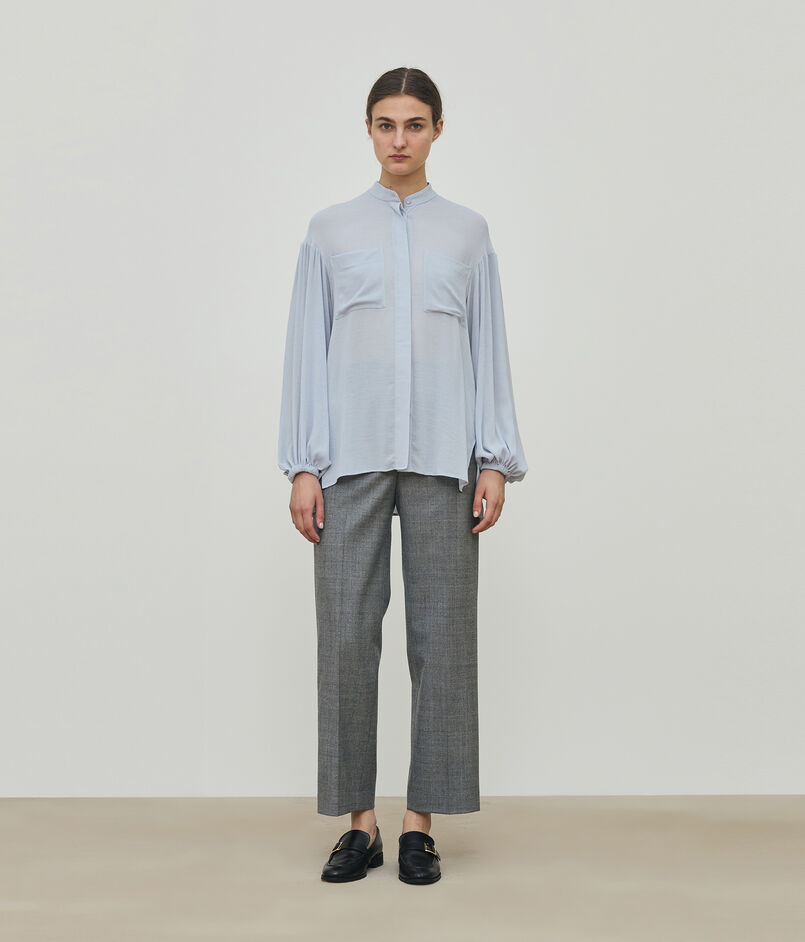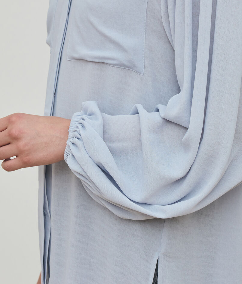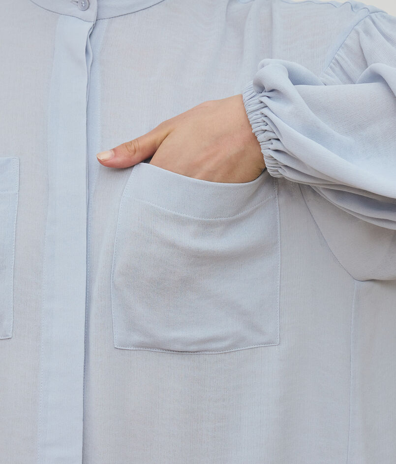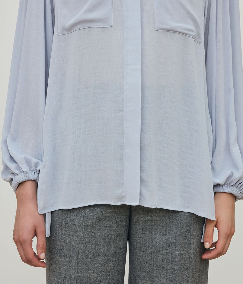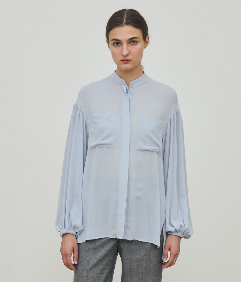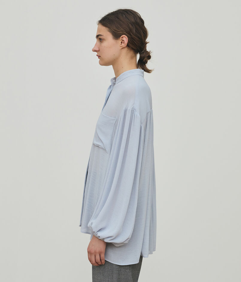 常温可染カチオン糸を使用しクレープ組織に織り上げた、繊細な透け感とほど良いぬくもりのある素材が特徴のブラウスシリーズ。
