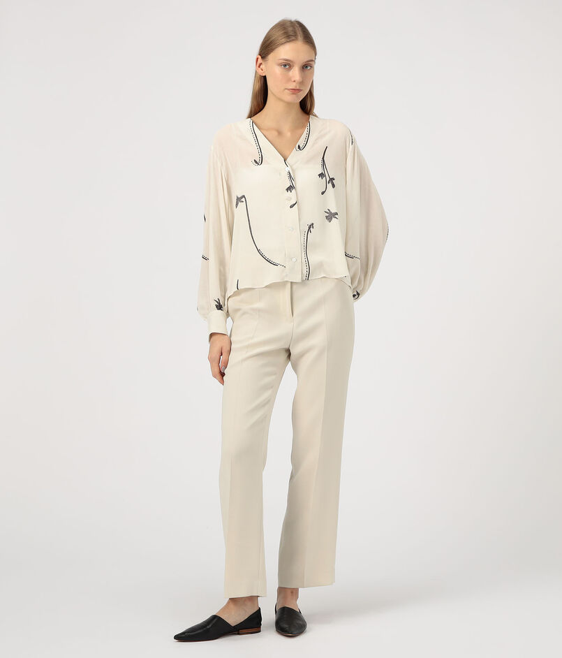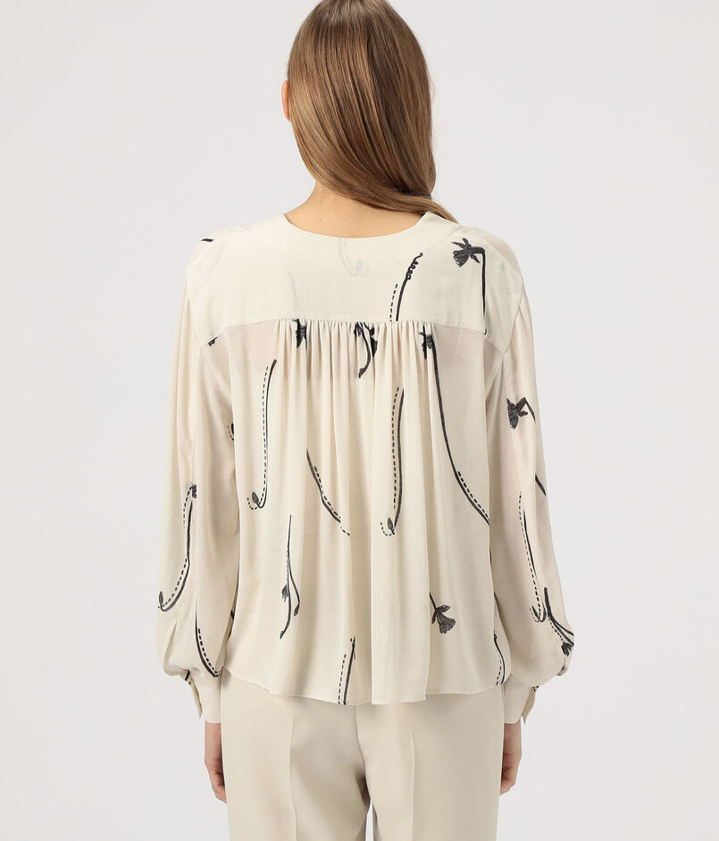 ブラウスは後ろに向かって長くなる裾のラインでどの角度から見ても美しい一枚。