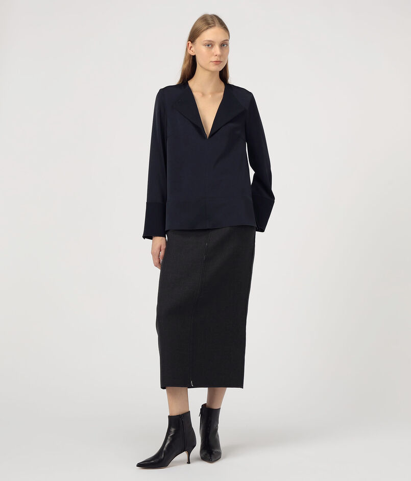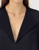 フロントの開け閉めで表情を変えられるブラウスは、ジャケットのラペルからインスパイヤされた一着。