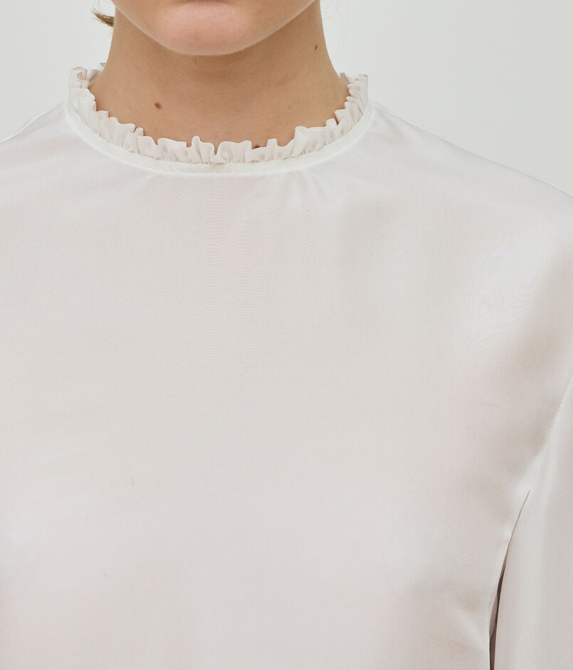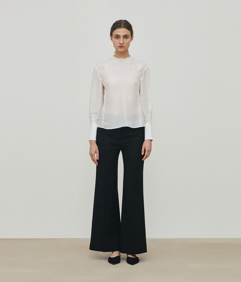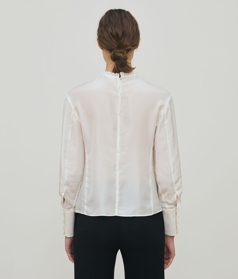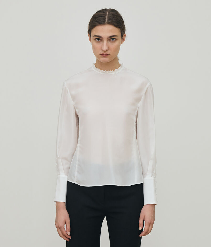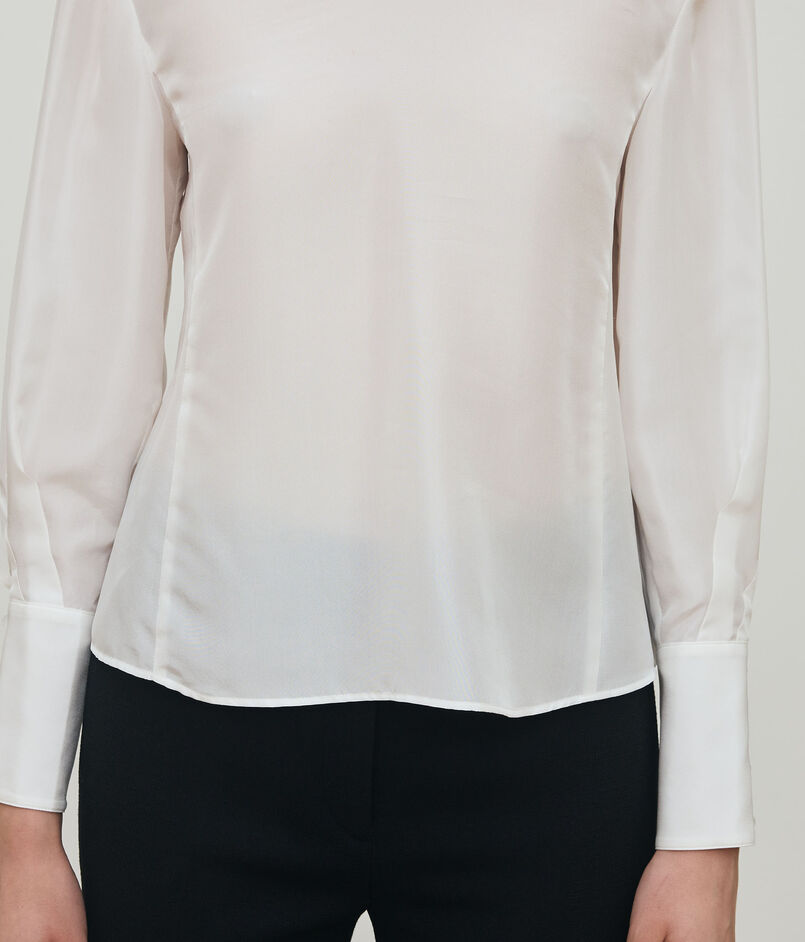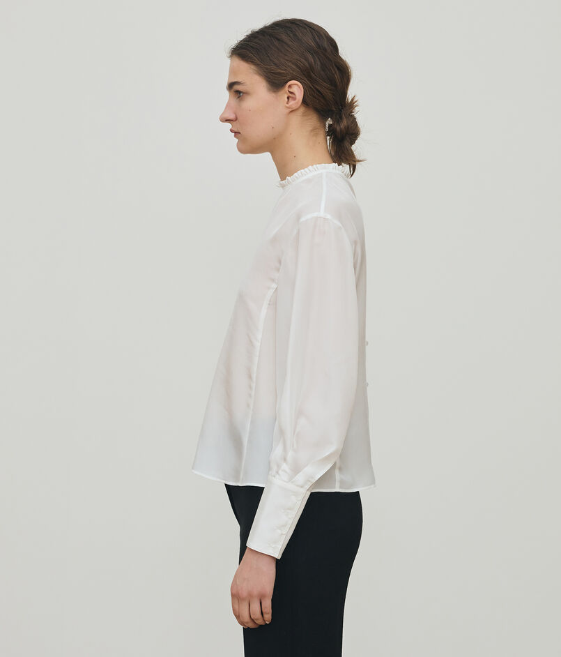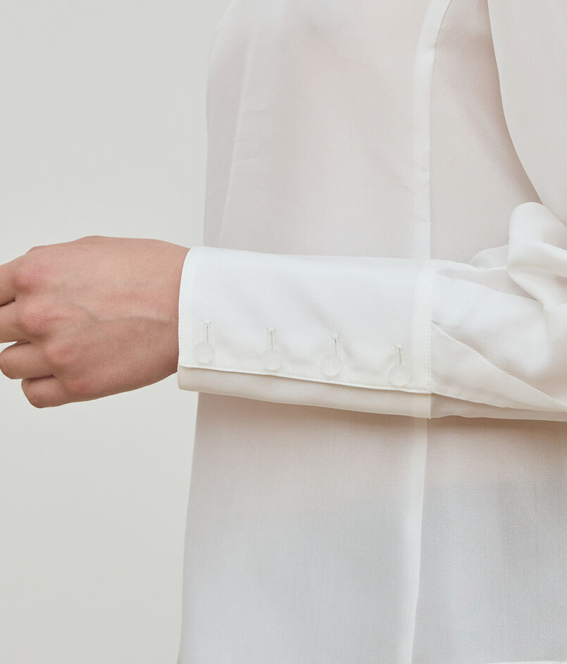 シルクならではの透明感と特有のハリのあるシルクハブタエ素材を使用したブラウス。