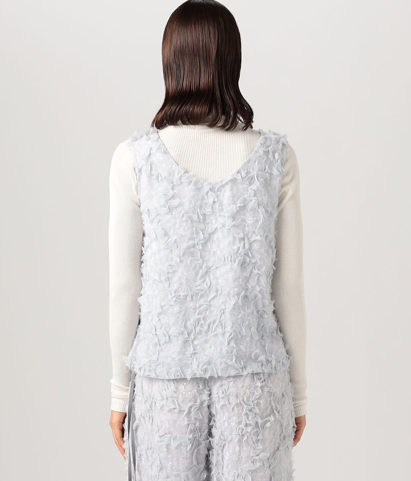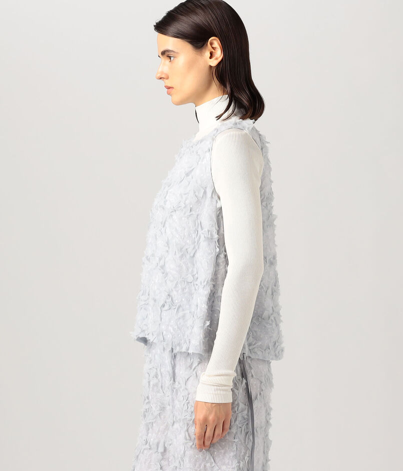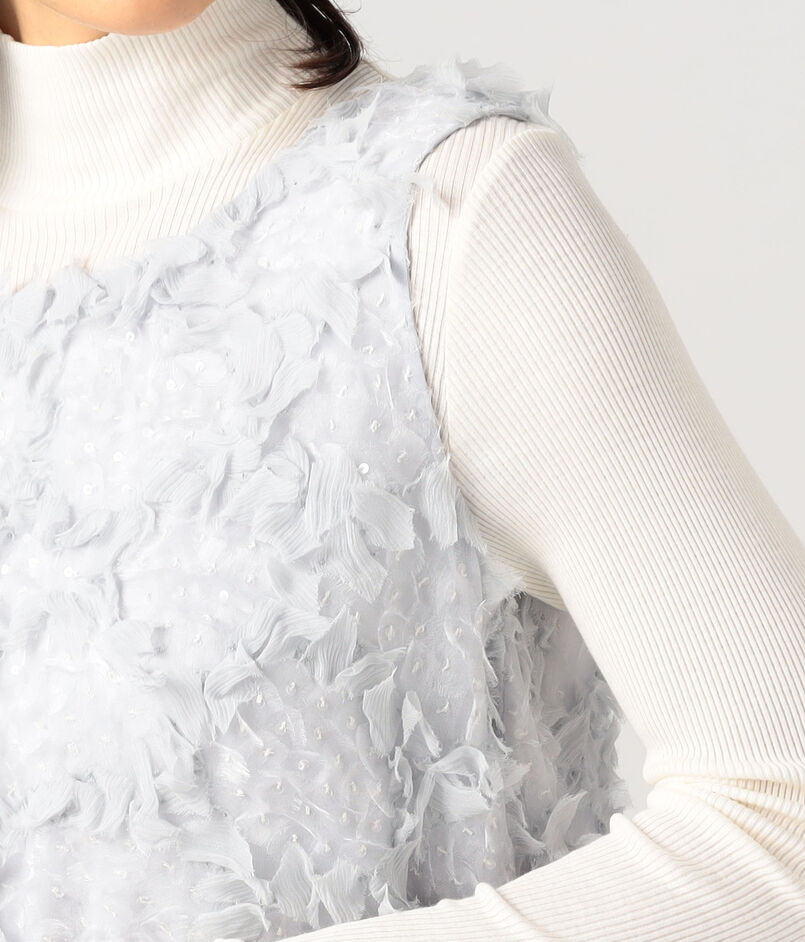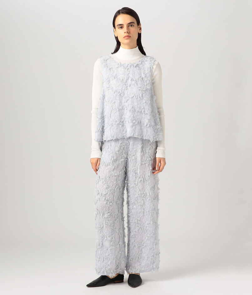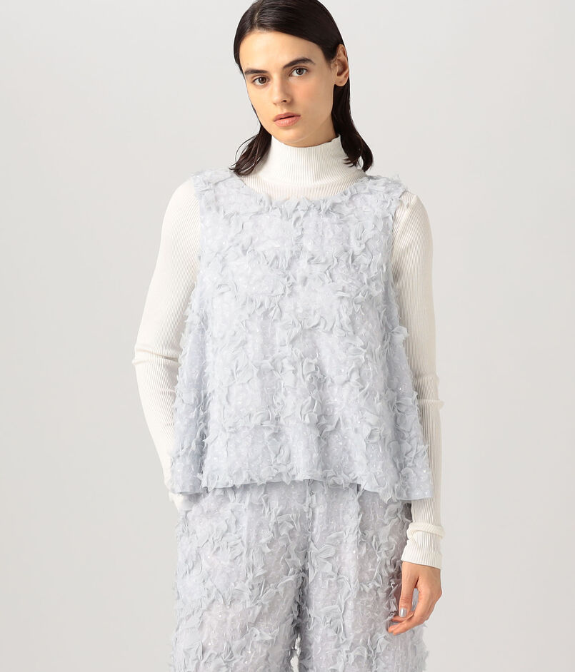 シルクシフォンのベースの上にシルク楊柳×オーガンジー×スパンコールで刺繍を施し立体感のある素材に仕上げています。